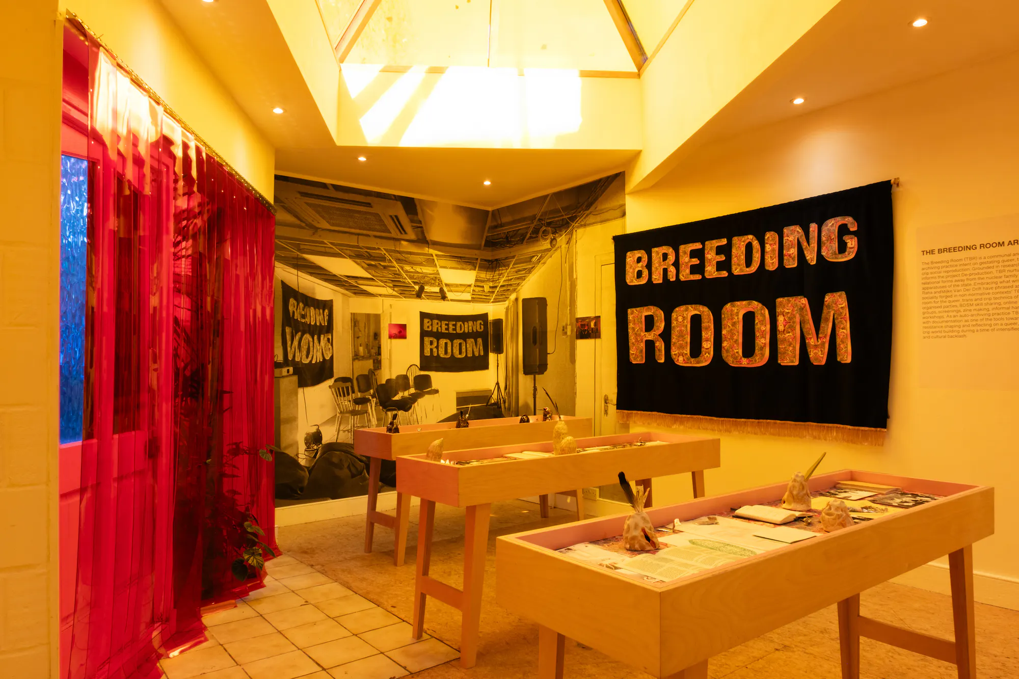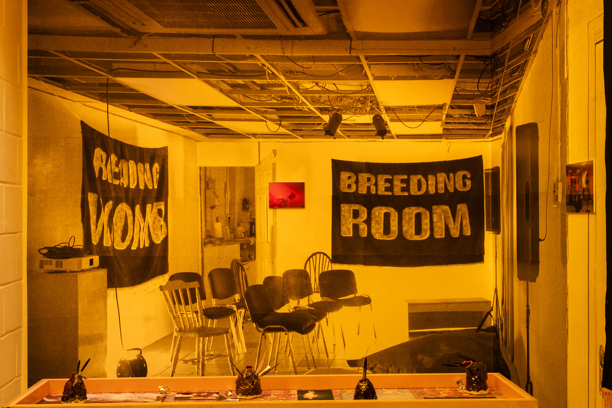 Wolf’s De-production created an installation running through a succession of spaces in Flat Time House, dramatically transforming its interiors through sculptural and textual interventions. Playing upon the narrative and spatial tropes of popular Science Fiction, De-production has grown into an ongoing project for Wolf, tracing states of transition through what he describes as ‘an intentional re-patterning of reproductive logics’. Themes drawn from close readings of Ridley Scott’s Alien motion picture and subsequent sequels from 1979 to 1997 are a dominant aspect explored – monstrous motherhood, alienated embodiments and transitional states. Moving through the spaces of FTHo Wolf offered spatial inflections that hold the body awash with colour, enclosed by temporal thresholds, drenched in sound and seduced by ephemera. In this context, Wolf developed and is maintaining an archive, The Breeding Room, acting as a counter to traditional institutional intentions and structures, to instead accommodate artistic production, personal archiving and exchange of ideas and a practice of gathering.