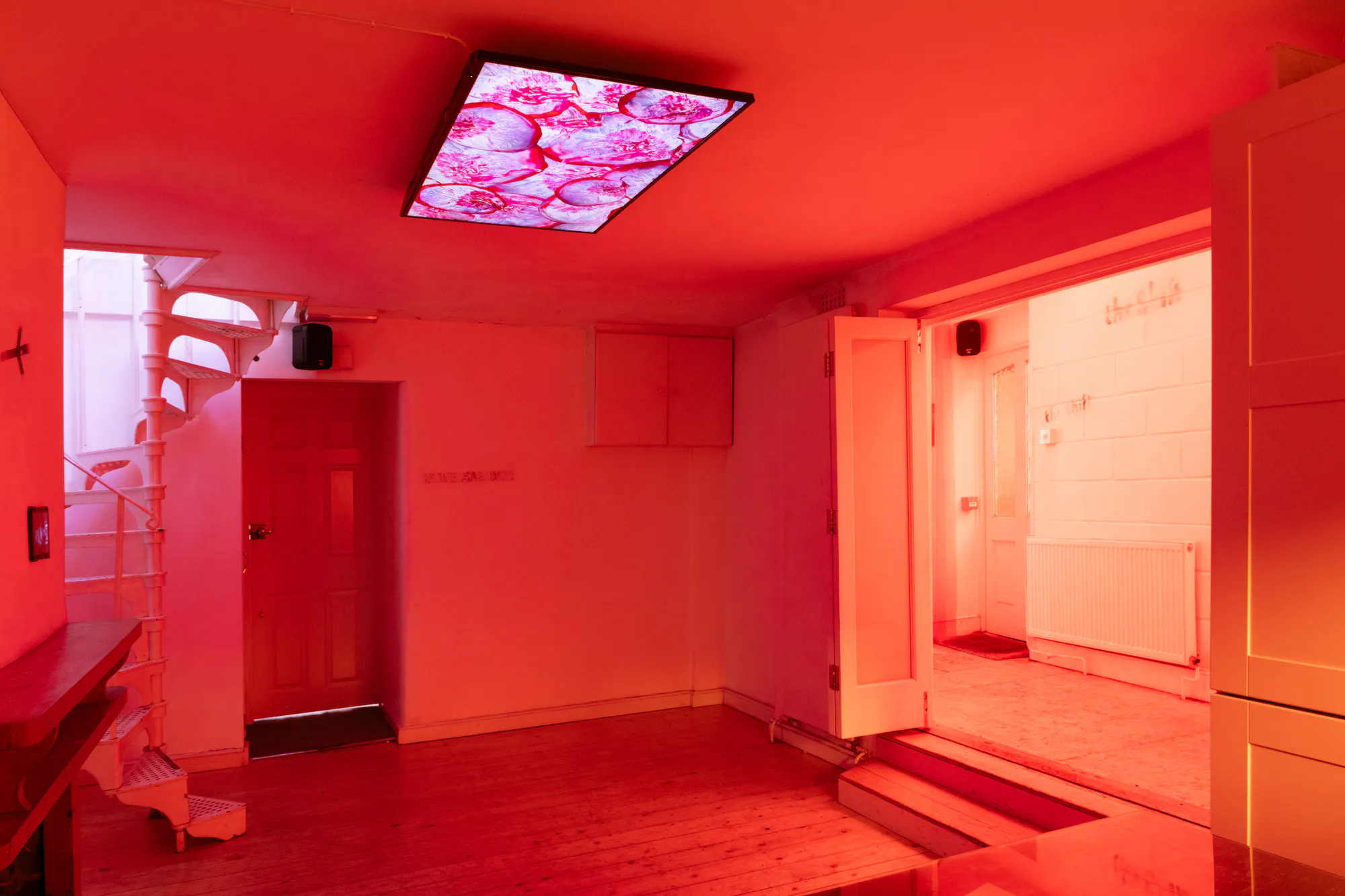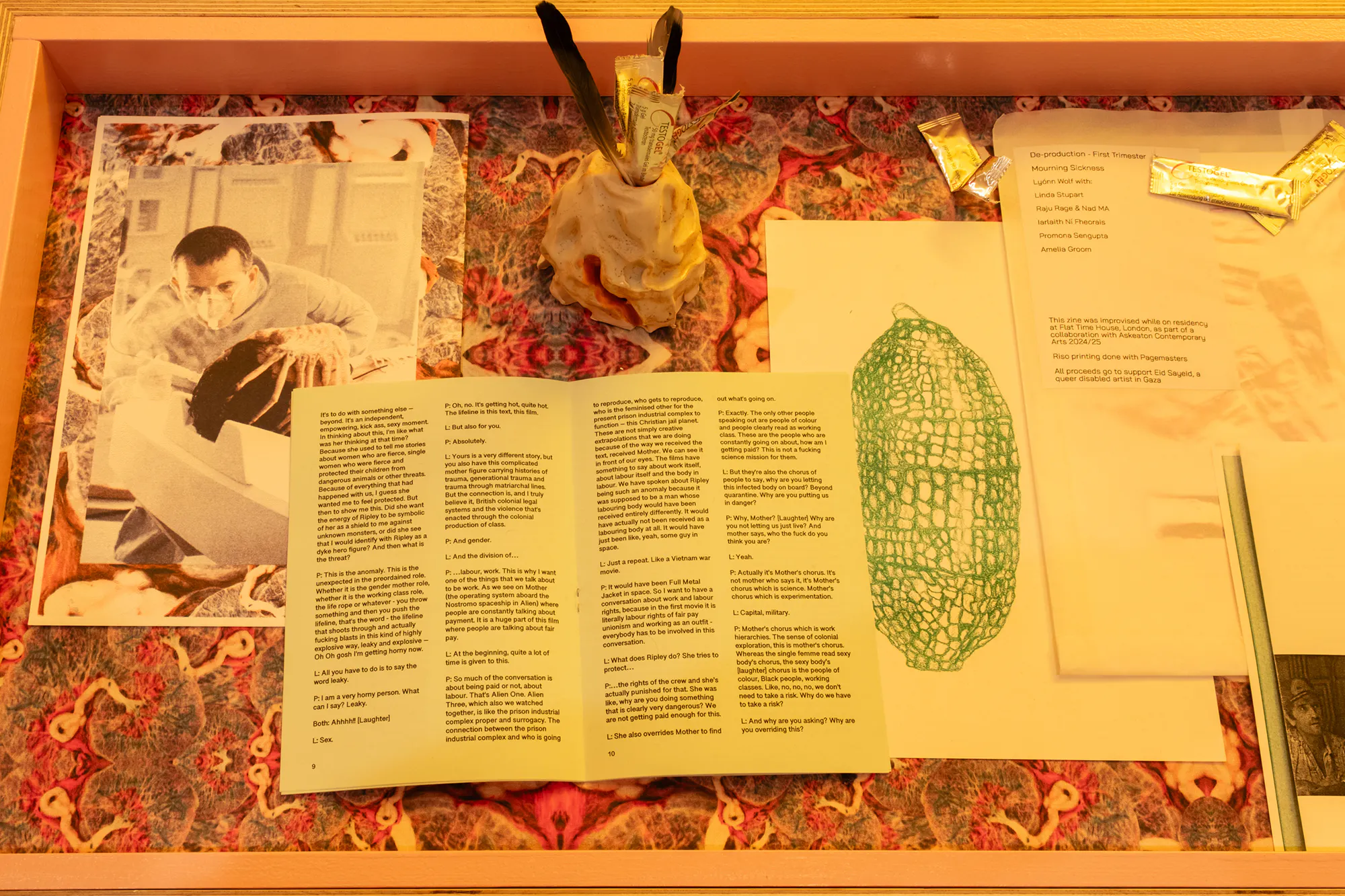 Wolf’s De-production created an installation running through a succession of spaces in Flat Time House, dramatically transforming its interiors through sculptural and textual interventions. Playing upon the narrative and spatial tropes of popular Science Fiction, De-production has grown into an ongoing project for Wolf, tracing states of transition through what he describes as ‘an intentional re-patterning of reproductive logics’. Themes drawn from close readings of Ridley Scott’s Alien motion picture and subsequent sequels from 1979 to 1997 are a dominant aspect explored – monstrous motherhood, alienated embodiments and transitional states. Moving through the spaces of FTHo Wolf offered spatial inflections that hold the body awash with colour, enclosed by temporal thresholds, drenched in sound and seduced by ephemera. In this context, Wolf developed and is maintaining an archive, The Breeding Room, acting as a counter to traditional institutional intentions and structures, to instead accommodate artistic production, personal archiving and exchange of ideas and a practice of gathering.