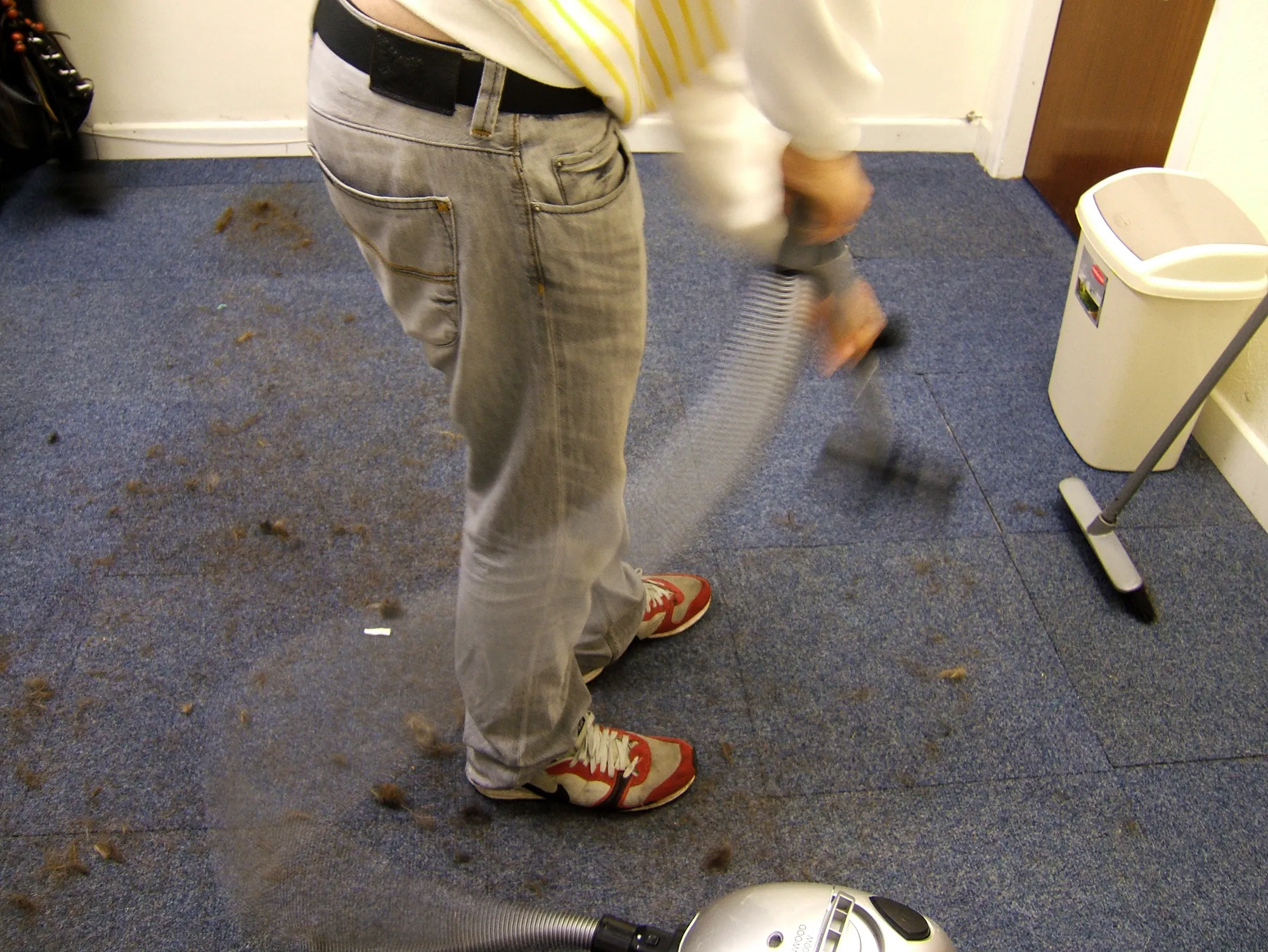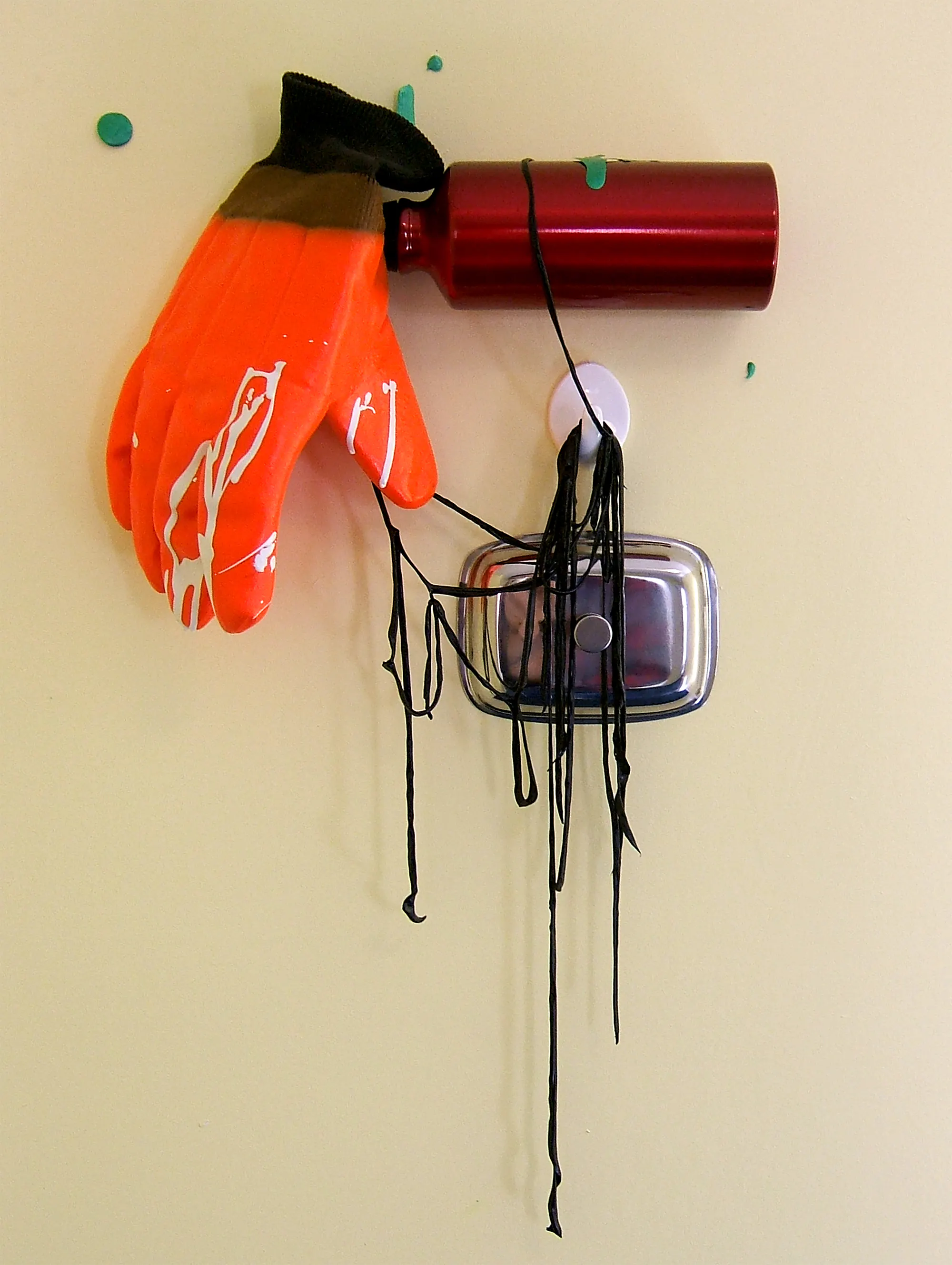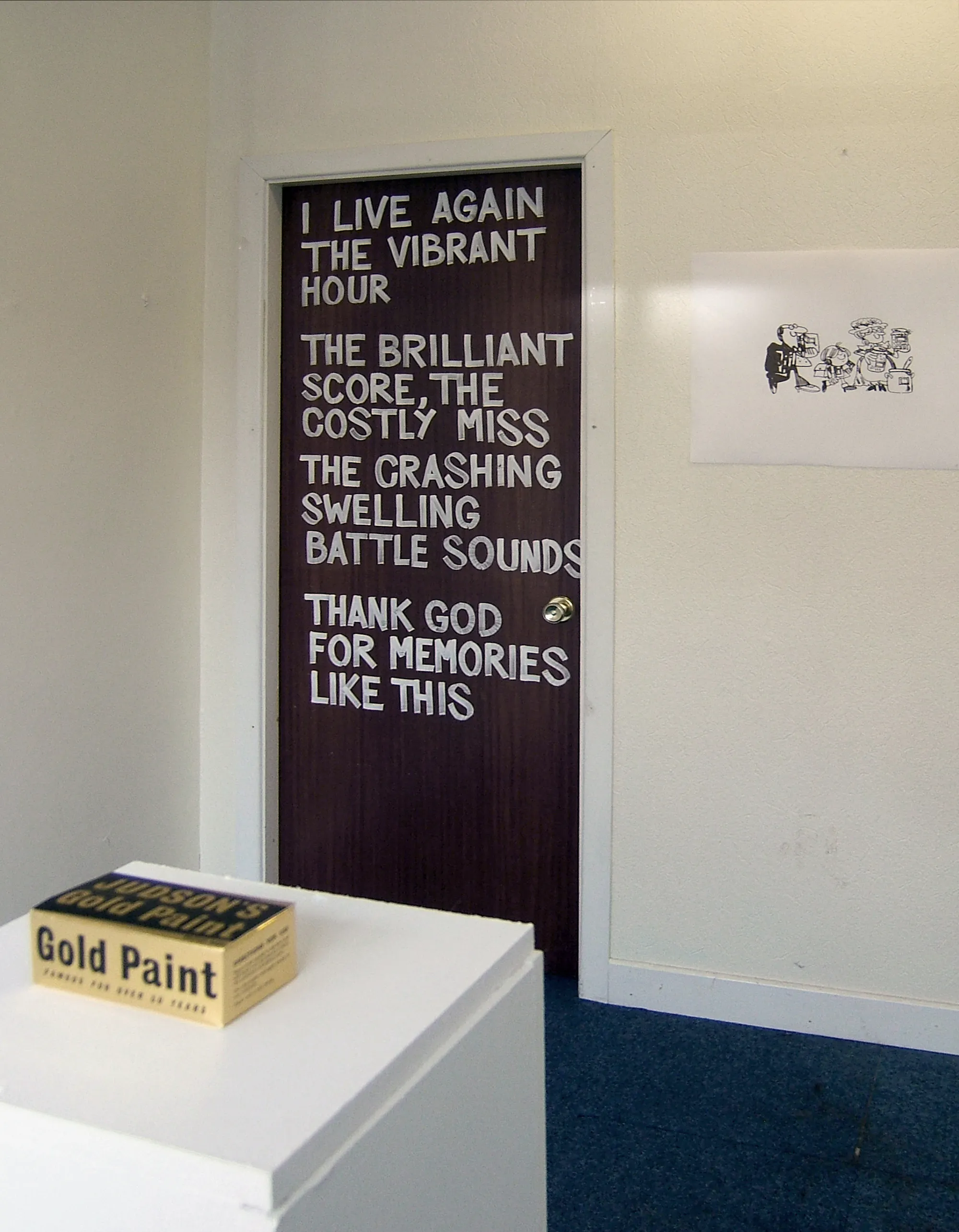 An installation at Ita’s Hair Salon featured a mish-mash of cultural references, using drawings, objects and magazine cuttings. A text upon a door featured a verse from local poet Michael D. Ryan, while an evocative piece of temporary signage fused two words together that Karilampi often heard on the streets of Askeaton: ‘Grand’ (a vernacularism for OK), and ‘Burger’ (his installation was around the corner from a fish and chip shop). Upon entering the installation space, viewers were often treated to an impromptu performance as the artist enacted the daily ritual of sweeping up masses of hair from the floor.
