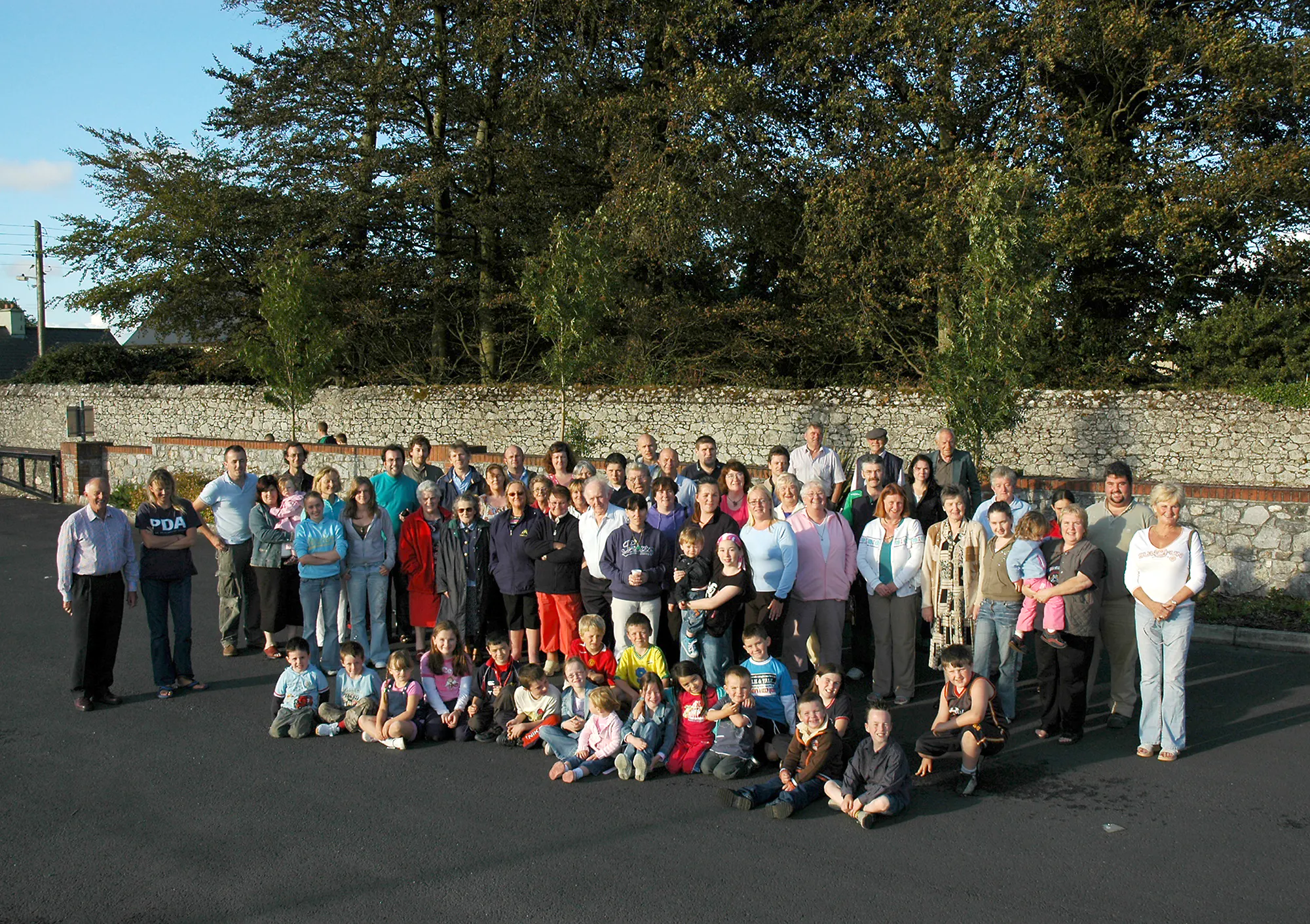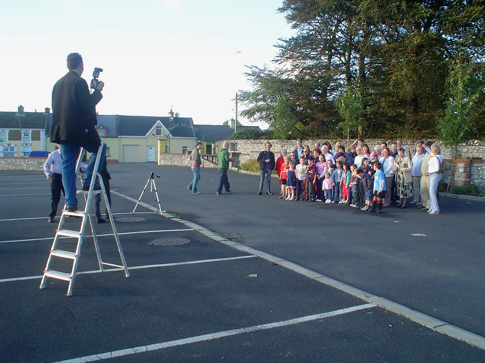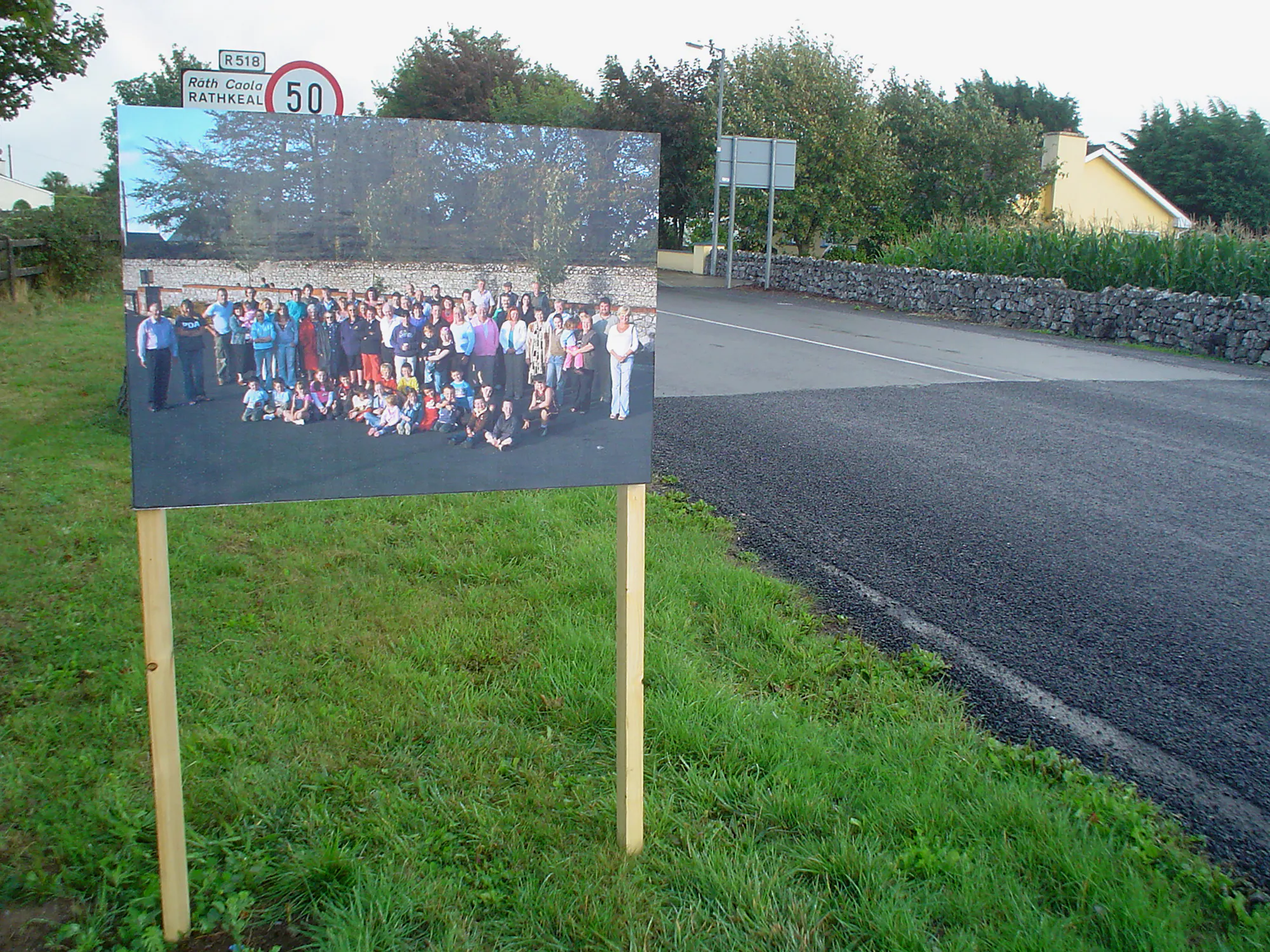 The artist invited the residents of Askeaton to a photoshoot in a local car park, where refreshments were served on a summer’s evening. This proposal seemed to act as a way of understanding how many people might be interested in the fledgling artist residency programme and arts festival in the town. A group photograph was taken and made into a new road sign, placed at entrance routes to Askeaton.