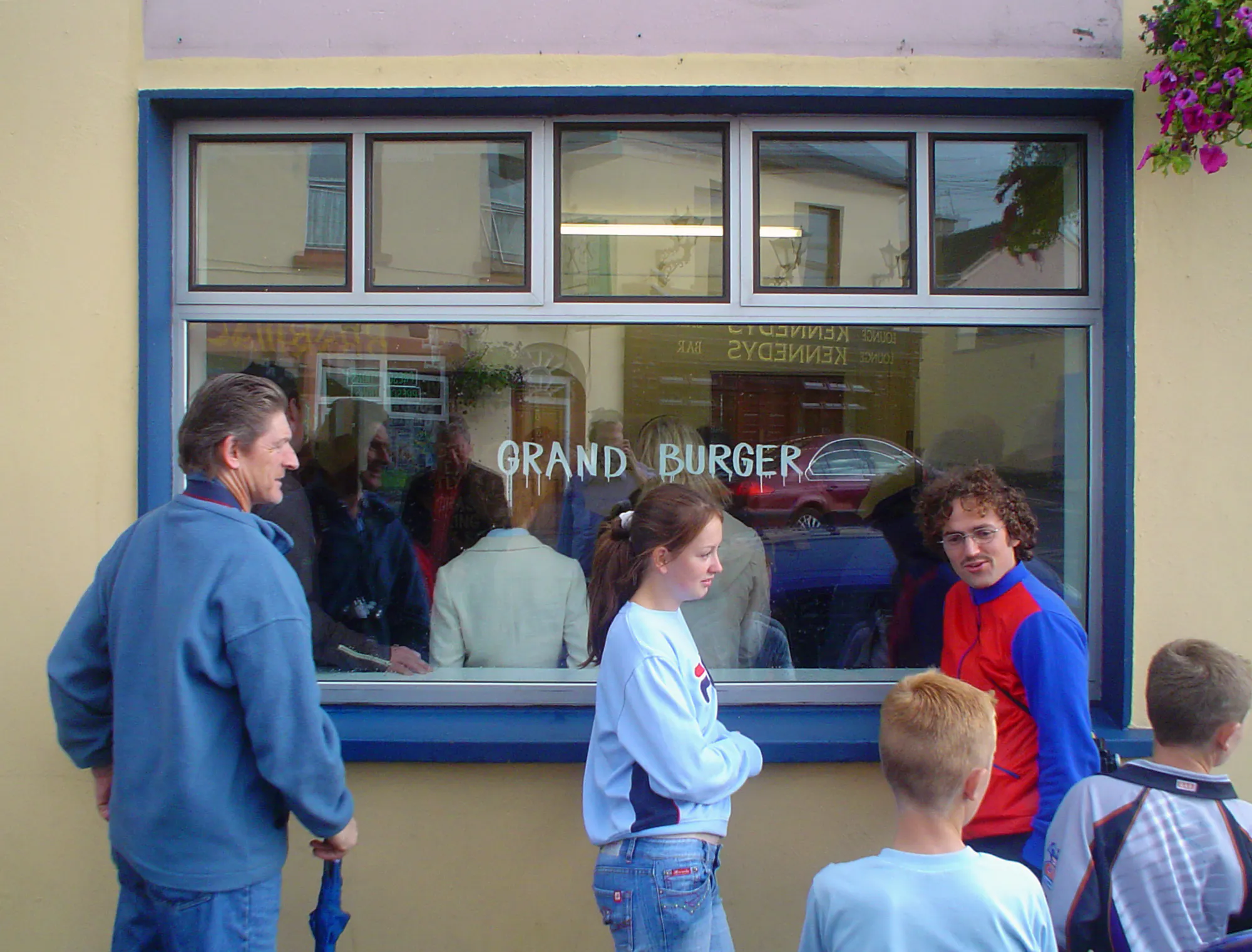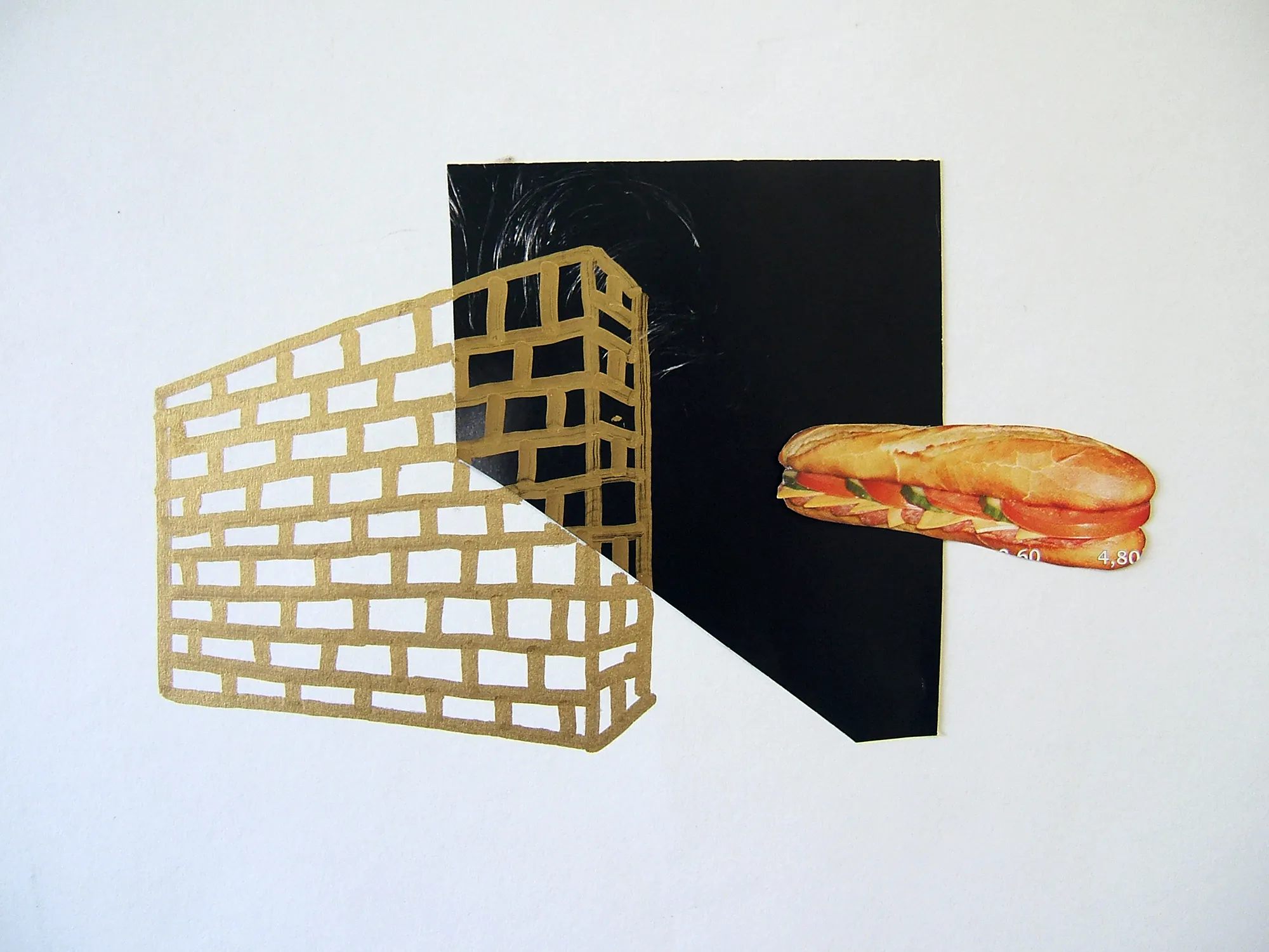 An installation at Ita’s Hair Salon featured a mish-mash of cultural references, using drawings, objects and magazine cuttings. A text upon a door featured a verse from local poet Michael D. Ryan, while an evocative piece of temporary signage fused two words together that Karilampi often heard on the streets of Askeaton: ‘Grand’ (a vernacularism for OK), and ‘Burger’ (his installation was around the corner from a fish and chip shop). Upon entering the installation space, viewers were often treated to an impromptu performance as the artist enacted the daily ritual of sweeping up masses of hair from the floor.