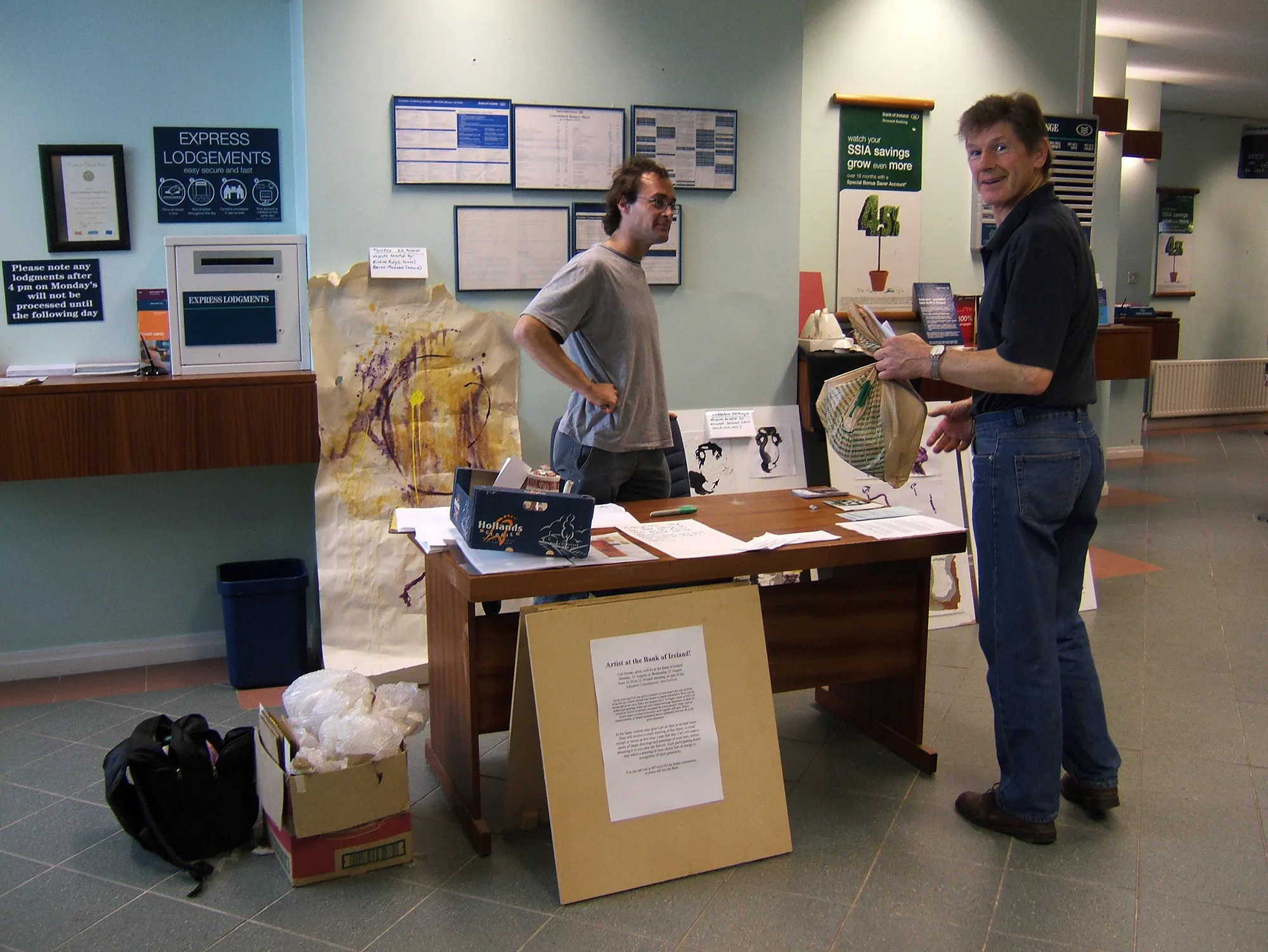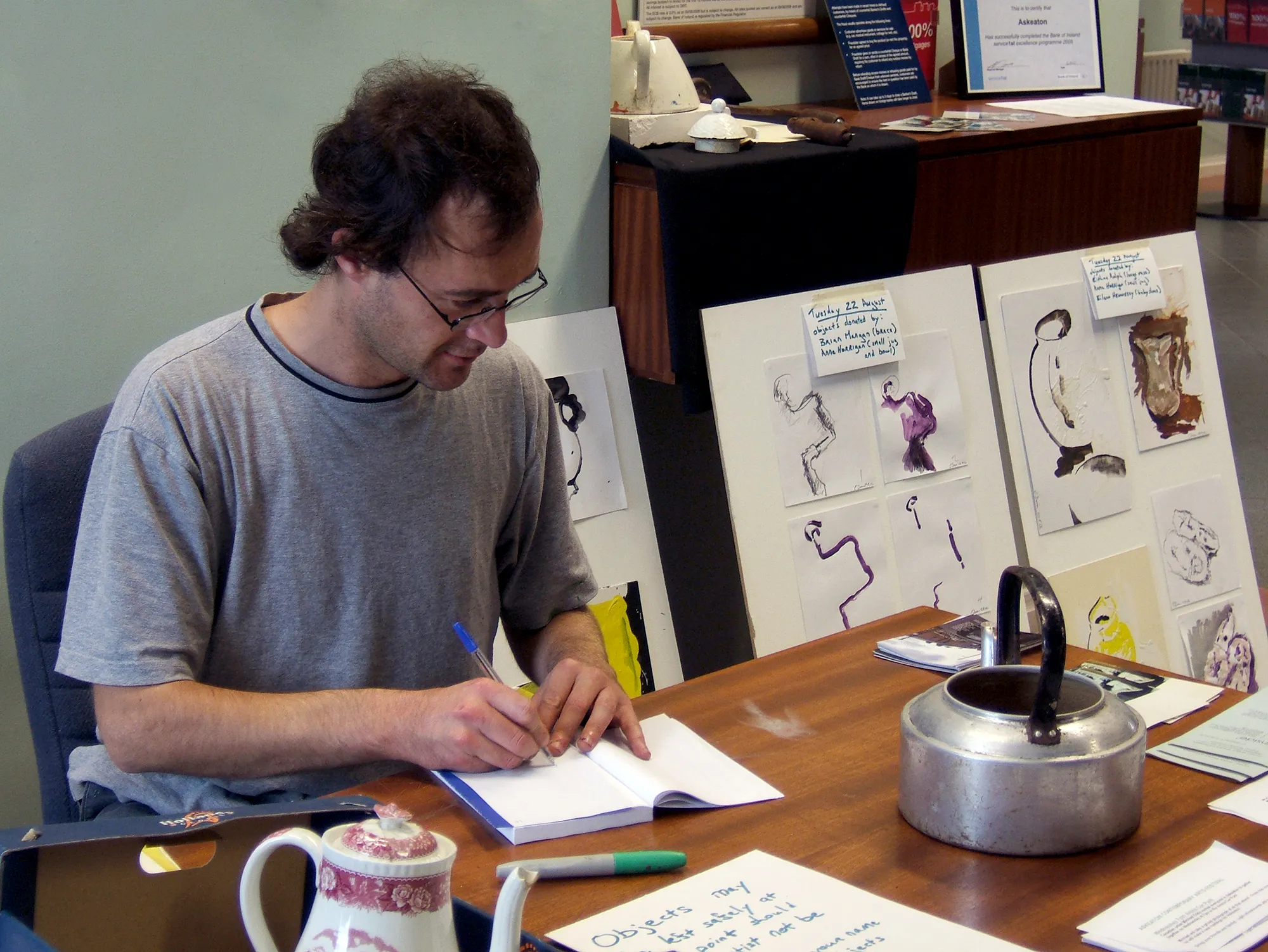 Working from a makeshift desk in the foyer of the local Bank of Ireland, the artist offered a ‘sketch and draw’ service to the public. Following conversations on the street and some initial advertising, many local people brought in broken objects from around their houses, which were then lent to the artist for a week, in the manner of a short term deposit. At the end of the project, donors received their objects back along with a complimentary drawing of the object, which acted as a kind of accumulated interest for their involvement.