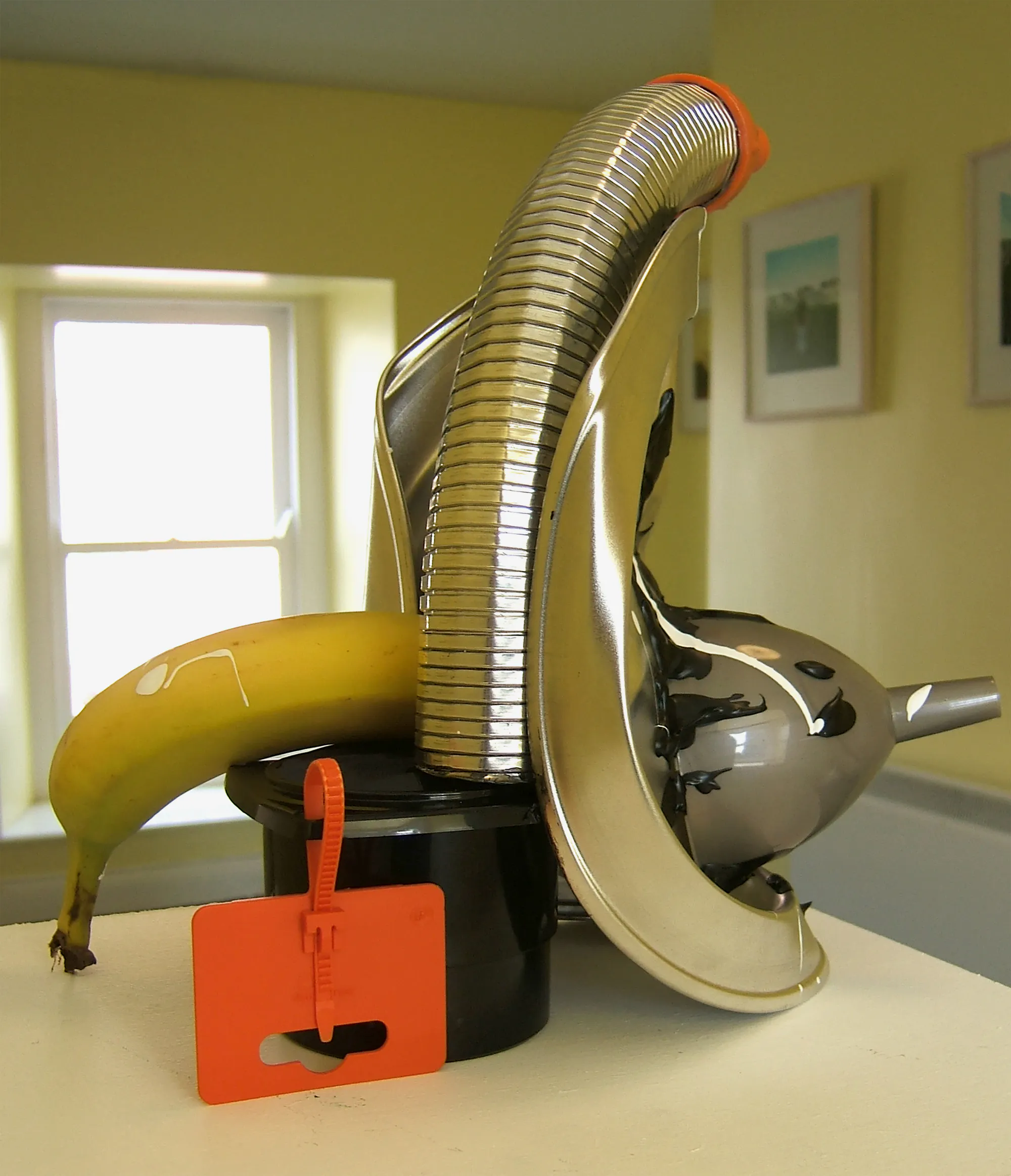 Jeanette Hillig combines various found objects into her sculptured forms. In Askeaton, an expressive assemblage was located in a shop window, providing a visual counterpoint to the traditional Irish shop front.