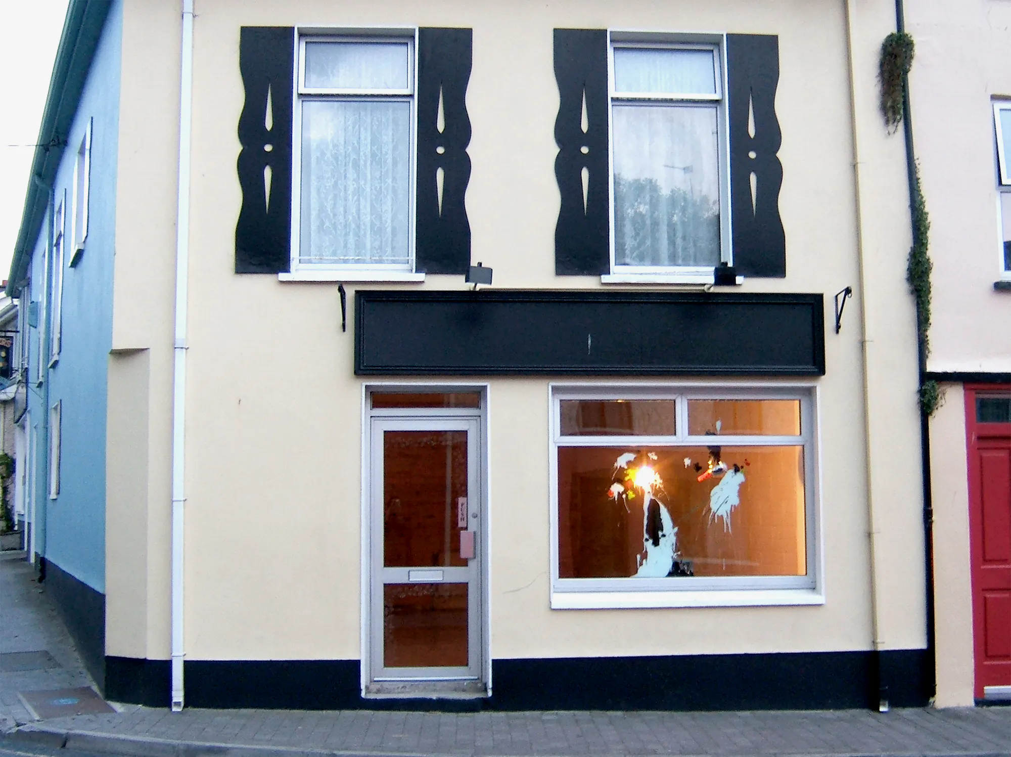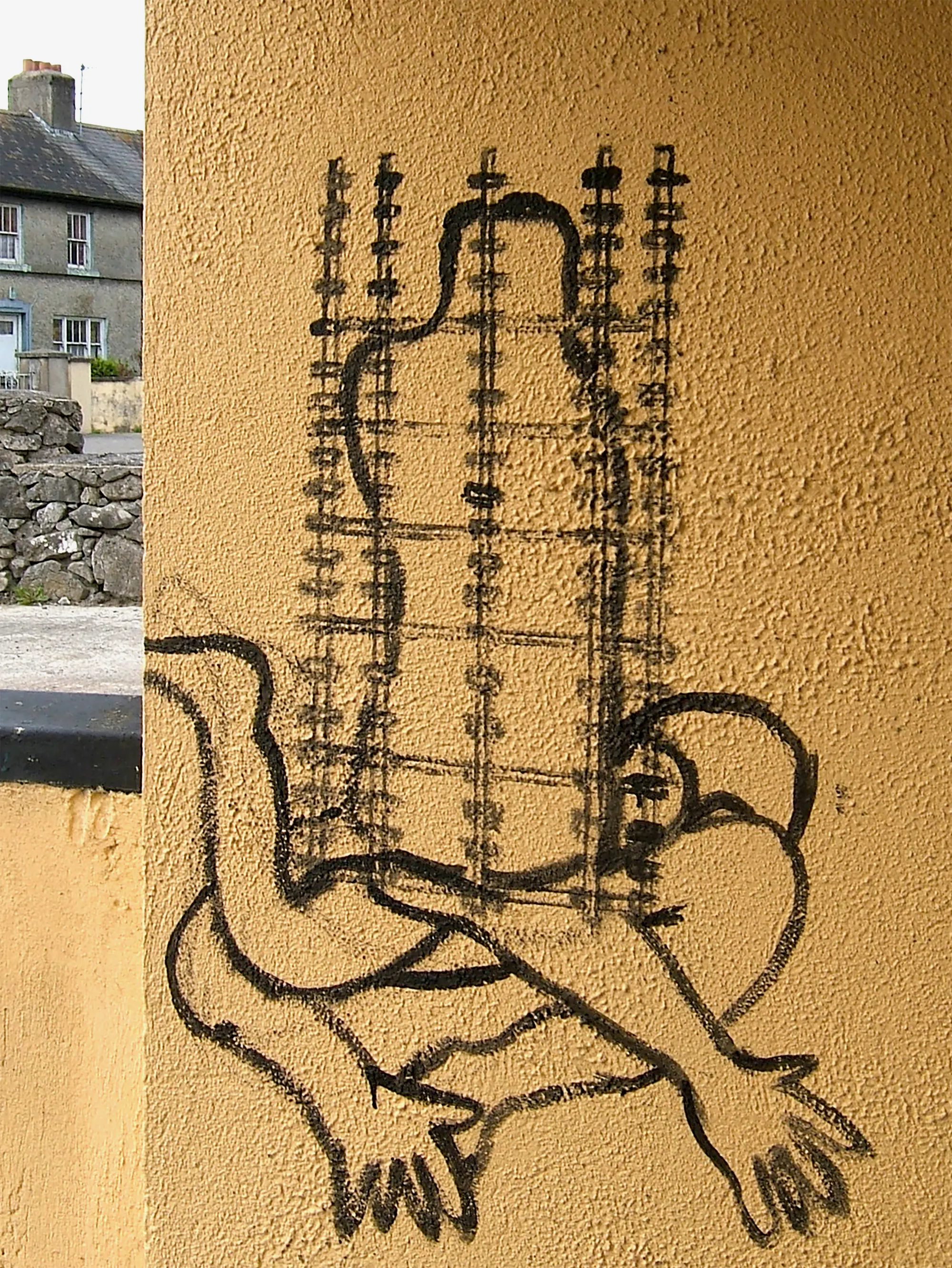 On a building scheduled for redevelopment at the west end of the town, the artist unleashed a series of drawings incorporating elements of the body with elements of local architecture. His impulsive inky drawings evoked perceptions of graffiti and brought a new energy into a quiet corner of the town.