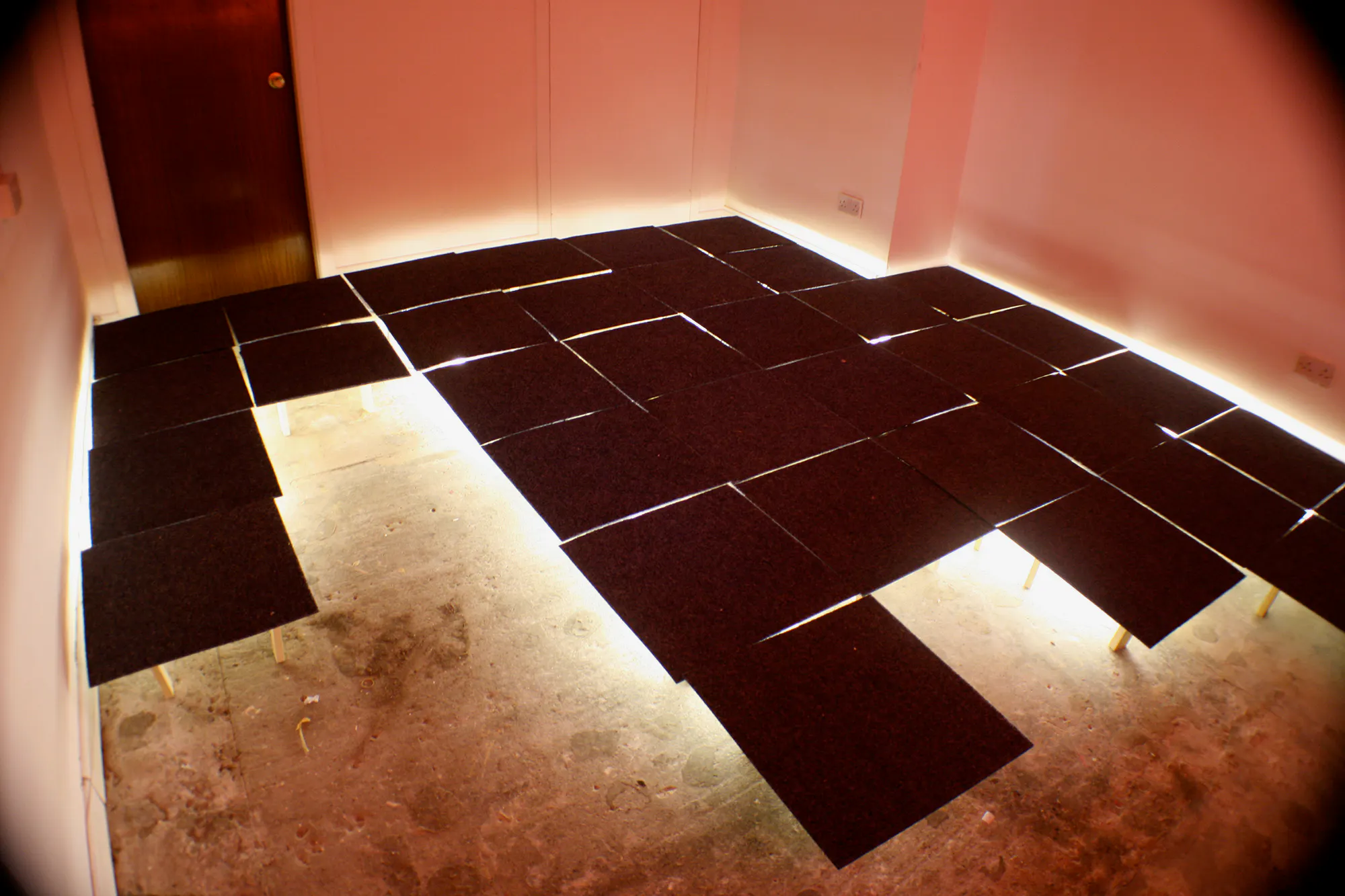 Hoffner completed a series of architectural interventions in unused retail units around the town. In one space, she created a raised floor, lit from underneath with fluorescent lights. In another space a kind of bricolage was constructed, using building materials and images of buildings and sites around Askeaton.
