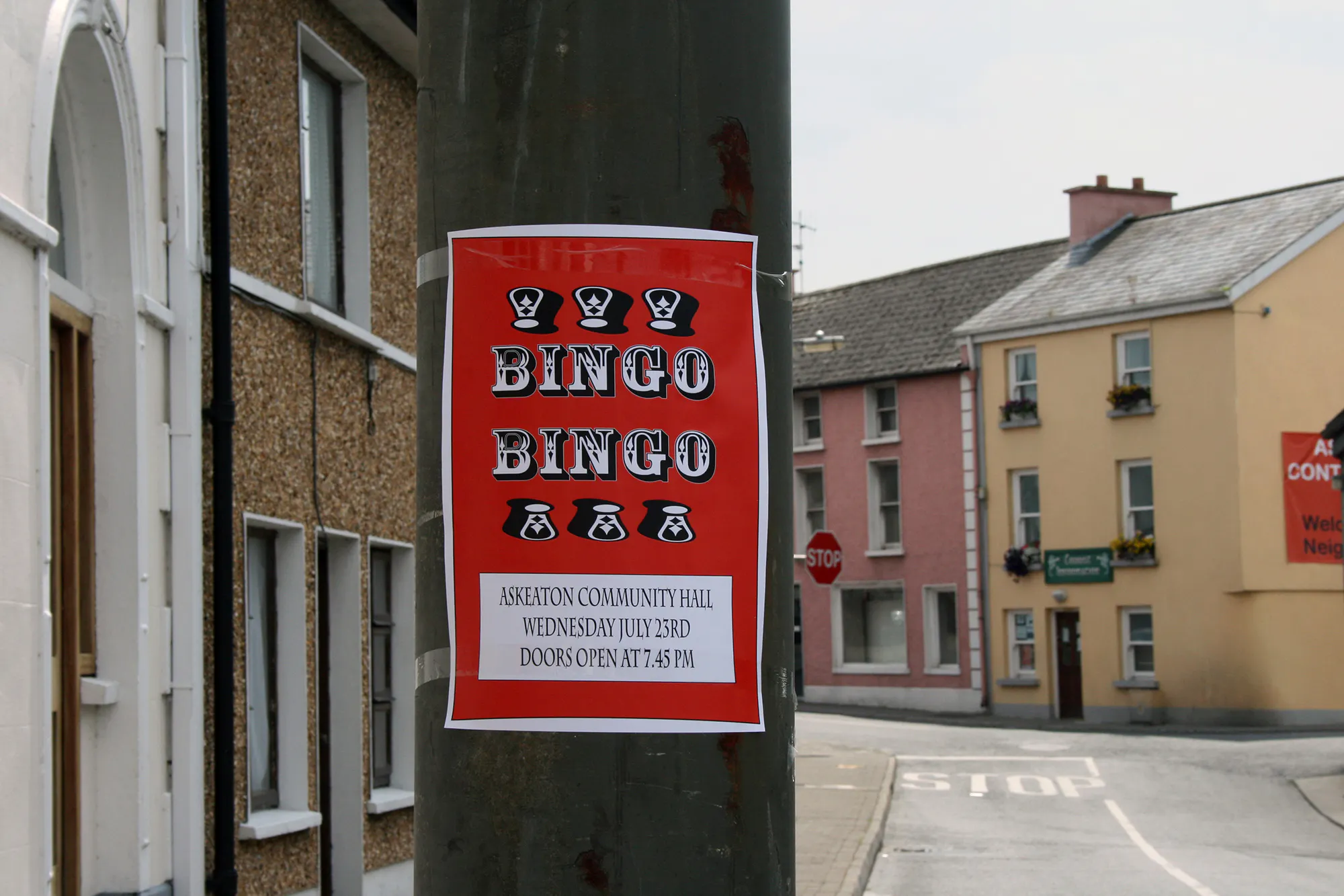 With local community help, the artist organised a game of bingo for one night only in the Community Hall. This was the first time in 25 years that Askeaton hosted a game of bingo and two hundred people attended. A final installation consisted of sound recordings of the event. Since then, a revival occurred and bingo has been held once a month in the town, thanks to Michael's foresight.