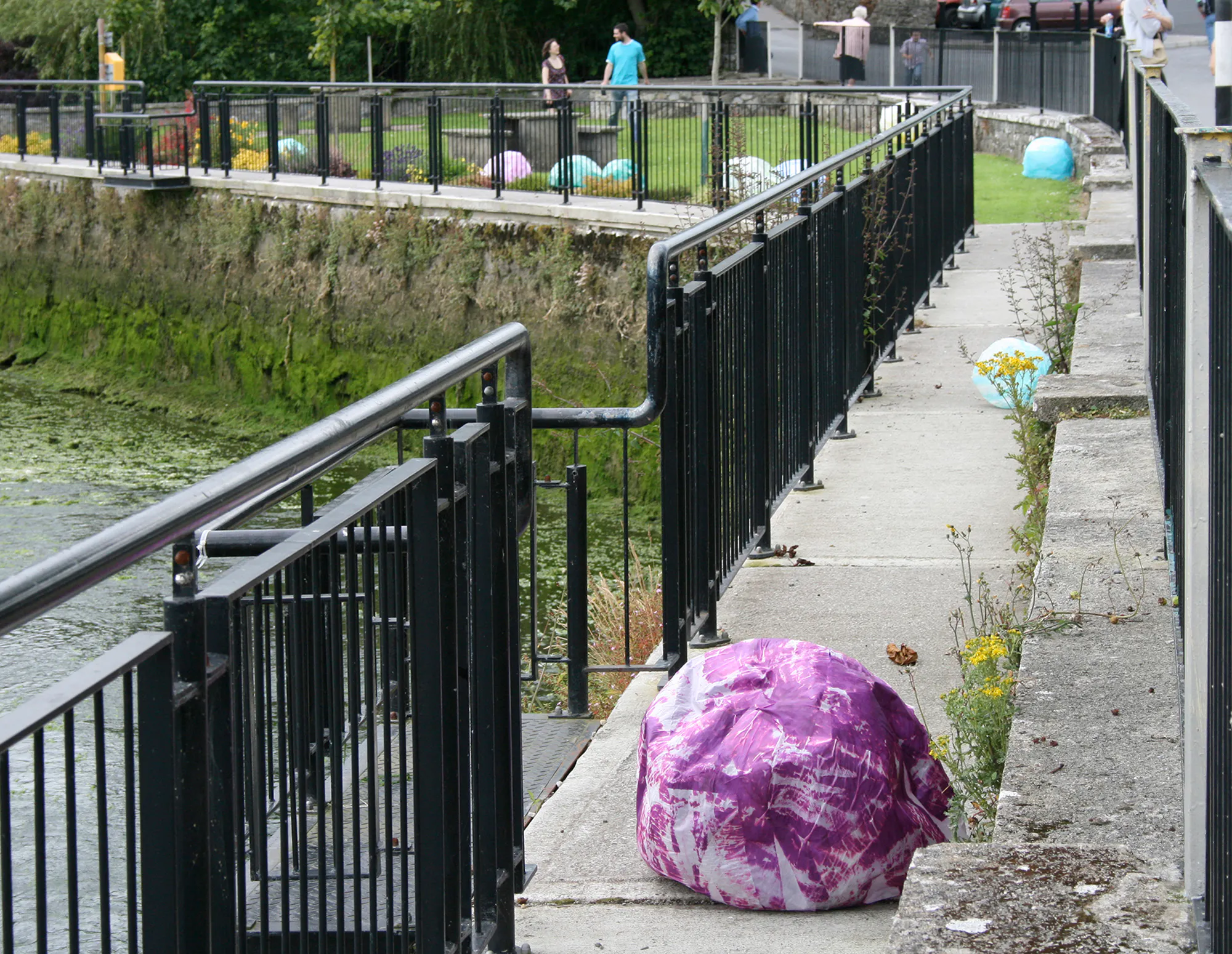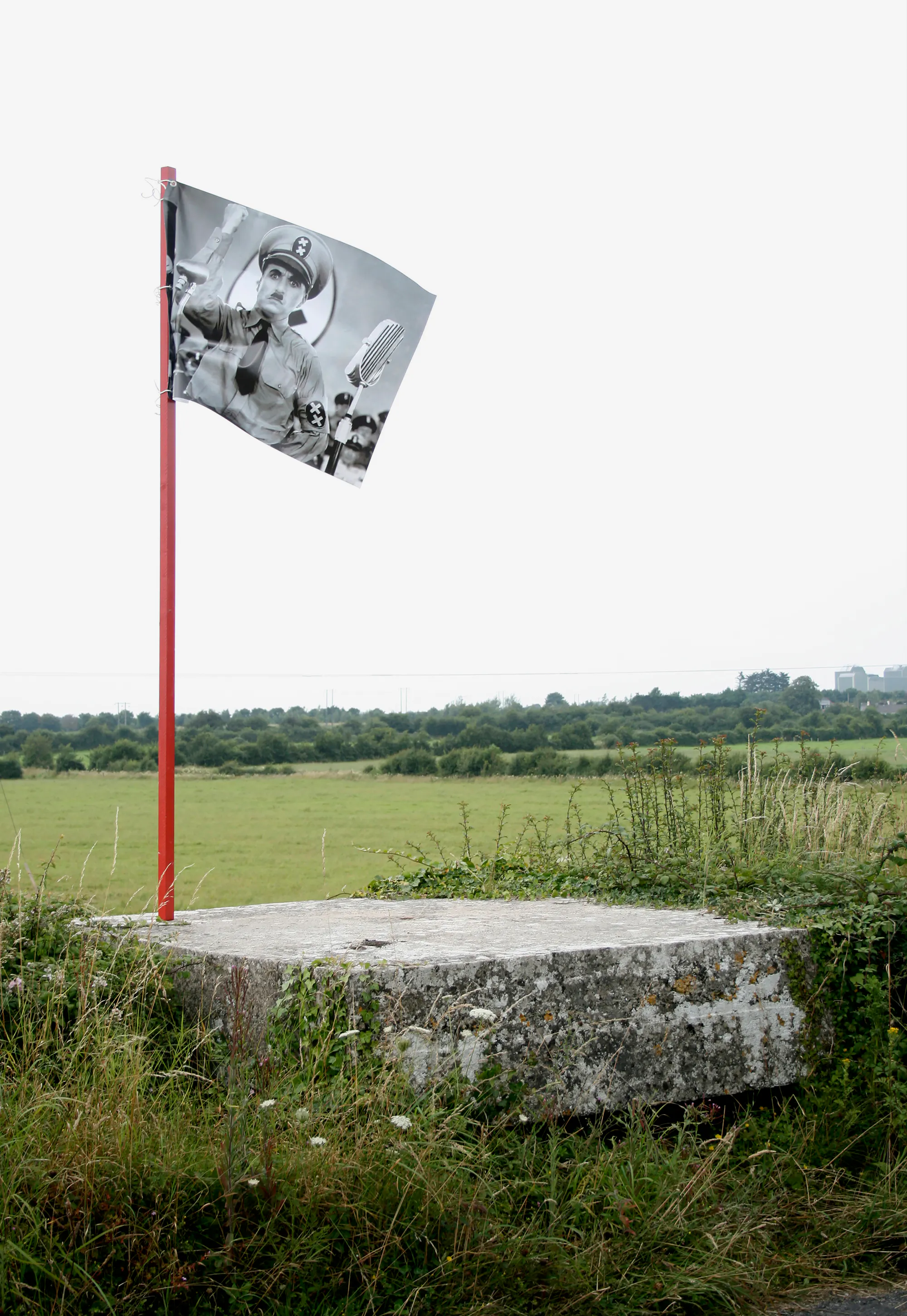 This artist duo often focus on historical sites and local social systems. Hence was made as an intervention on the title of a Christian newspaper. Pill Box consisted of a flag sited on one of several abandoned pillboxes in Askeaton. These concrete structures were built around the town as lookout stations during World War II to forewarn against possible invasion from German forces attacking from the Shannon River Estuary. The artists’ flag featured a film still of Charlie Chaplin from the film The Great Dictator (1940), installed atop the pillbox.