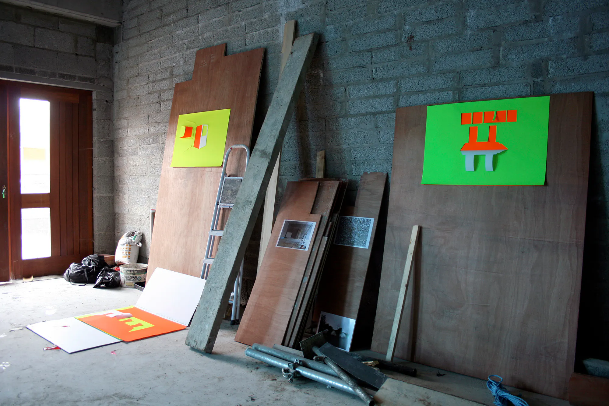 Hoffner completed a series of architectural interventions in unused retail units around the town. In one space, she created a raised floor, lit from underneath with fluorescent lights. In another space a kind of bricolage was constructed, using building materials and images of buildings and sites around Askeaton.