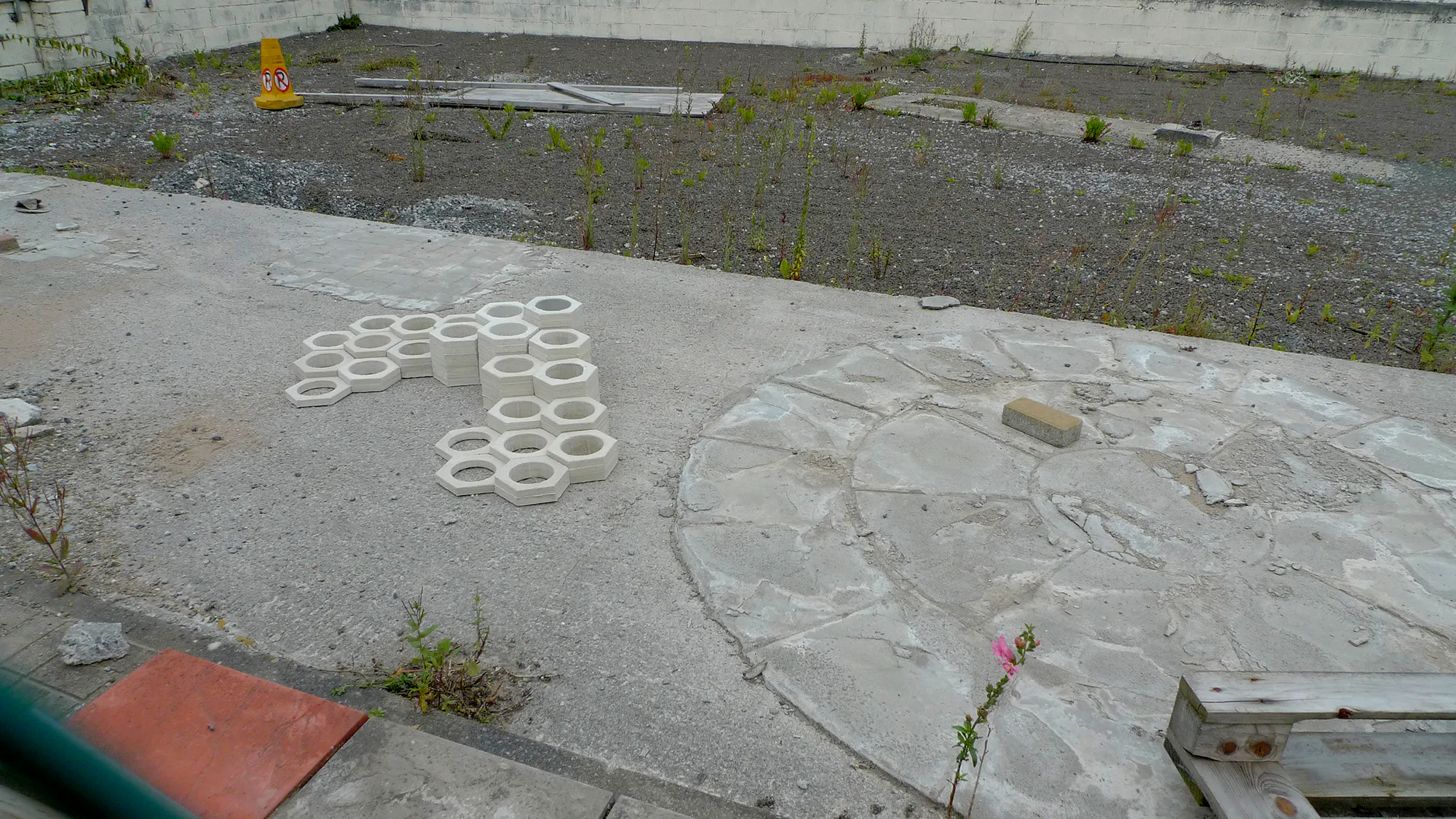 McNulty created a concrete sculpture, which was composed of a number of individually cast hexagonal modules. It was installed in a yard at one end of the town and visible to the public through the surrounding fence. In the past, the yard has been used as a sales outlet for concrete products. These hexagonal modules were stacked alongside each other to create the final form which referenced a proposed design for a building by Irish architect Noel Moffet. McNulty was introduced to Moffett and his work in 2009 by architectural historian Ellen Rowley. Moffett’s initial proposal for ‘High density housing at Bethnal Green for the GLC’ (1970) overtly referenced the hexagonal forms of the Giant’s Causeway. The building was completed in the early ’70s, but the final form is much more conventional. McNulty’s sculpture also references the hexagonal bricks he found embedded in earth in a grassy area in front of the building when he visited it in September 2009. These bricks mark the location of a playground which has been destroyed since the building's construction in the early ’70s.