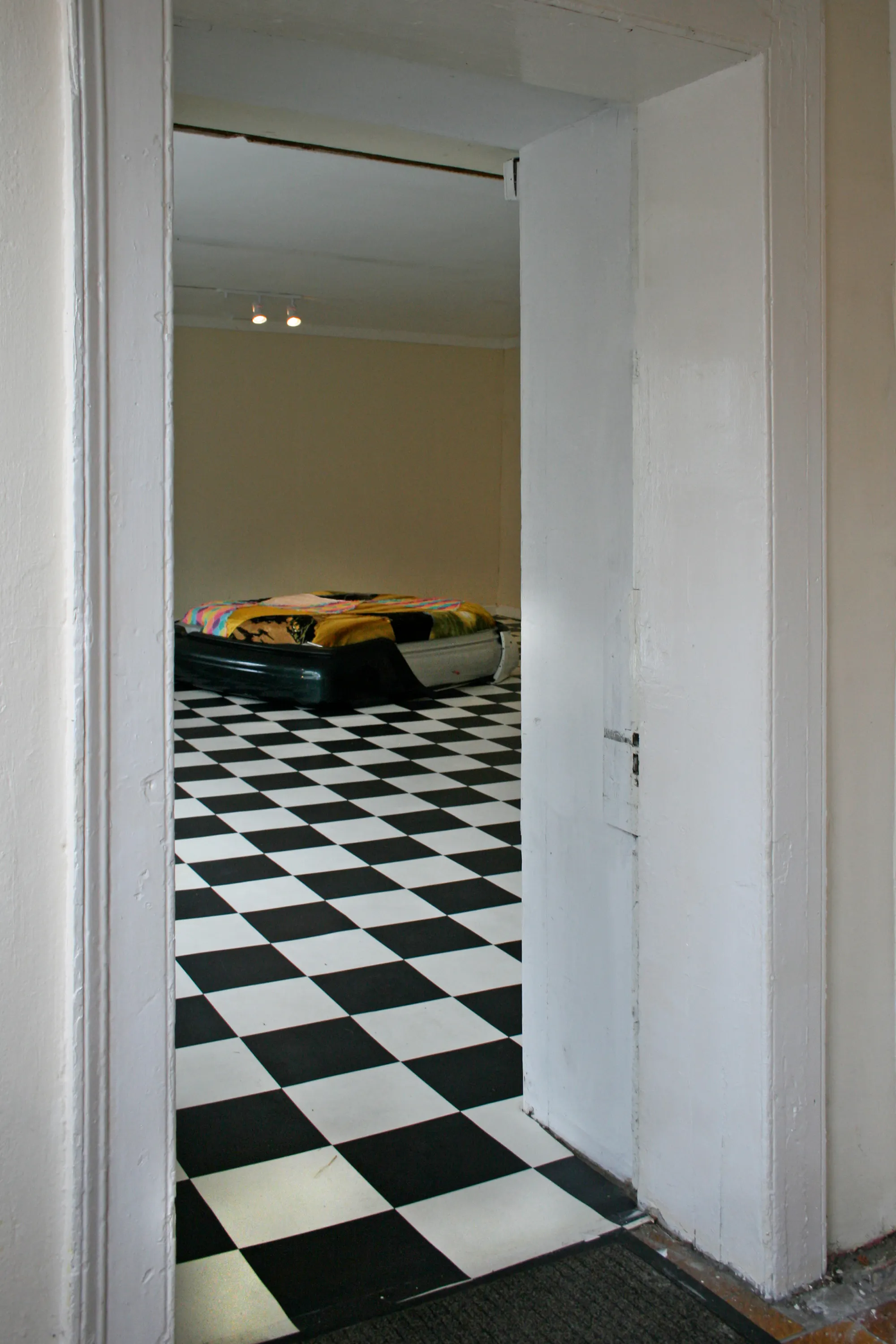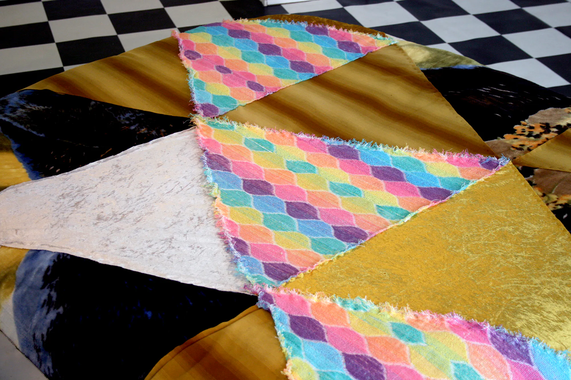 Onos is a sculptural work that brings to a small retail unit in Askeaton, a low-tech ‘hippy’ production of a high-end designer bed. Fulcher’s sculpture brings together two design references from the late 1960s; Drop City, a notorious hippy commune who used scrapyard materials to construct their homes, and Superstudio, the progressive design and architecture collective who produced the original moulded fibre-glass Onos bed.