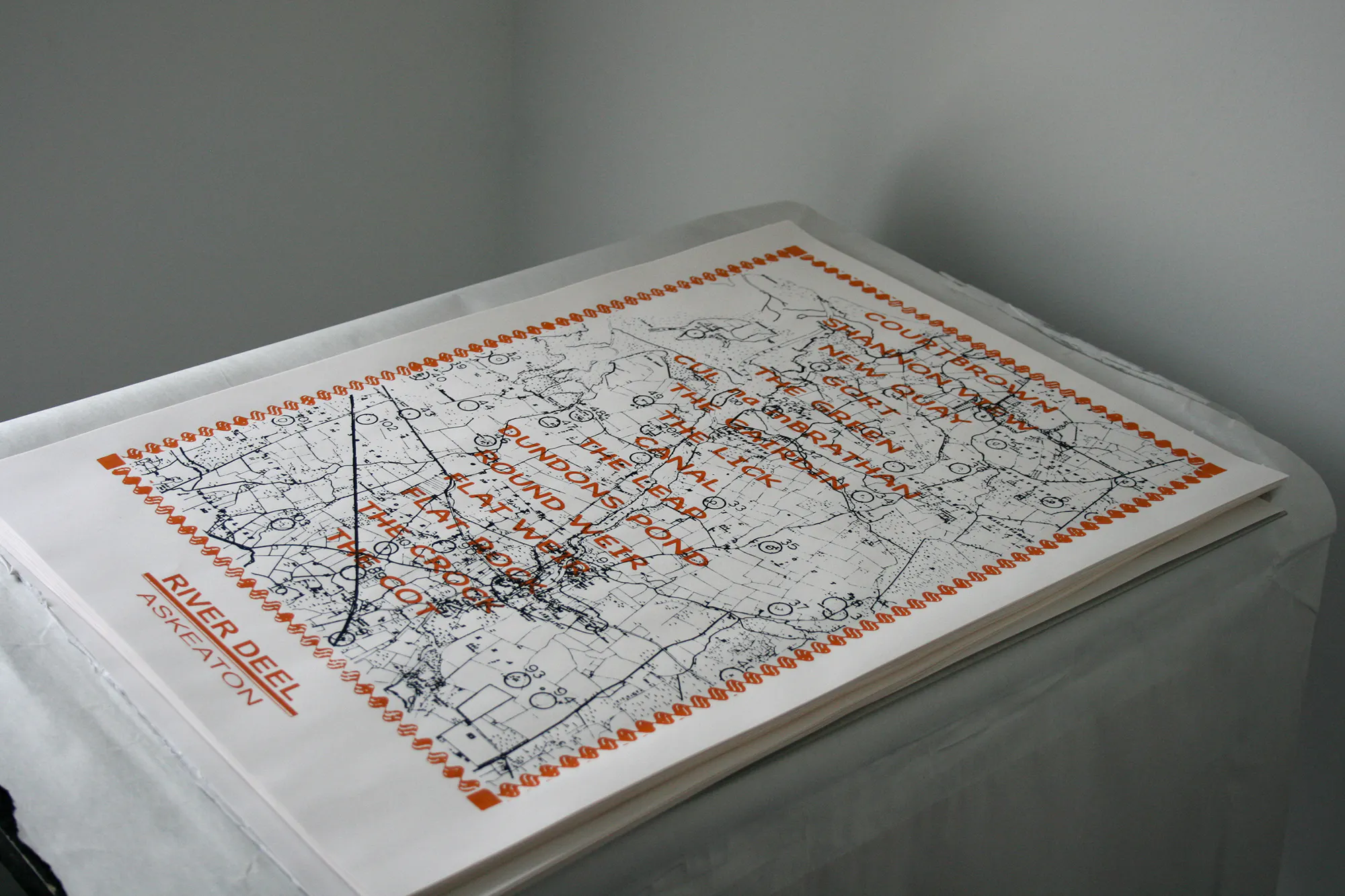 Van Dingenen investigated the long lost tradition of seaweed cutting along the Shannon Estuary, picked and cooked mussels, shot a video that referenced the TidyTown competition which Askeaton partakes in each year, made a poster for the annual Hellfire Club Party, and worked closely with local tour guide Anthony Sheehy to produce a freely-distributed print based on the geography of the River Deel. His many activities were reflected in a display at the local Tourist Office, featuring found and new material about historical residues of the everyday life of Askeaton.