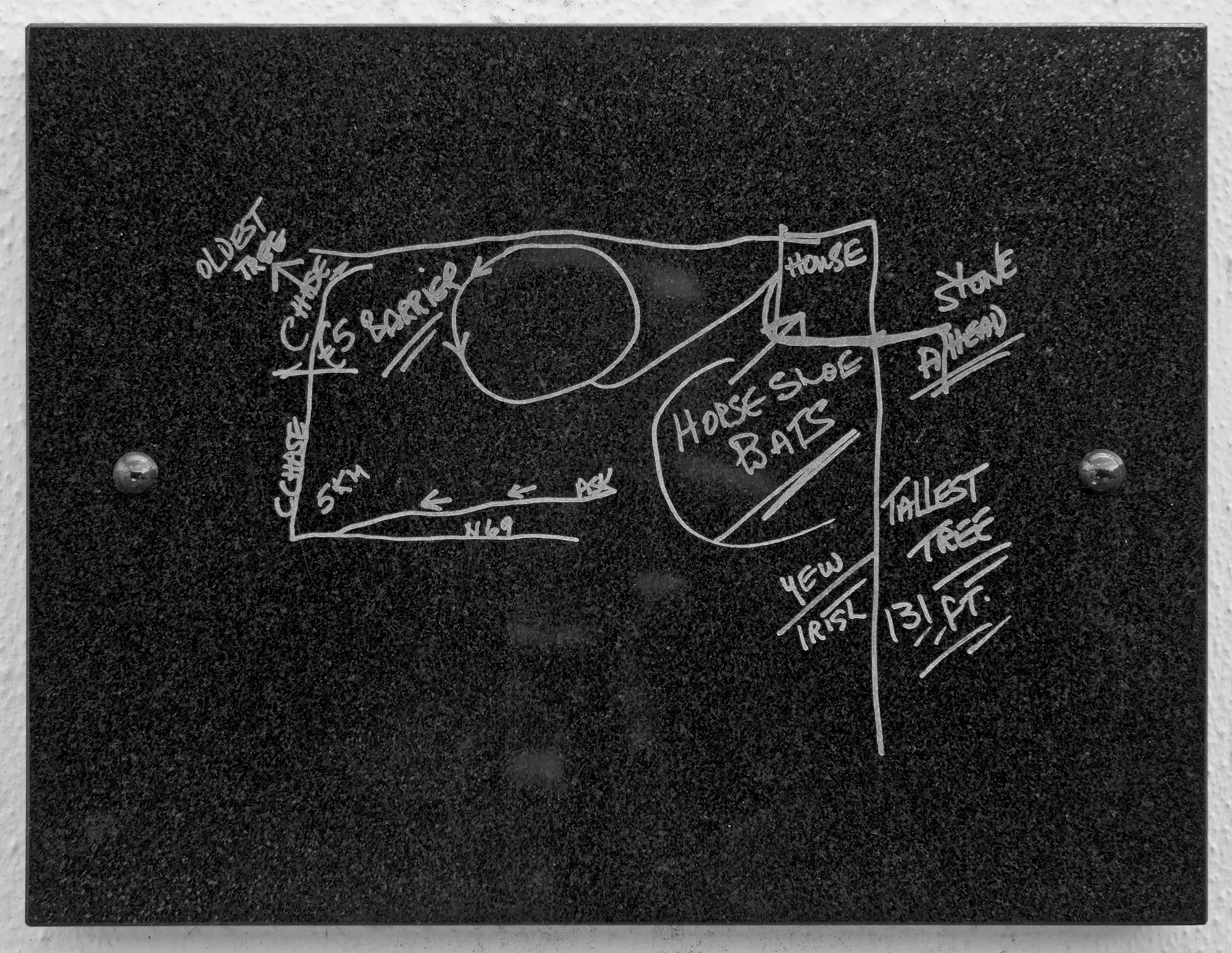 Ben Kinsley and Jessica Langley sited five permanent plaques around Askeaton. Each piece is based on hand-drawn maps by Askeaton residents that are then translated to engravings on granite tablets.