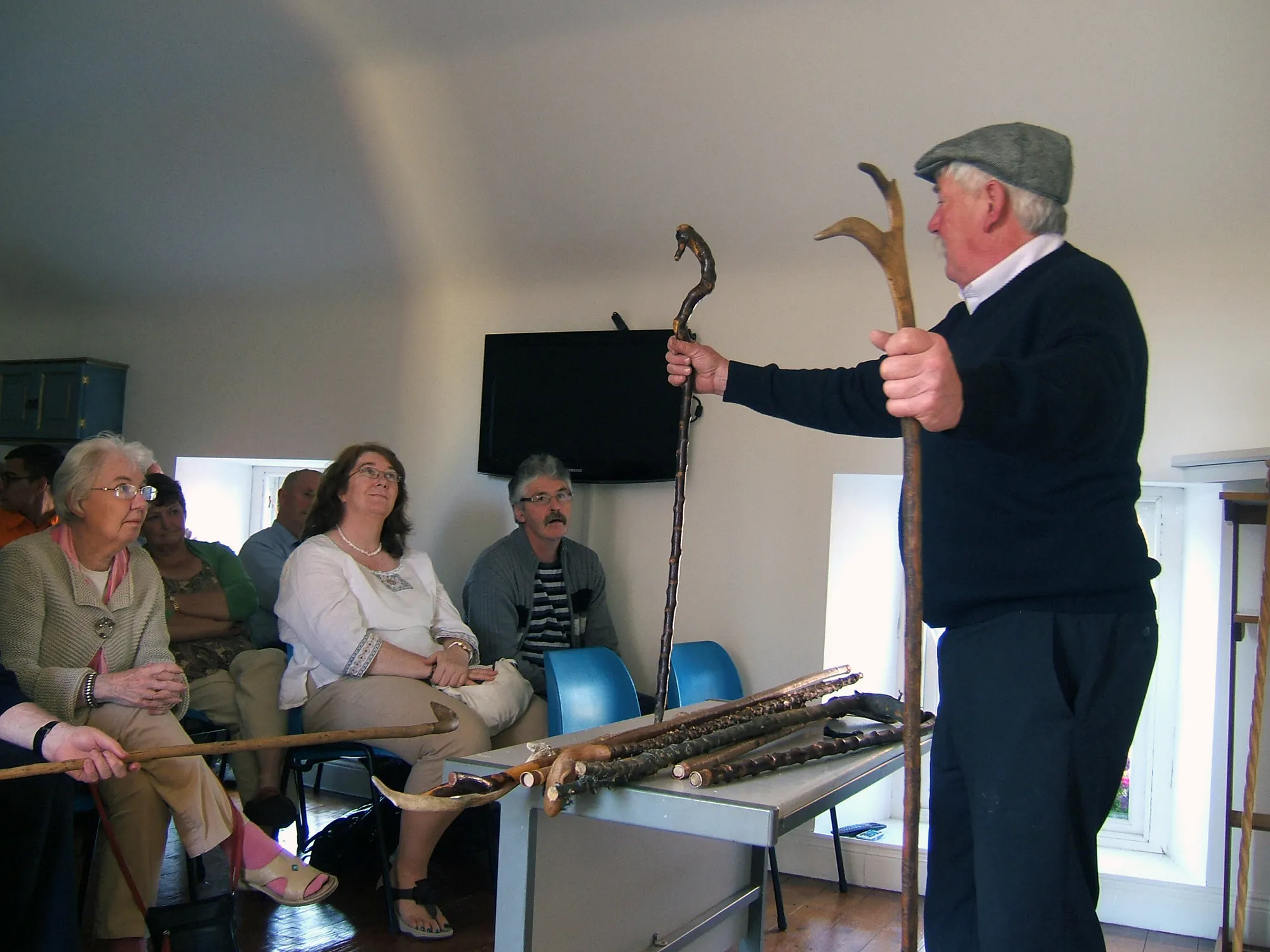 With no white-cube gallery spaces in Askeaton, resident artists work in various venues throughout the town. This form of engagement focuses on working within the existing dynamics of the locale, intending to bring forward the diverse layers of daily life and create a rich framework for subjective encounters. Such an approach is built on a belief that contemporary art can be used as a critical hub for local society, as a form of critique, investigation and celebration where artists are at the centre of these dialogues. Several public events occur during the artists’ stay, such as an open day and public tour throughout Askeaton, and workshops and talks such as Seanie Barron’s masterclass on his handcrafted walking sticks.