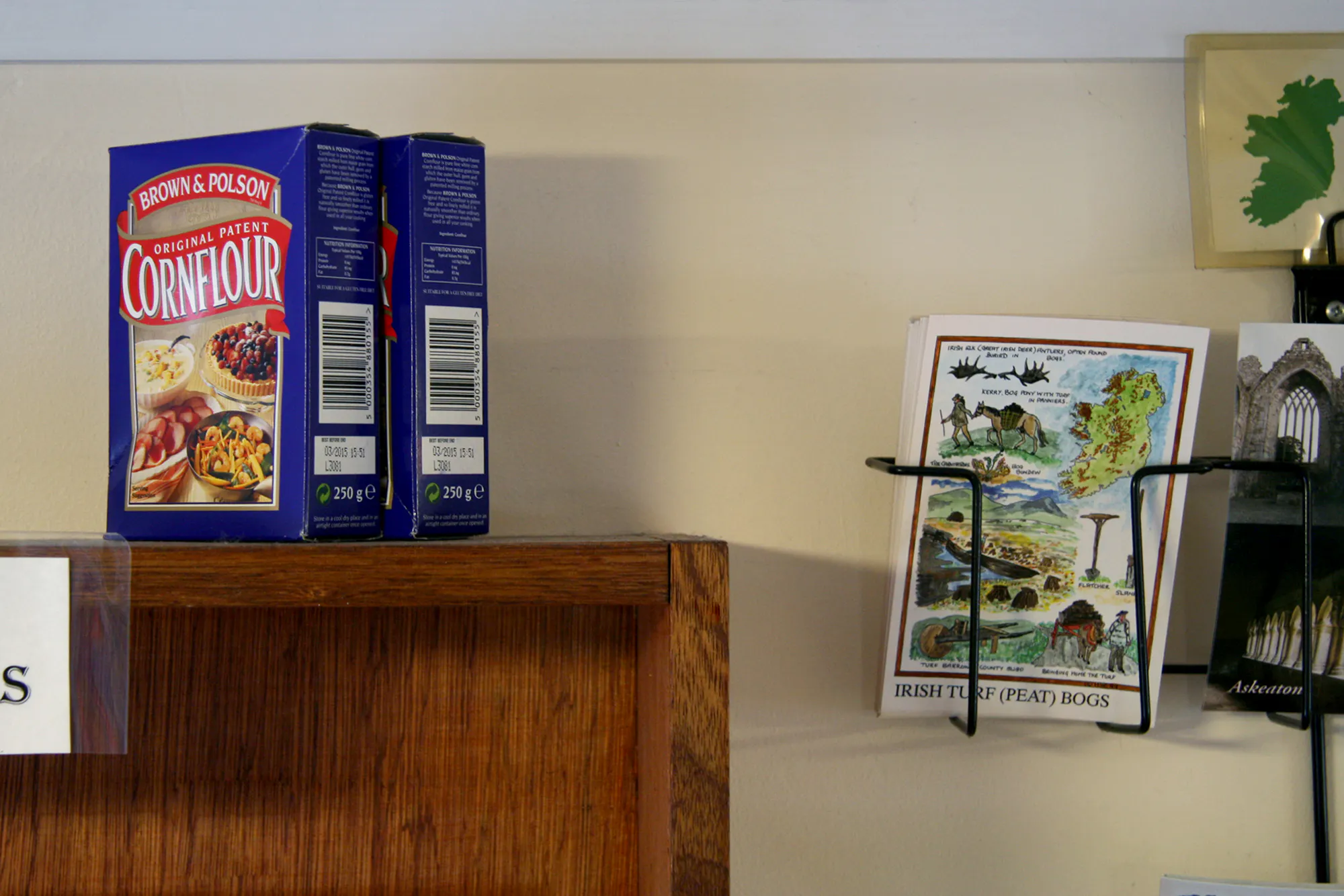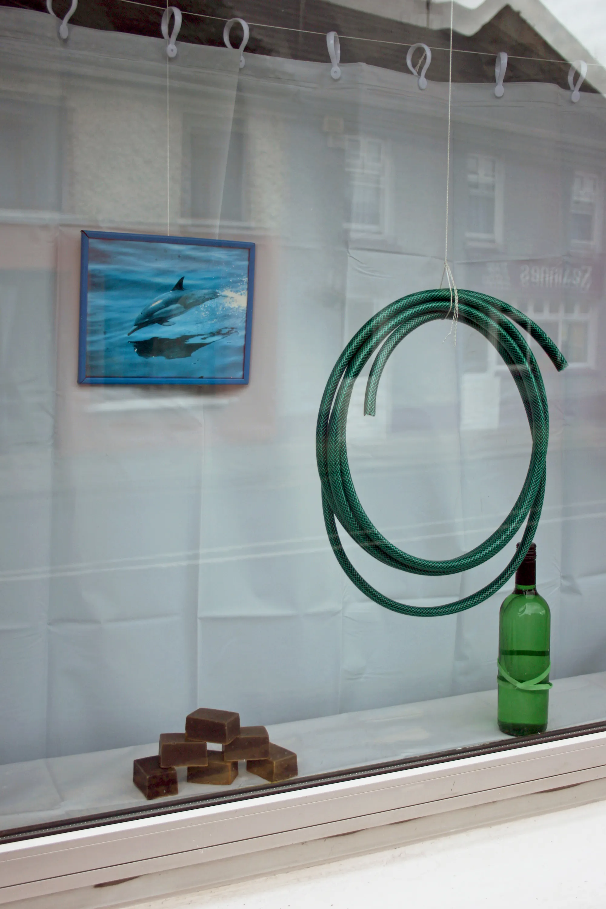 In eleven locations throughout the town, Freek Wambacq made An Askeaton Poem, placing objects used by Foley artists to synthesise sound for TV and film into the everyday fabric of Askeaton, creating unexpected juxtapositions through their presence and the language used to describe each work. Top to bottom: Earthslide in Bank of Ireland. Electric toothbrush; Gust of wind in Cois Sionna Credit Union. Nylon cloth, bicycle; Walking in Snow in the Tourist Information Office. Boxes of cornflour; Galloping horses in Ranahan’s Bar. Halved coconut shells.