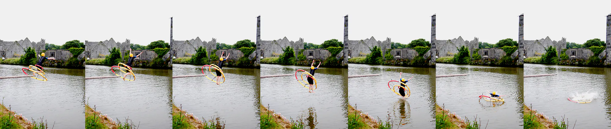 Michelle Browne’s Walk, Jump, Leap, Soar consisted of video and photographs documenting performances enacted in locations such as local swimming spot The Leap, a trampoline in Pat Fitzgerald’s garden and Askeaton Swimming Club’s diving board into the Deel. Utilising photographic approaches pioneered by Eadweard Muybridge, Browne’s work allegorically focused on the uncertainties of motherhood, finding a public role for such concerns to be discussed and played out.