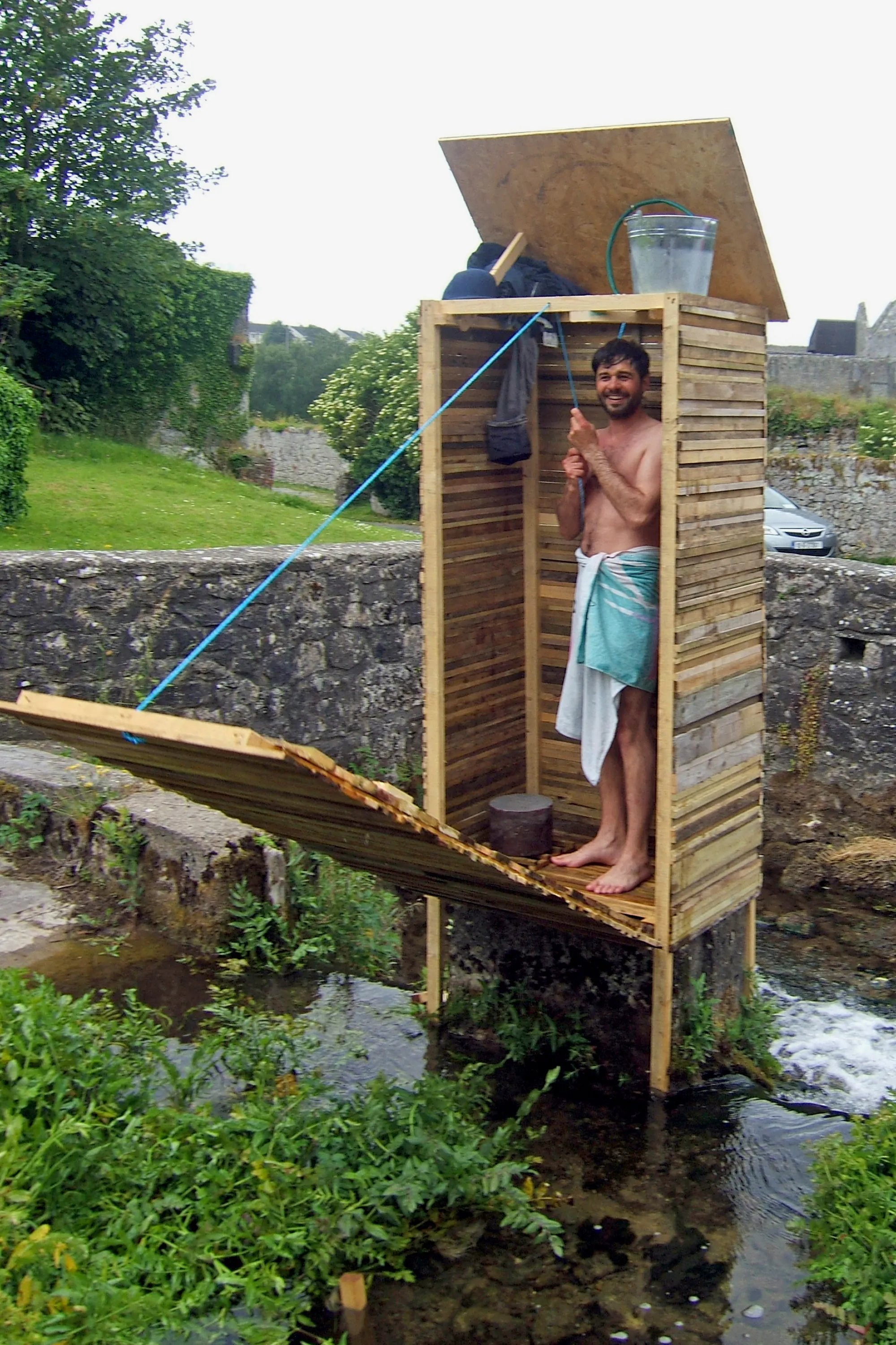 aiPotu’s (Anders Kjellesvik & Andreas Siqueland) Shower was located on the Clareen stream in the midst of Askeaton town, and offered open air bathing to the public through a sculptural installation made of recycled timber and featuring Norwegian Pine soap. Shower Shop, a display at Mary Moore’s shop, features some objects that reflect the innovation of aiPotu’s scheme.