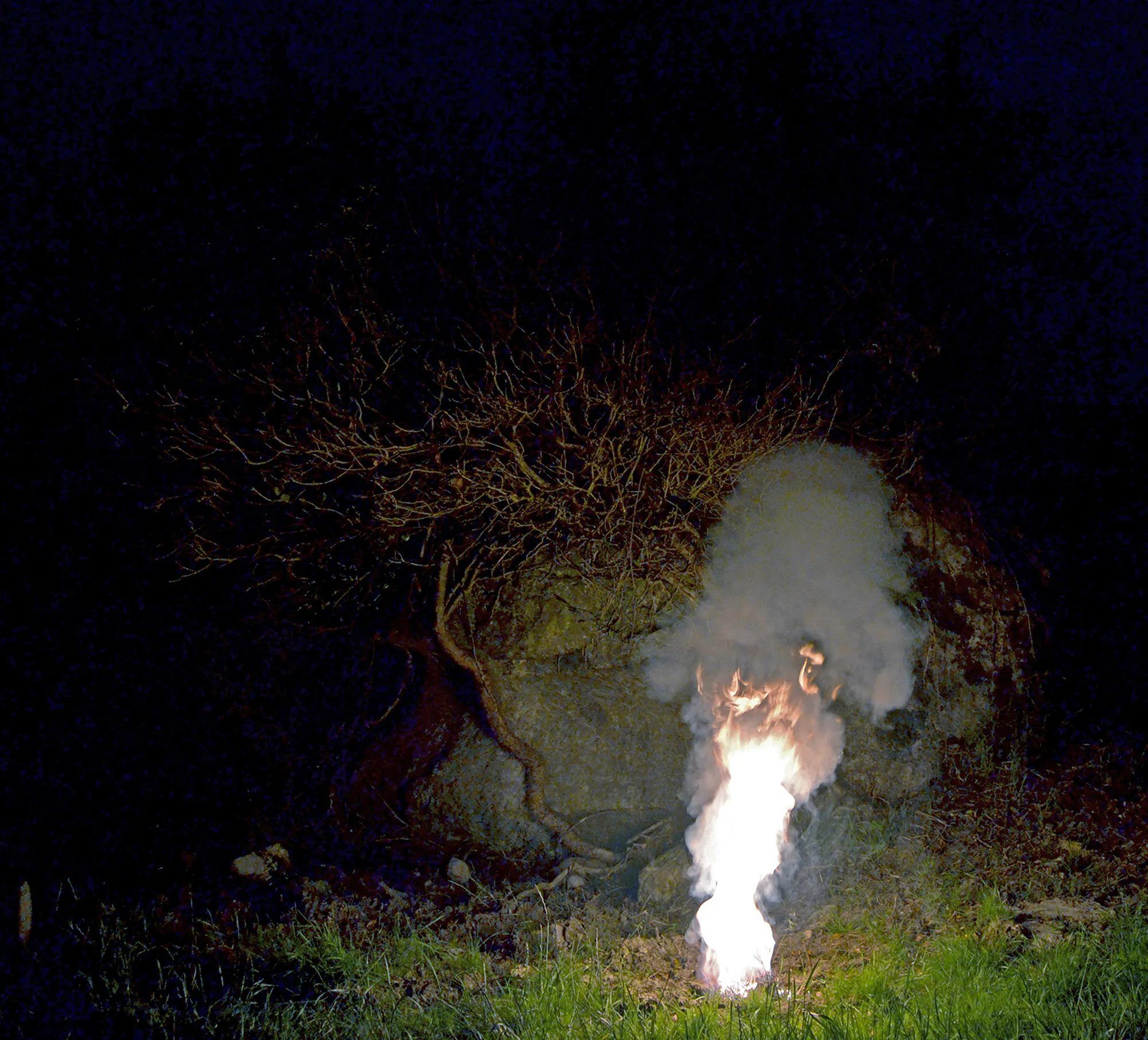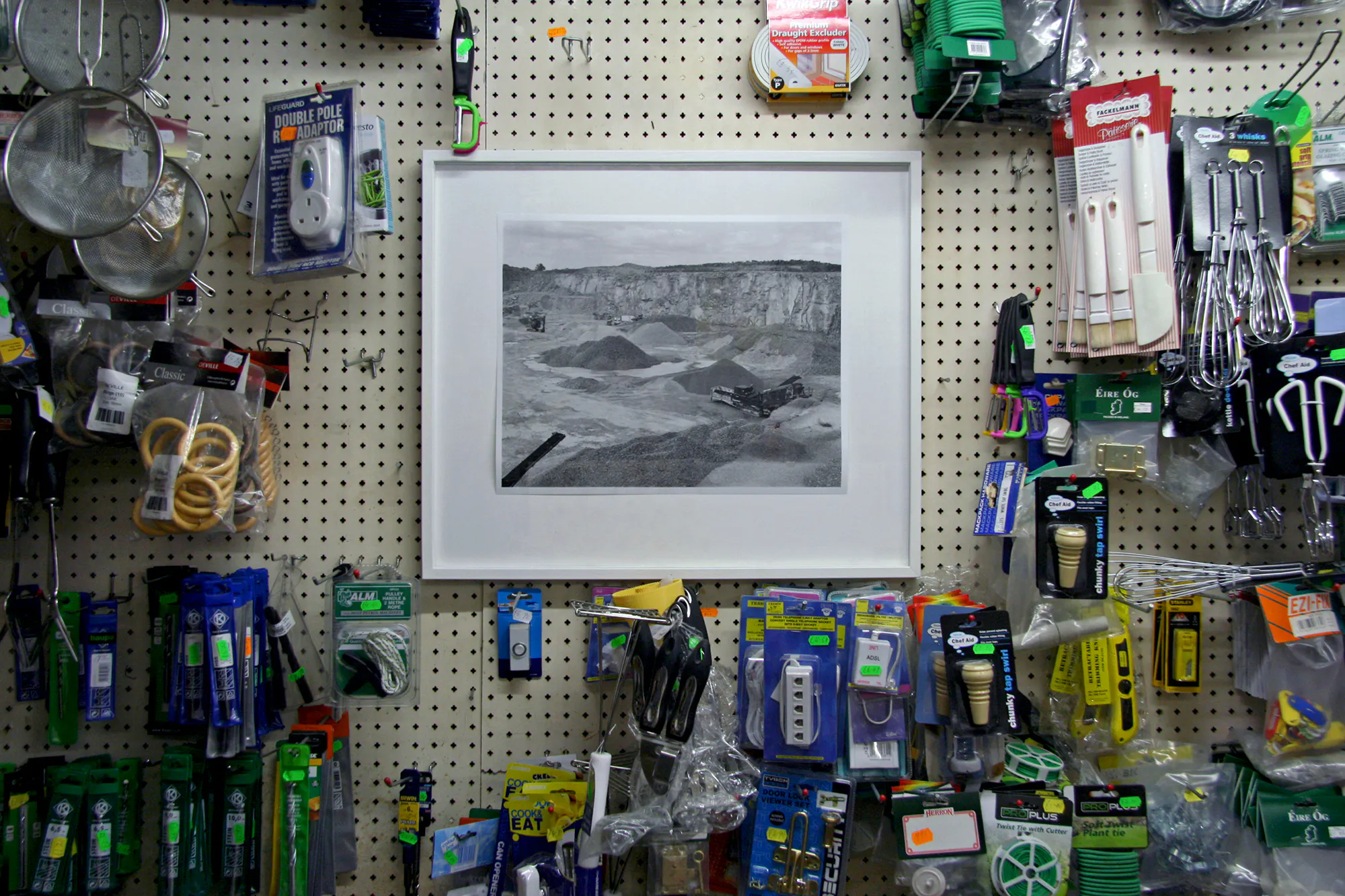 Marie Roux’s interests in geology and the various roles that stones and rock find around the Askeaton area resulted in Flying Stones, a series of photographs detailing a local limestone quarry, alongside documentation of a night-time encounter and pyrotechnic intervention with Samson’s Stone, a site often referred to in local folklore and located south of Askeaton. These images were displayed in Tierney Moran’s Hardware Store where they took on an almost utilitarian role, as if they could be used as tools, materials, or even adhesives to measure, split or hold together Askeaton itself.