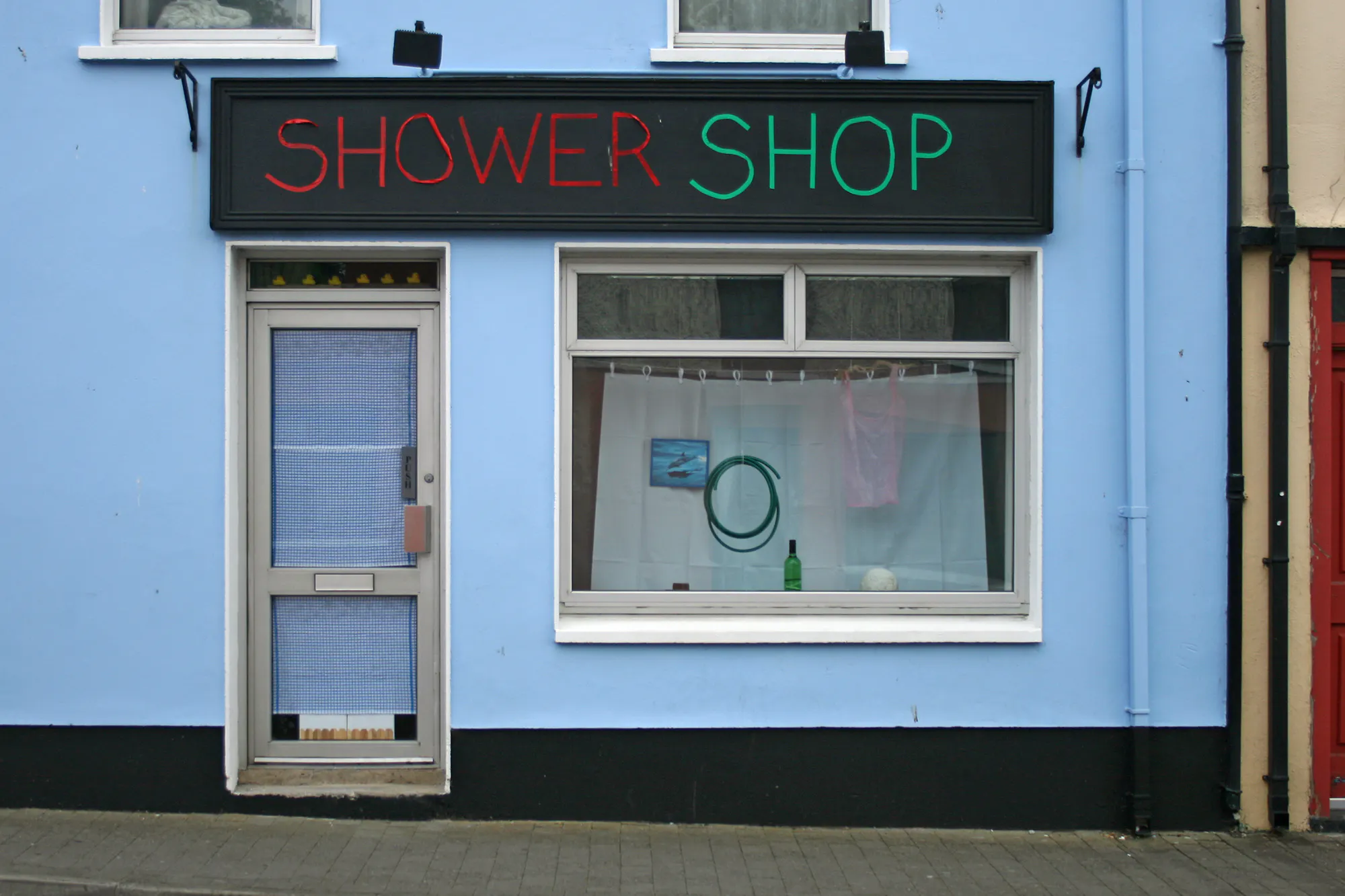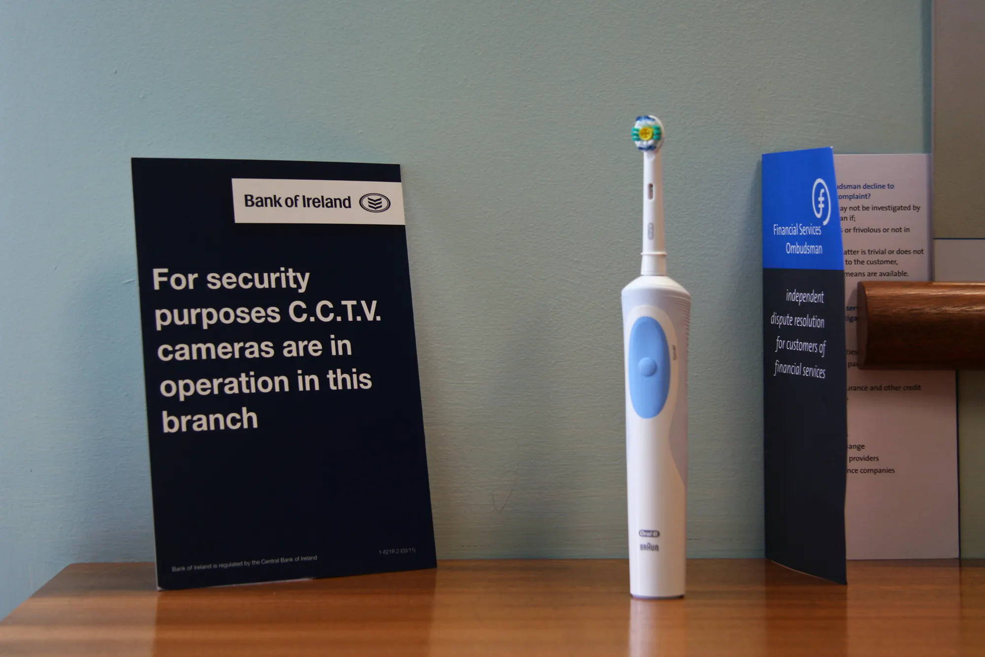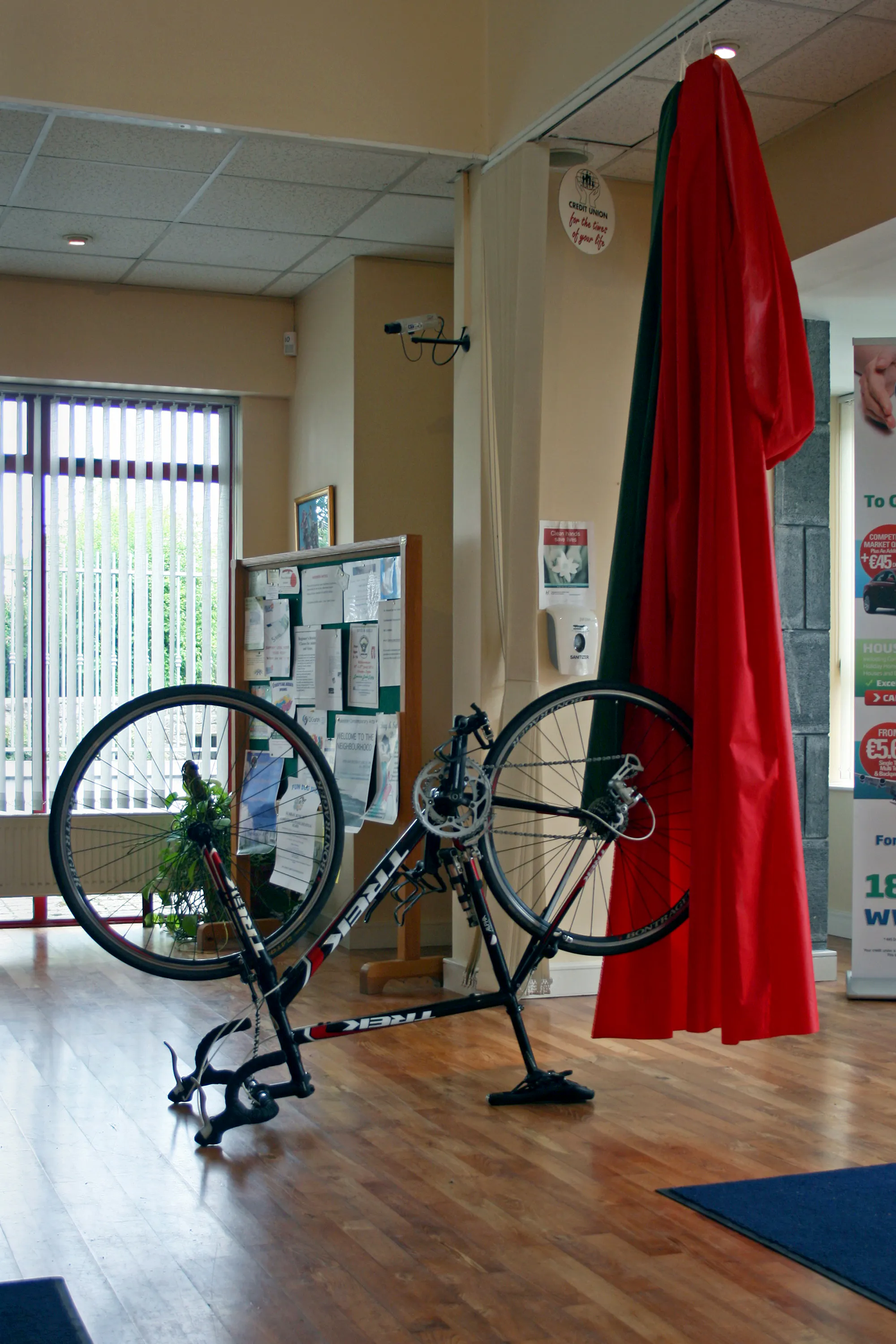 In eleven locations throughout the town, Freek Wambacq made An Askeaton Poem, placing objects used by Foley artists to synthesise sound for TV and film into the everyday fabric of Askeaton, creating unexpected juxtapositions through their presence and the language used to describe each work. Top to bottom: Earthslide in Bank of Ireland. Electric toothbrush; Gust of wind in Cois Sionna Credit Union. Nylon cloth, bicycle; Walking in Snow in the Tourist Information Office. Boxes of cornflour; Galloping horses in Ranahan’s Bar. Halved coconut shells.