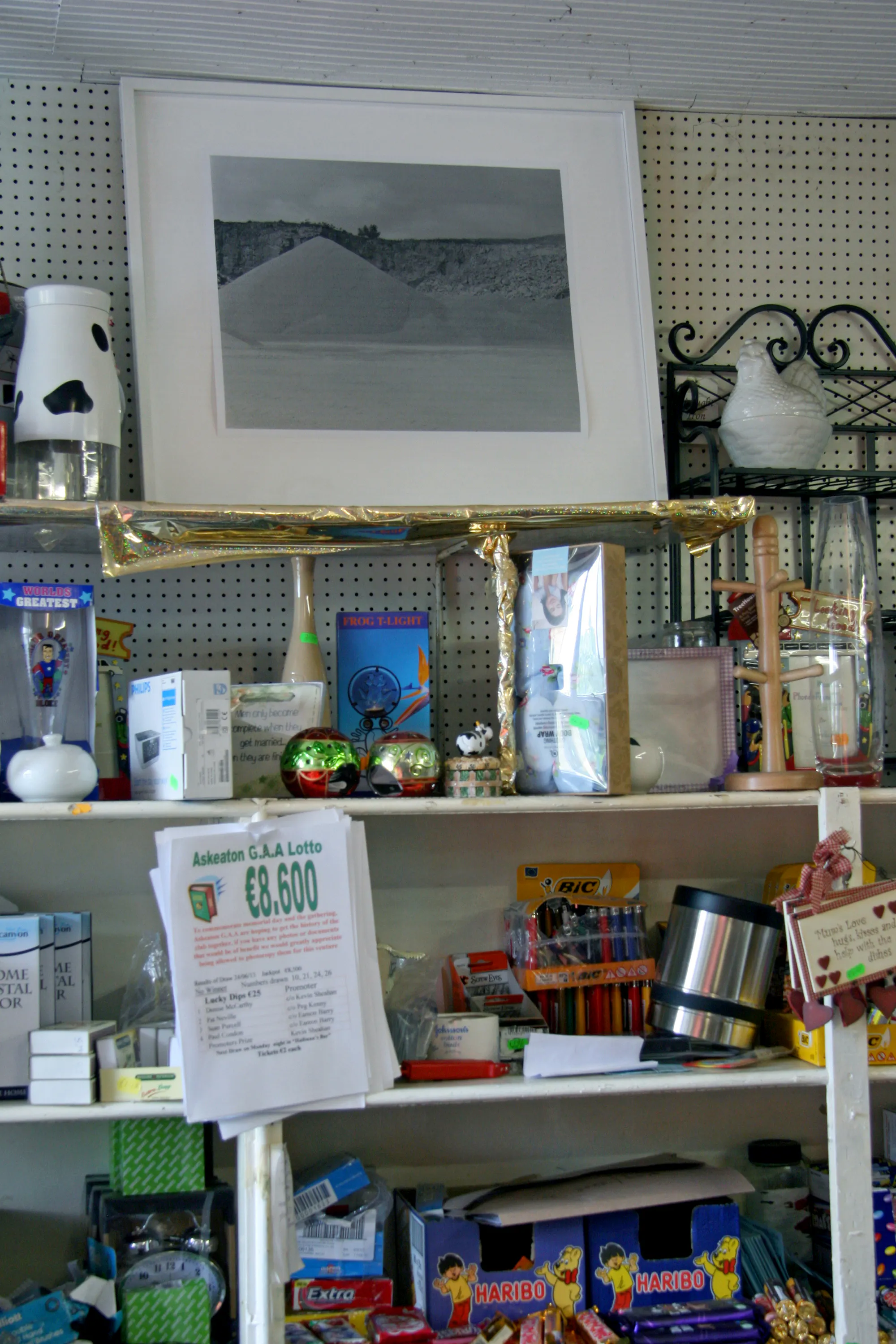 Marie Roux’s interests in geology and the various roles that stones and rock find around the Askeaton area resulted in Flying Stones, a series of photographs detailing a local limestone quarry, alongside documentation of a night-time encounter and pyrotechnic intervention with Samson’s Stone, a site often referred to in local folklore and located south of Askeaton. These images were displayed in Tierney Moran’s Hardware Store where they took on an almost utilitarian role, as if they could be used as tools, materials, or even adhesives to measure, split or hold together Askeaton itself.