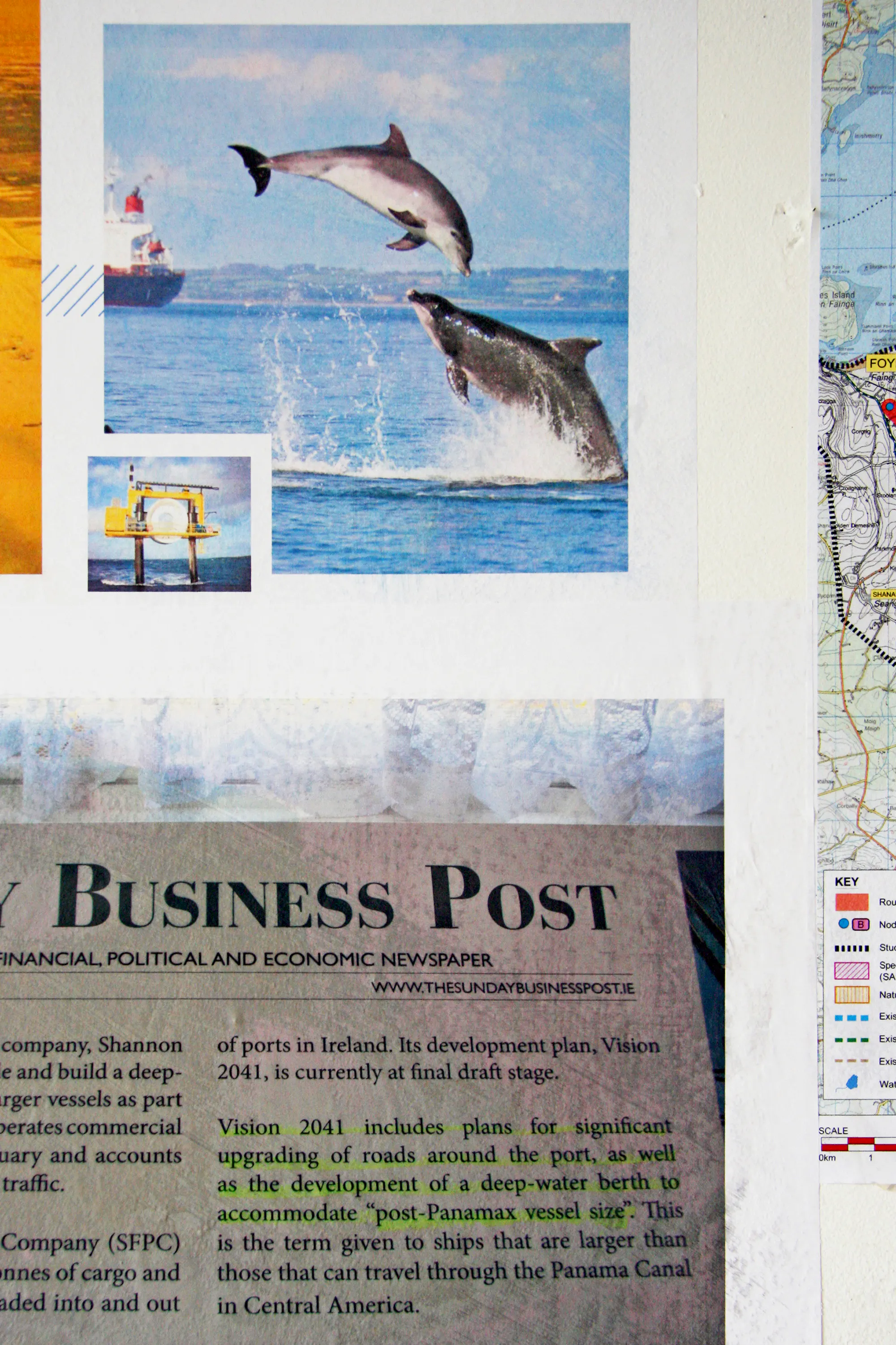 In Deirdre O’Mahony’s Public Works, the artist establishes an office in an empty shop in the town’s East Square. During opening hours, visitors can consult the artist and a compilation of documents tracing the hopes and residues of mainly unimplemented infrastructural and industrial development policies of the area. Ecovillage settlements, road development, rail networks and factories funded by speculative foreign investment all feature, accompanied by a videowork tracing the history of Shannon Development, a now defunct regional quango that continues to haunt the managerial and bureaucratic regimes of the MidWest.
