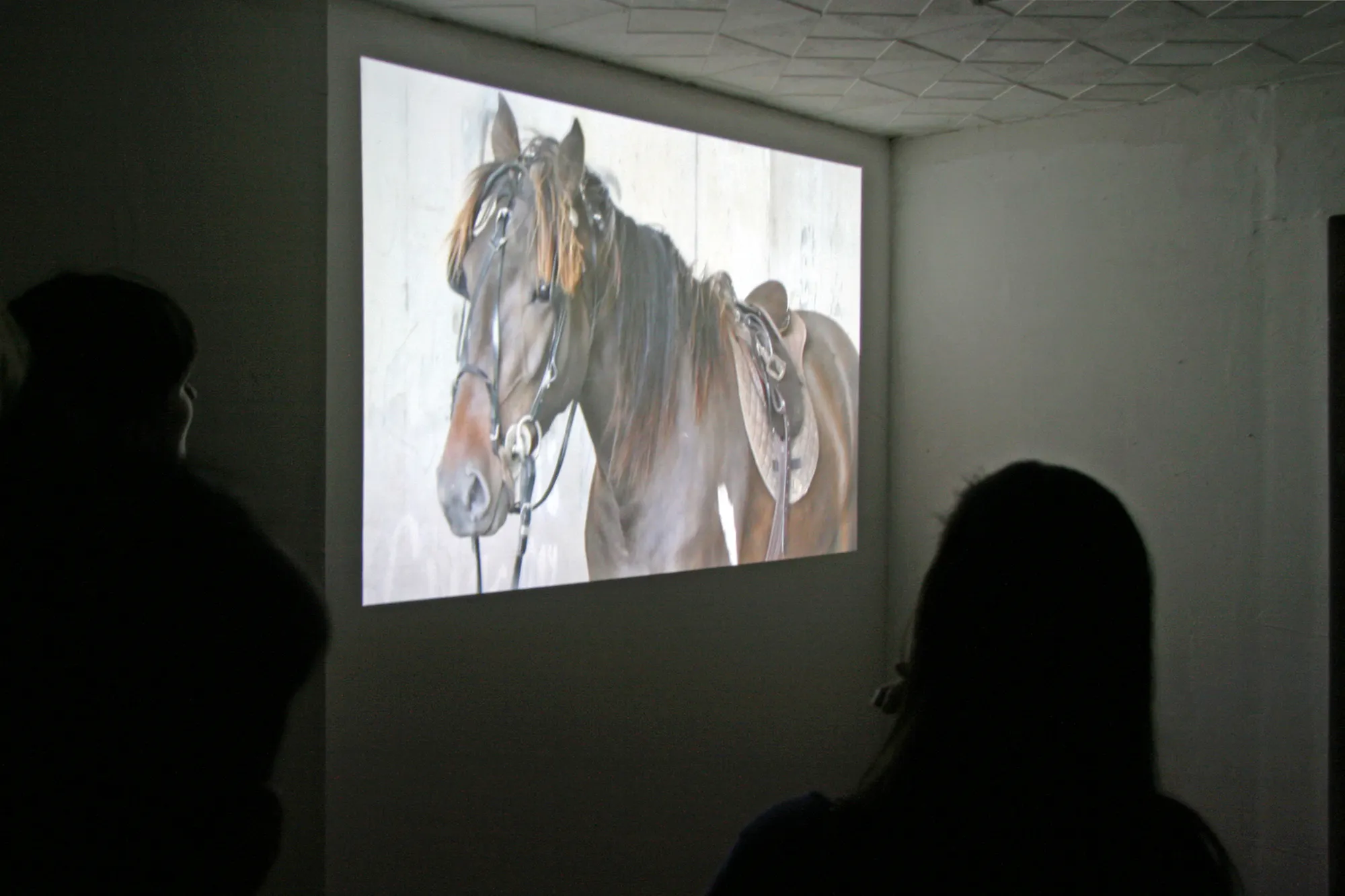 Maya Schweizer’s video installation acts, by the admission of the artist, as a kind of ‘construction site’, a montage of moving images and narrative throughout Askeaton and West Limerick. In a carefully constructed mise-en-scène, a saddled horse with an invisible ghostrider wanders through Askeaton’s historical ruins.