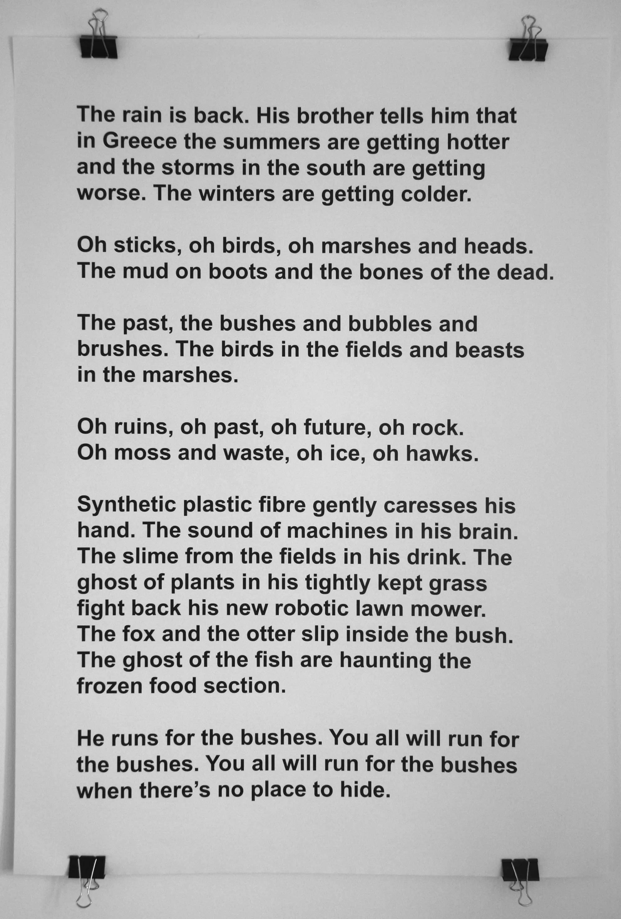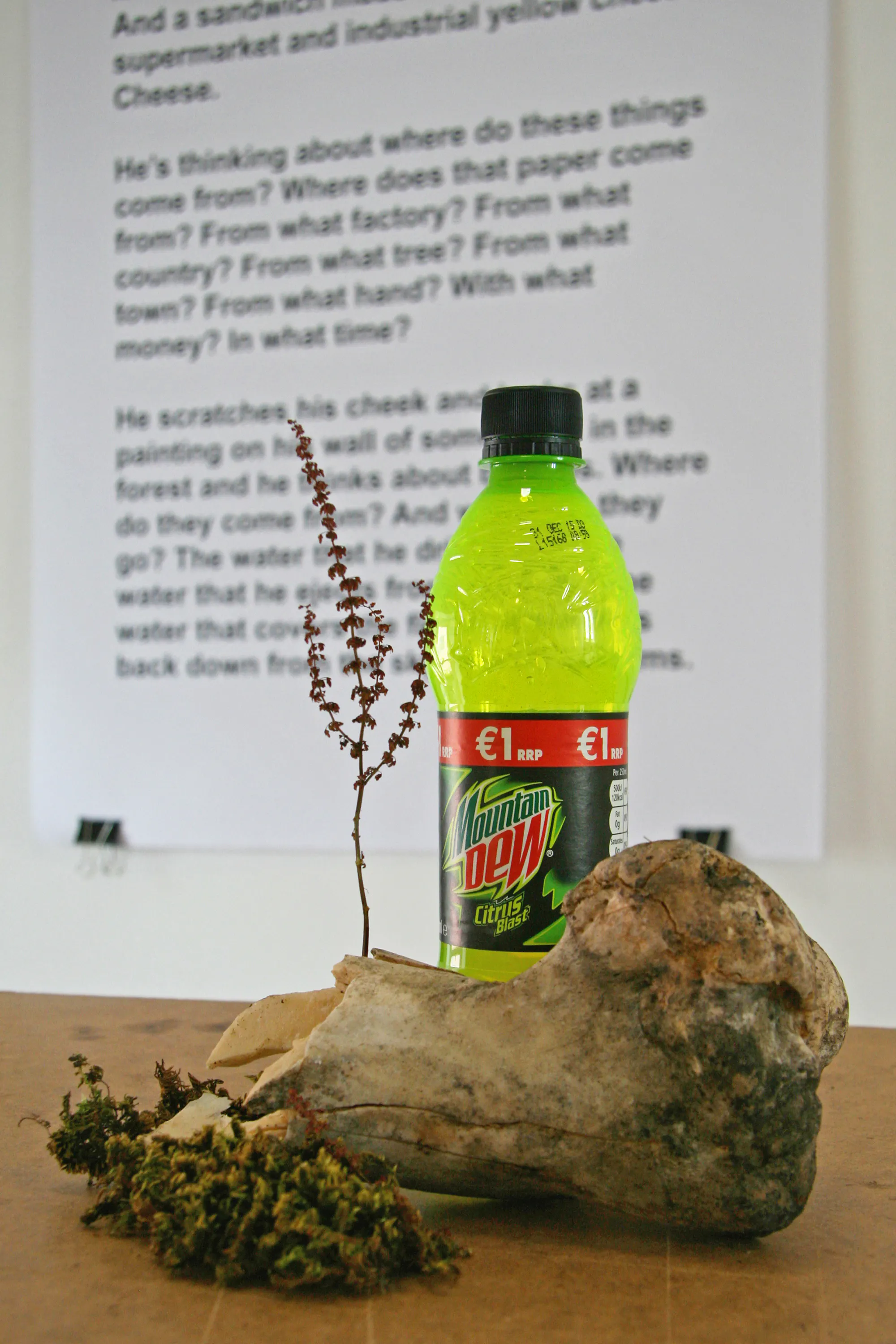 Quim Packard infiltrated and followed a local hunt around the Askeaton hinterland. Frantically running along riverbanks and over ditches to keep up with packs of dogs, minks and cunning otters who all escape to safety, Packard’s experience acted as a very literal form of fieldwork! A new artwork is presented through text, sculpture and sound at the Civic Trust and as an audio piece emanating from underneath a whitethorn bush. Its central character, told through a rambling narrative, is a seemingly isolated figure who desires a meaningful relationship with the objects and rituals surrounding him.