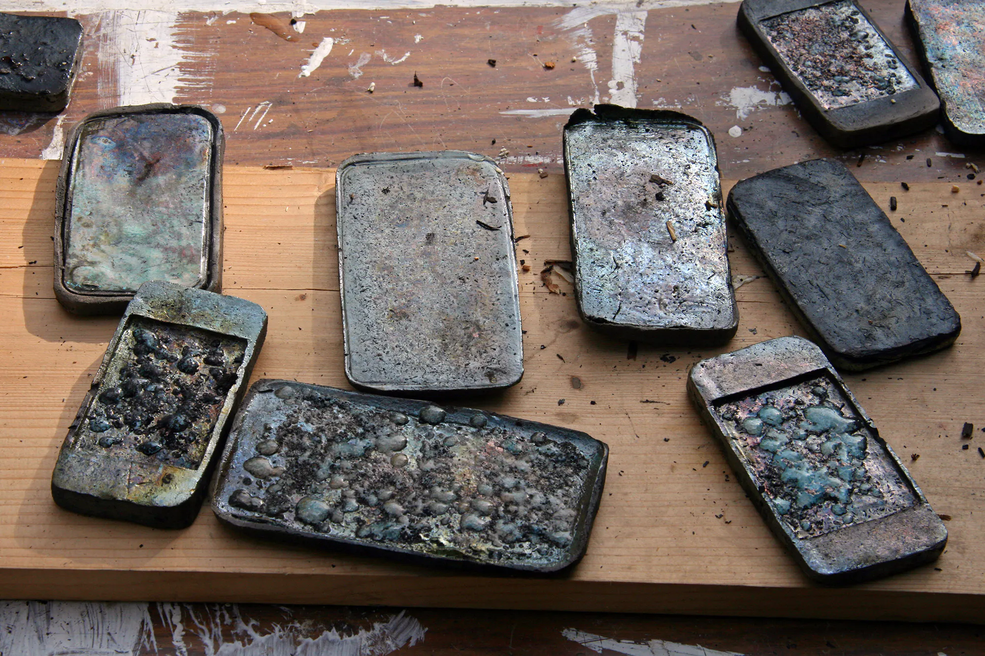 Sam Keogh’s ceramic smartphones, made by working closely with his father Brian, were prepared during a series of improvised Raku and pit kiln firings. Making a distinct comment on the malleability of form between the handheld and handmade, these phones don’t ring or function, rather they appear as fossilised versions of familiar Samsung or Apple products.