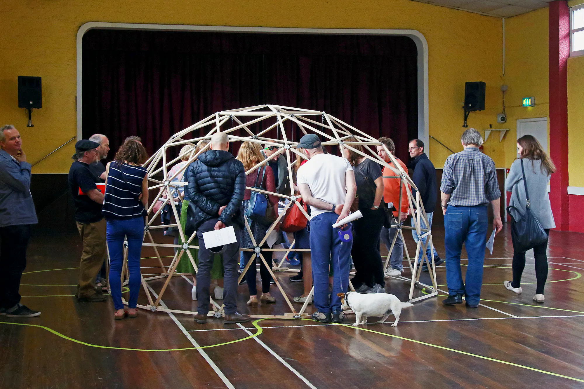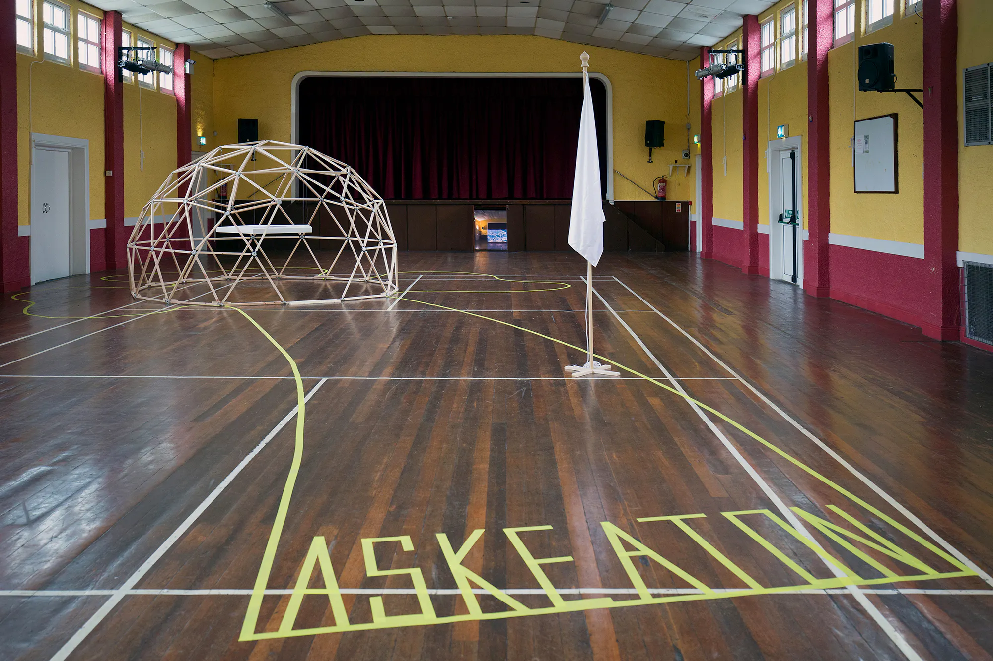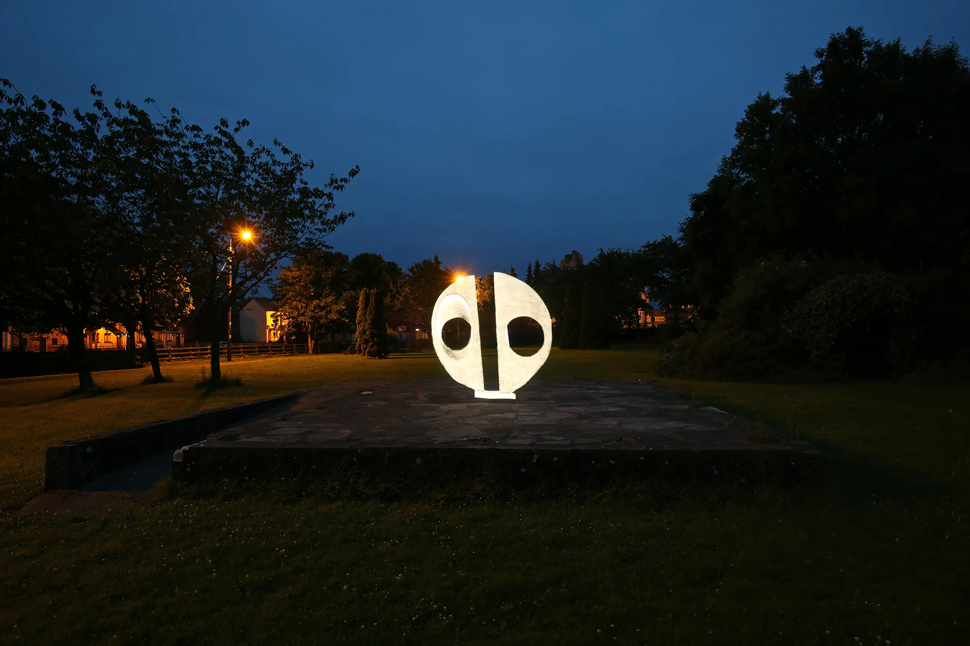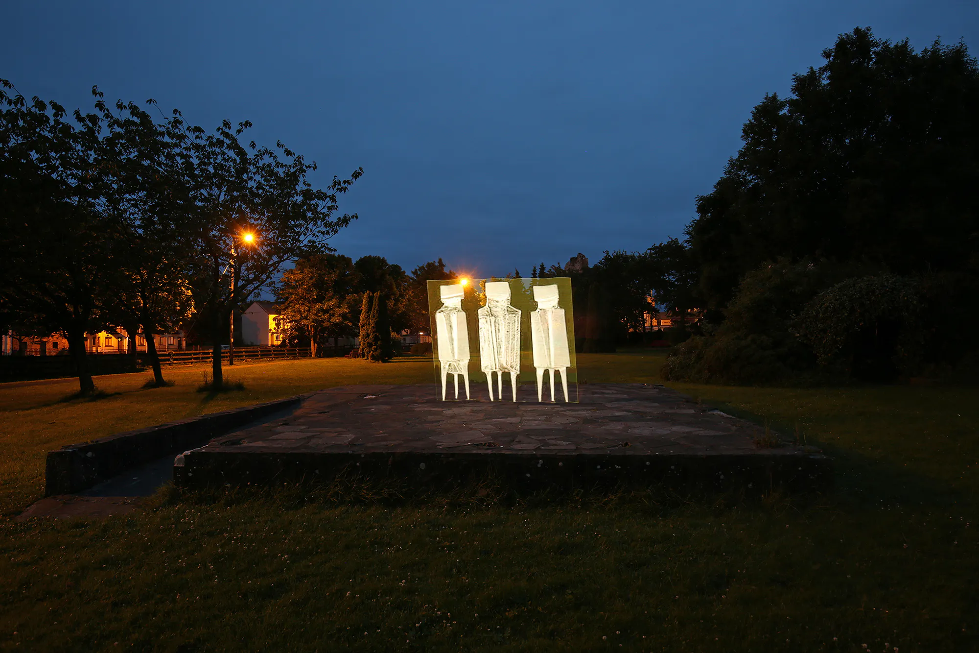Tina O’Connell and Neal White have collaborated to present a large-scale installation. Study for a Pavilion: Askeaton combines various elements of national identity and material culture to begin to imagine a pavilion dedicated to the life and shape of Askeaton itself. This expansive act incorporates a geodesic dome and a video re-imagining of Sean Keating’s now-destroyed mural from the 1939 World’s Fair in New York. In an accompanying series of digitally manipulated photographs, stolen and lost sculptures by Helen Chadwick, Henry Moore and Barbara Hepworth are transposed to appear as apparitions and ghostly figures at twilight in public spaces in Askeaton.