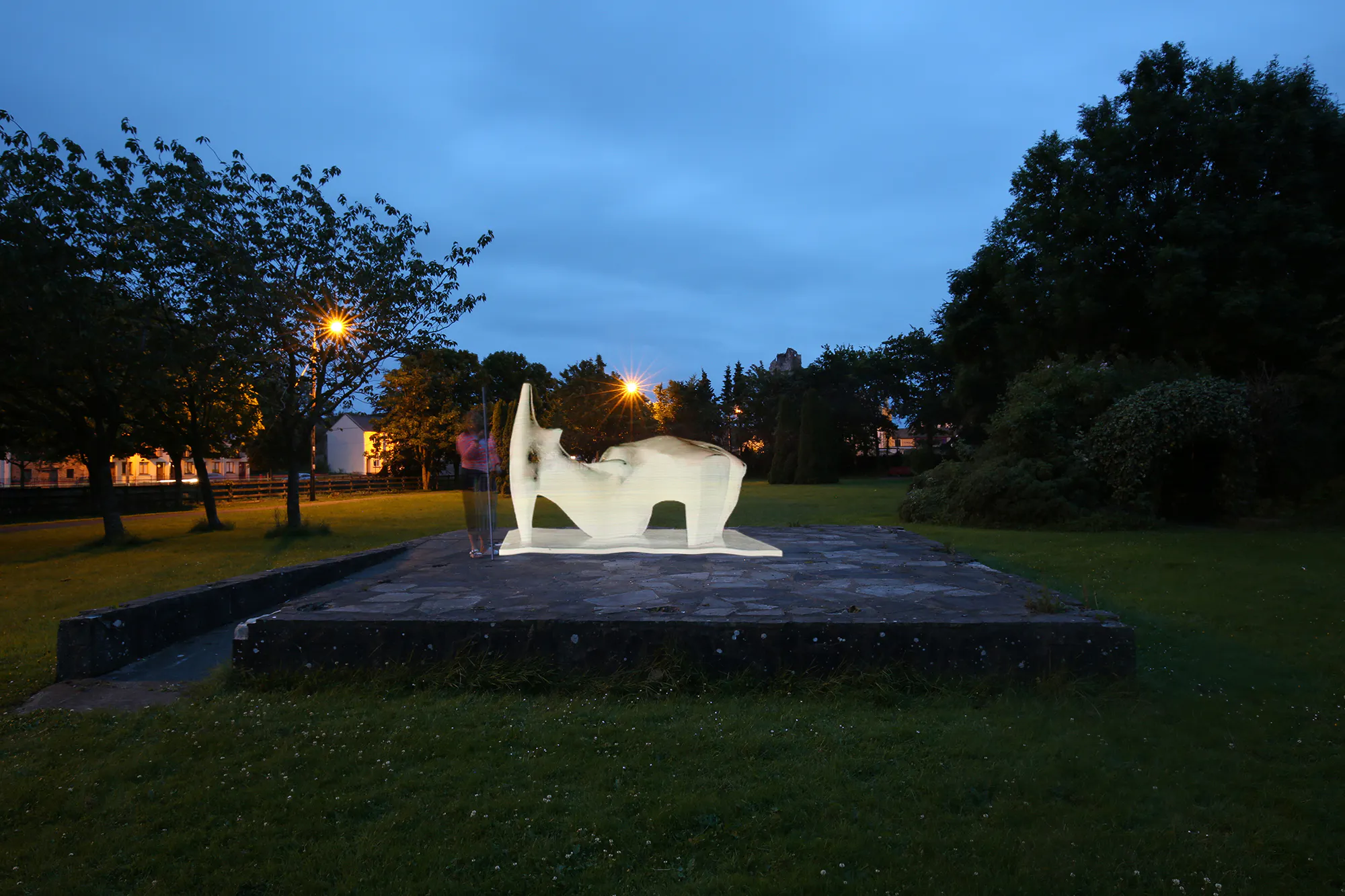 Tina O’Connell and Neal White have collaborated to present a large-scale installation. Study for a Pavilion: Askeaton combines various elements of national identity and material culture to begin to imagine a pavilion dedicated to the life and shape of Askeaton itself. This expansive act incorporates a geodesic dome and a video re-imagining of Sean Keating’s now-destroyed mural from the 1939 World’s Fair in New York. In an accompanying series of digitally manipulated photographs, stolen and lost sculptures by Helen Chadwick, Henry Moore and Barbara Hepworth are transposed to appear as apparitions and ghostly figures at twilight in public spaces in Askeaton.