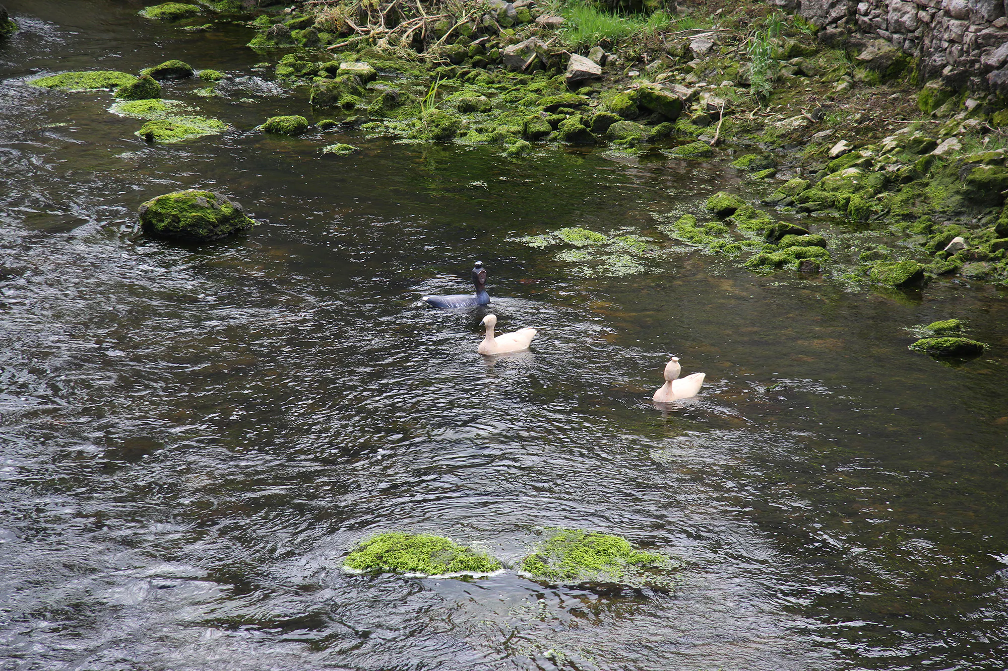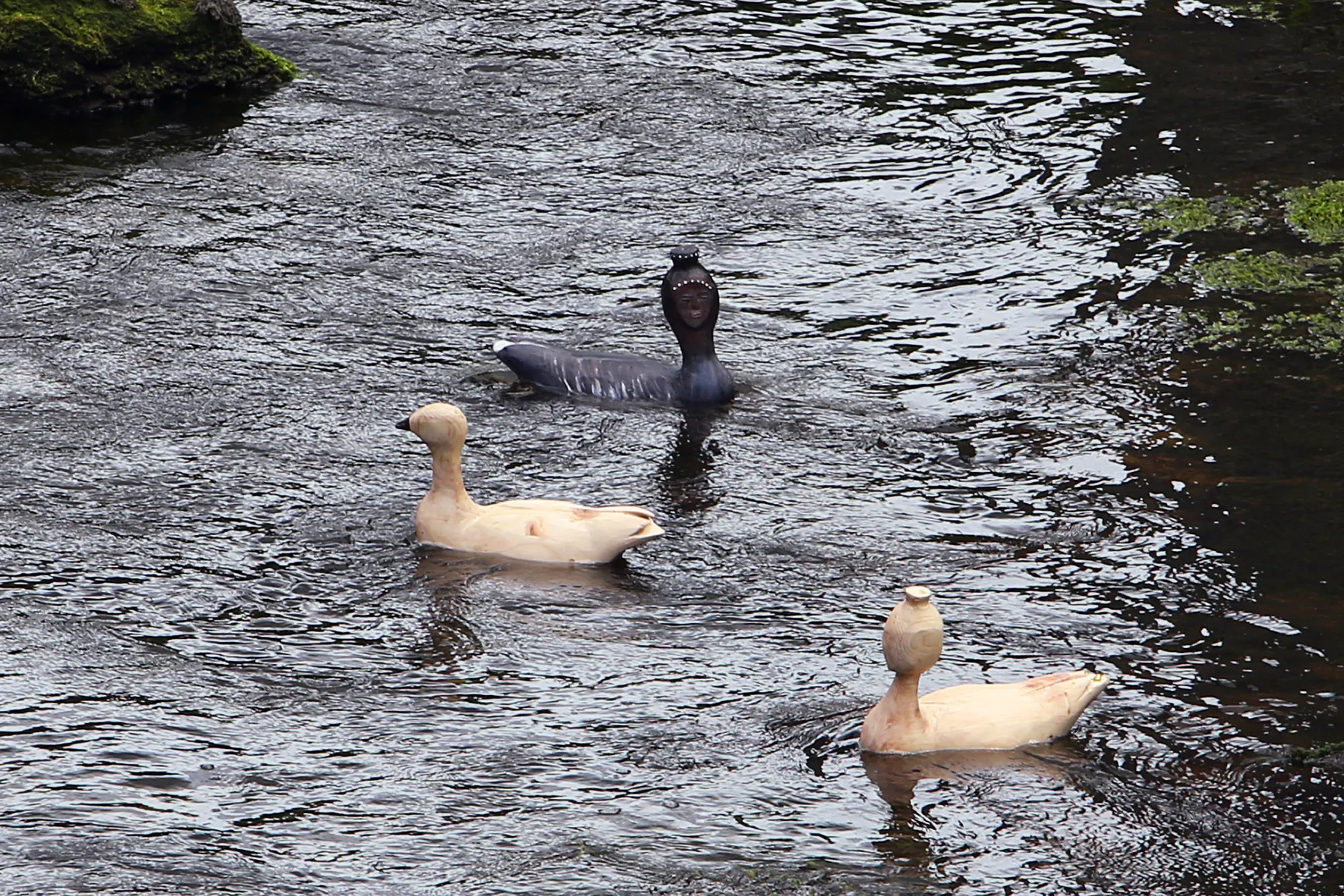 ‘A second work looks at rivers, water, mythology and conservation. Bird decoys, which often function to aid hunting, have been known on a few occasions to aid conservation projects, to lure birds back to an area, where populations have decreased due to habitat loss, pollution and climate change such as the river Deel. The bird decoys assist the birds to return to an area, as when they see other birds, it means it must be safe. In pagan Ireland water was always under the protection of a female spirit. Here these wooden birds, some hybrid beings representing female deities, float with the tide on the Deel.’