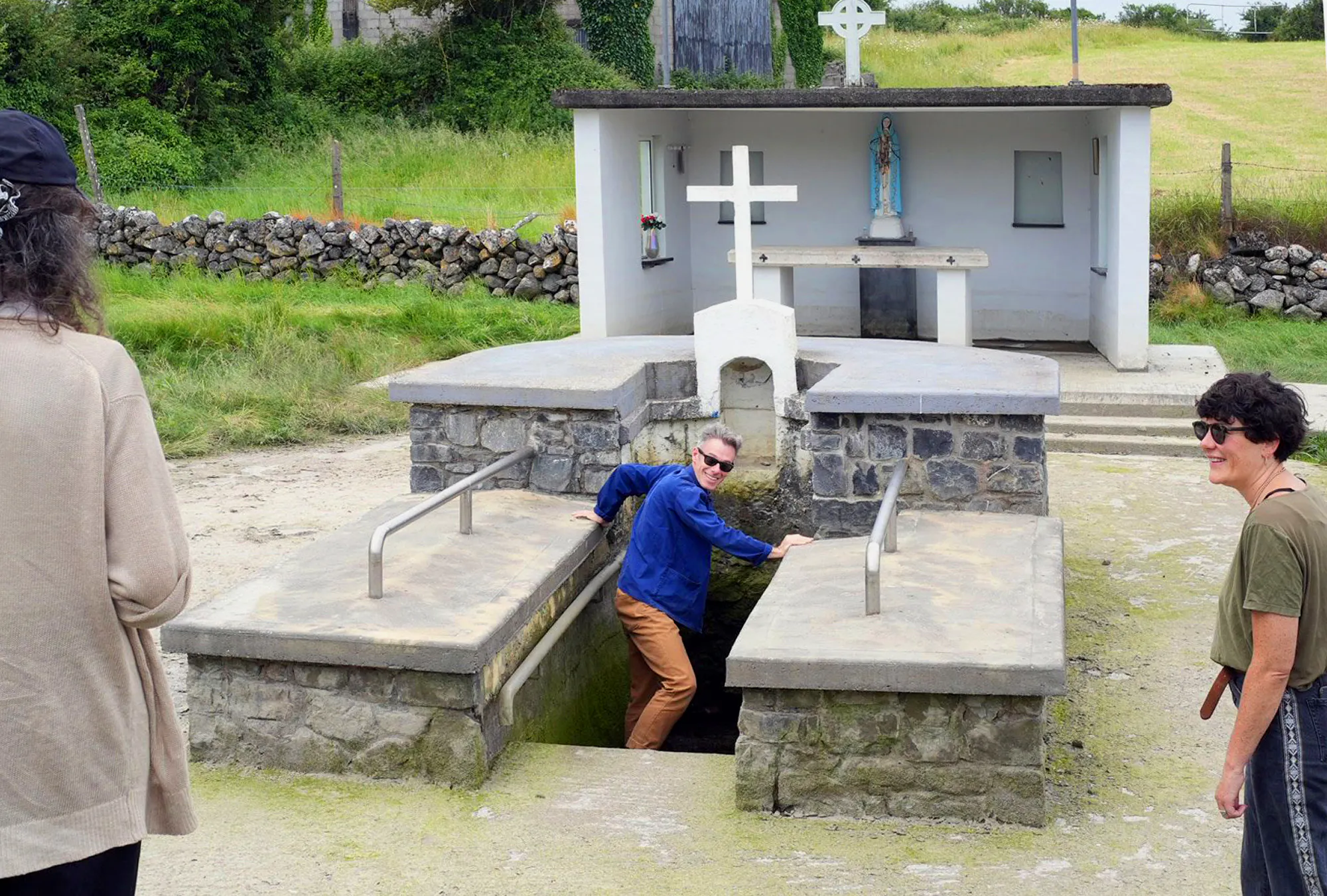 The holy well at Barrigone is positioned down a set of stairs on the shore of the Shannon. From the well, you can observe bird life, a small quarry that goes back a thousand years, and in the distance the Aughinish Alumina plant with its dystopian smoke stacks and reddish fields of discarded industrial waste.