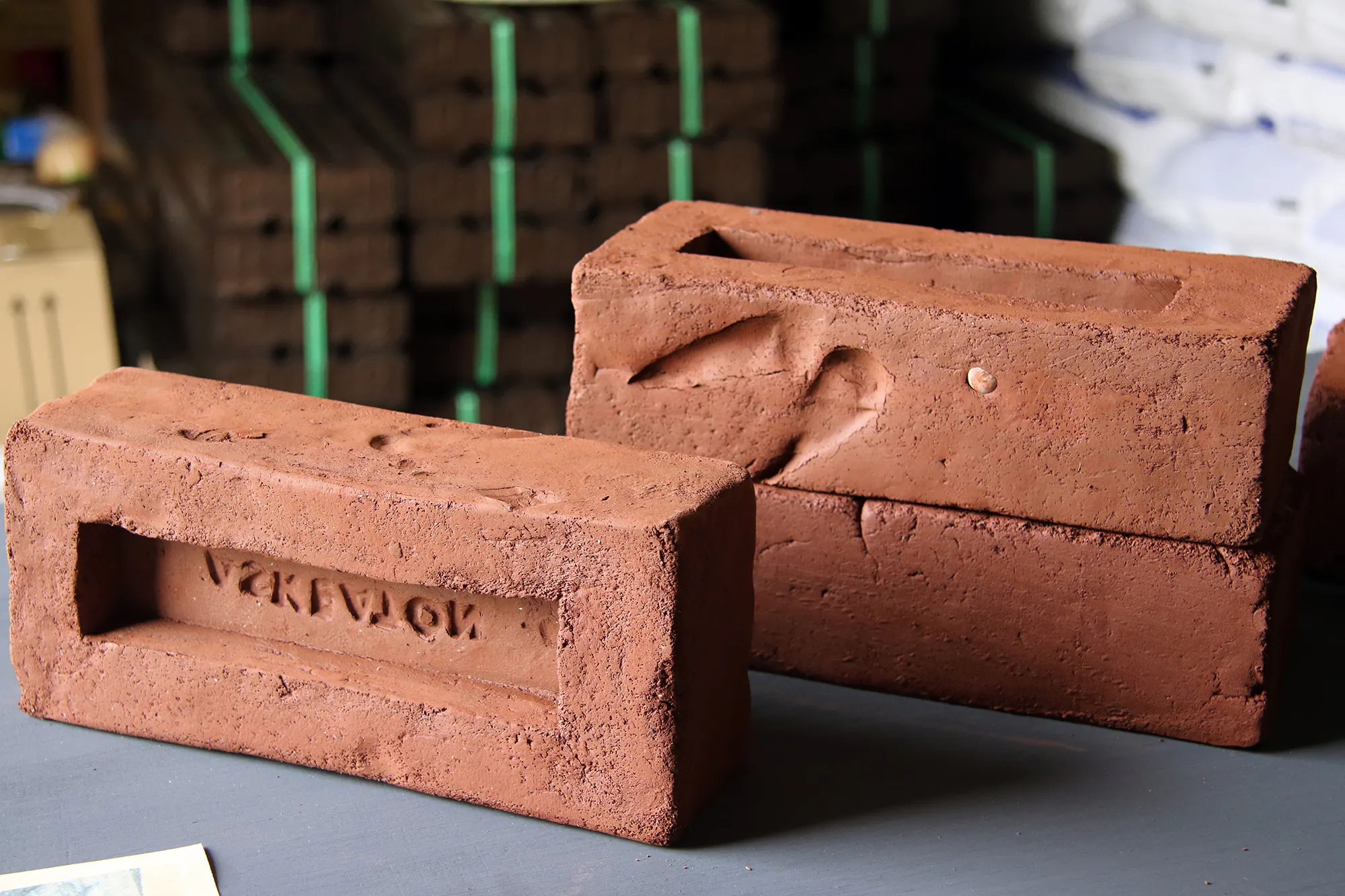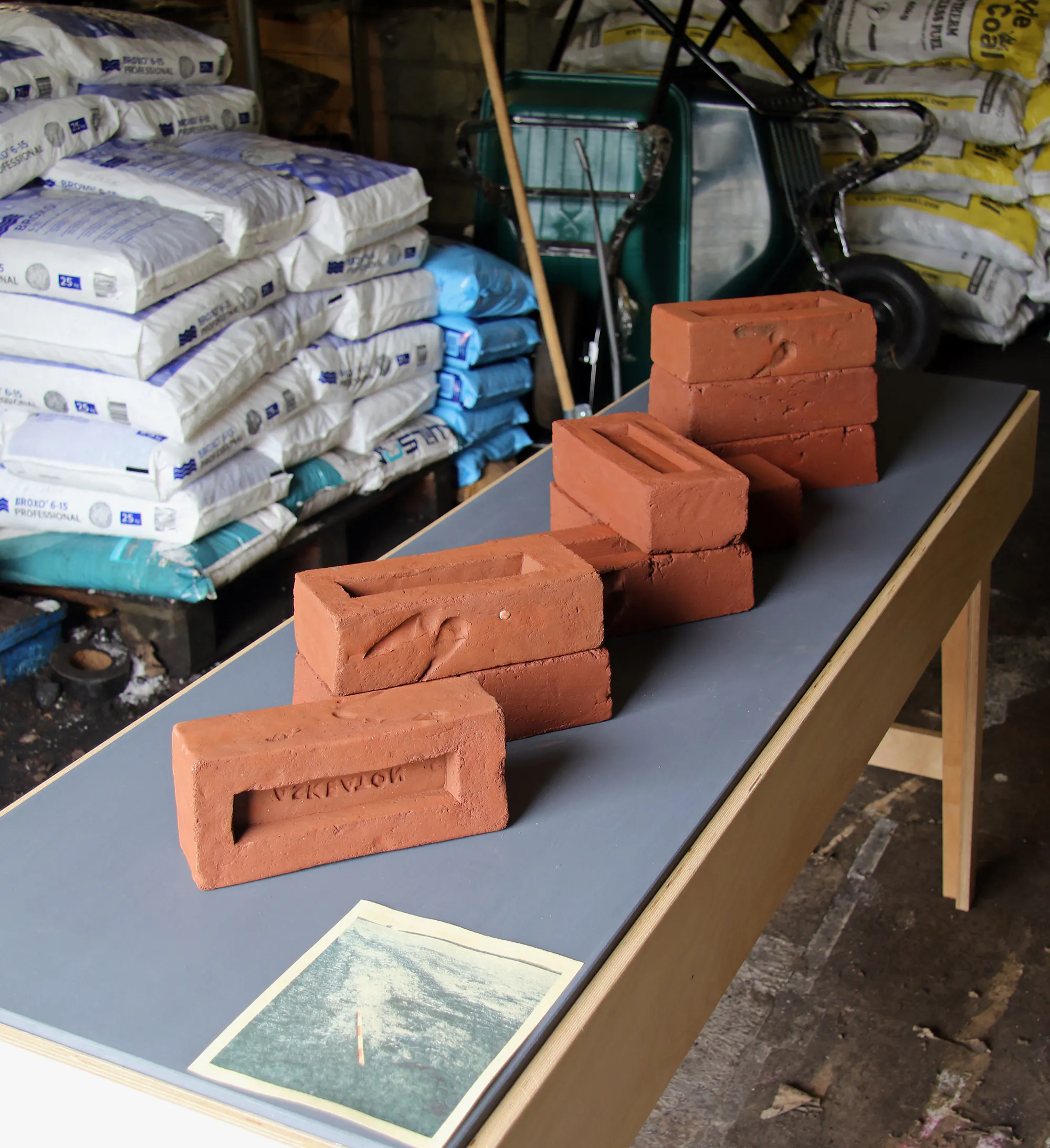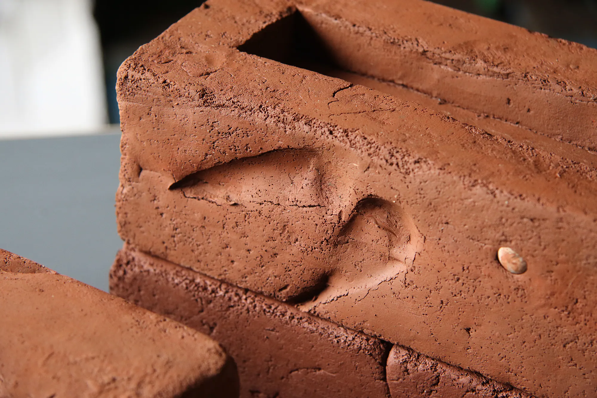 Bryony Dunne describes a series of bricks, made from river clay dug up at low tide on the Shannon Estuary, ‘Hybrid creatures found in mud, murky myths that merge from matter. While in Askeaton I collected river clay to think about how mud and clay hold traces of time trapped, where dead and living creatures are found, and are often preserved by it. I processed this clay, tinting it red to replicate bricks found at the Hellfire Club, located in the centre of Askeaton – a place where wealthy men were known to come together, to hunt, drink, gamble and share stories. I was told that some of the bricks found in the construction walls of the club contained deer or goat hove prints, once imprinted by animals when the bricks were left out to dry.