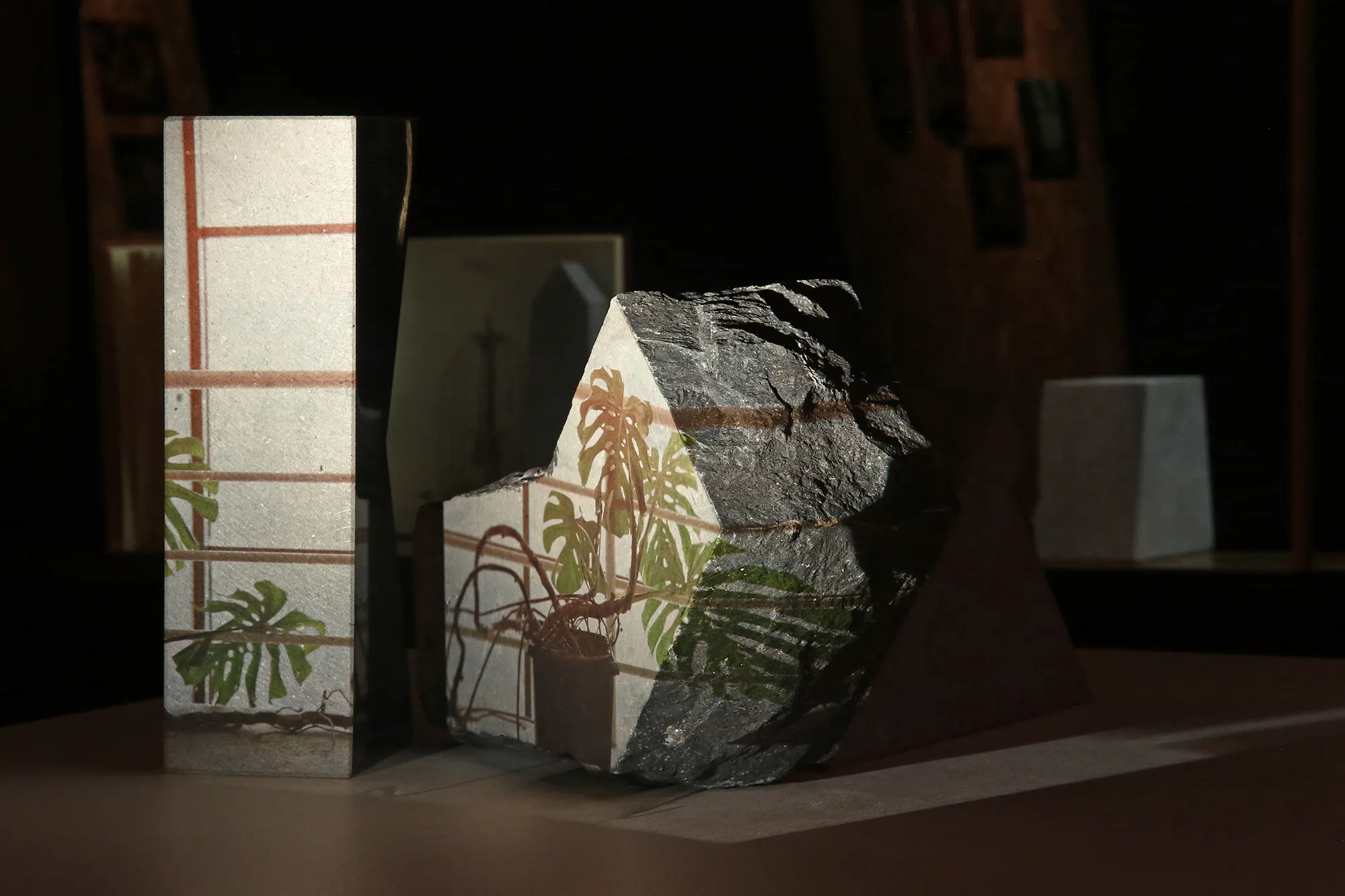 Stuart Whipps’ artworks make evident the consequences of human agency on the landscape, assembling seemingly unrelated intentions or actions into sharp agglomeration. Made during a recent residency at Lismore Castle Arts, McKeon Stone in Stradbally and Askeaton Contemporary Arts, a video follows the flight of African Sand Martens now nesting in holes created by quarrying stone in the Irish midlands. In turn, Whipps uses this stone to shape various sculptural forms borrowed from ‘Miscelanea Structura Curiosa’ a surreal and sometimes grotesque 18th century book on garden design by Birr’s Samuel Chearnley, juxtaposed with an image of plants found in corporate offices at the Rusal Aughinish bauxite refinery, Ireland’s largest industrial, and ever-controversial, site of lax environmental regulation located on the Shannon Estuary.