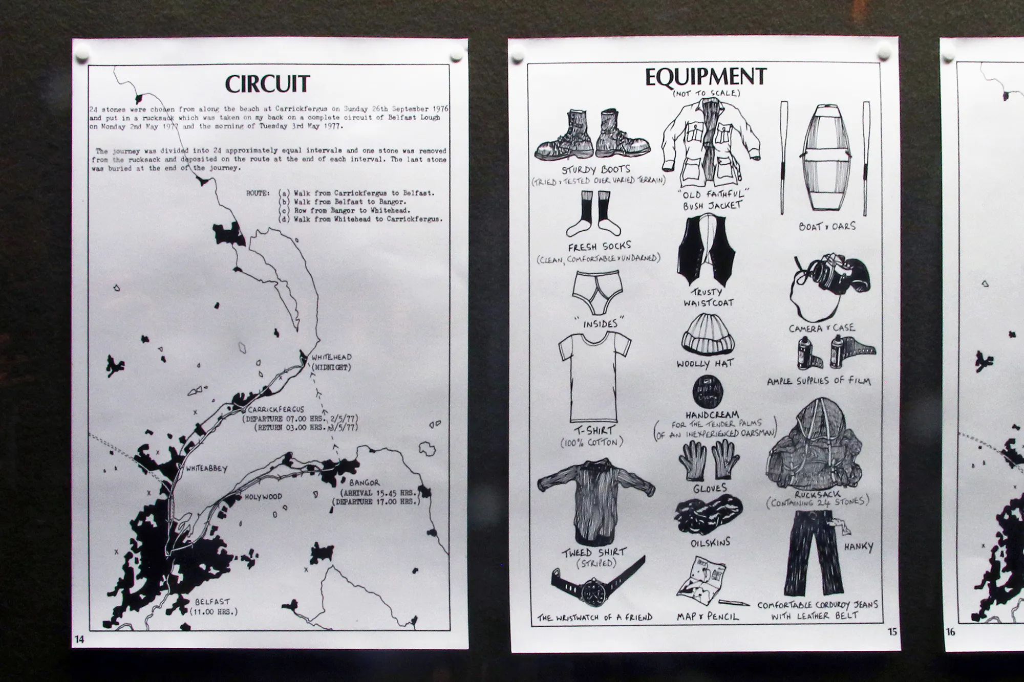 A selection of conceptually-led projects from 1977 by John Carson were also exhibited, each accentuating new experimental geographies around Belfast and its hinterland, involving the moving of stones, a bespoke signalling system and the subtle evocation of a telepathic relationship between three friends facilitated by DJ Handi of local station Radio Downtown.