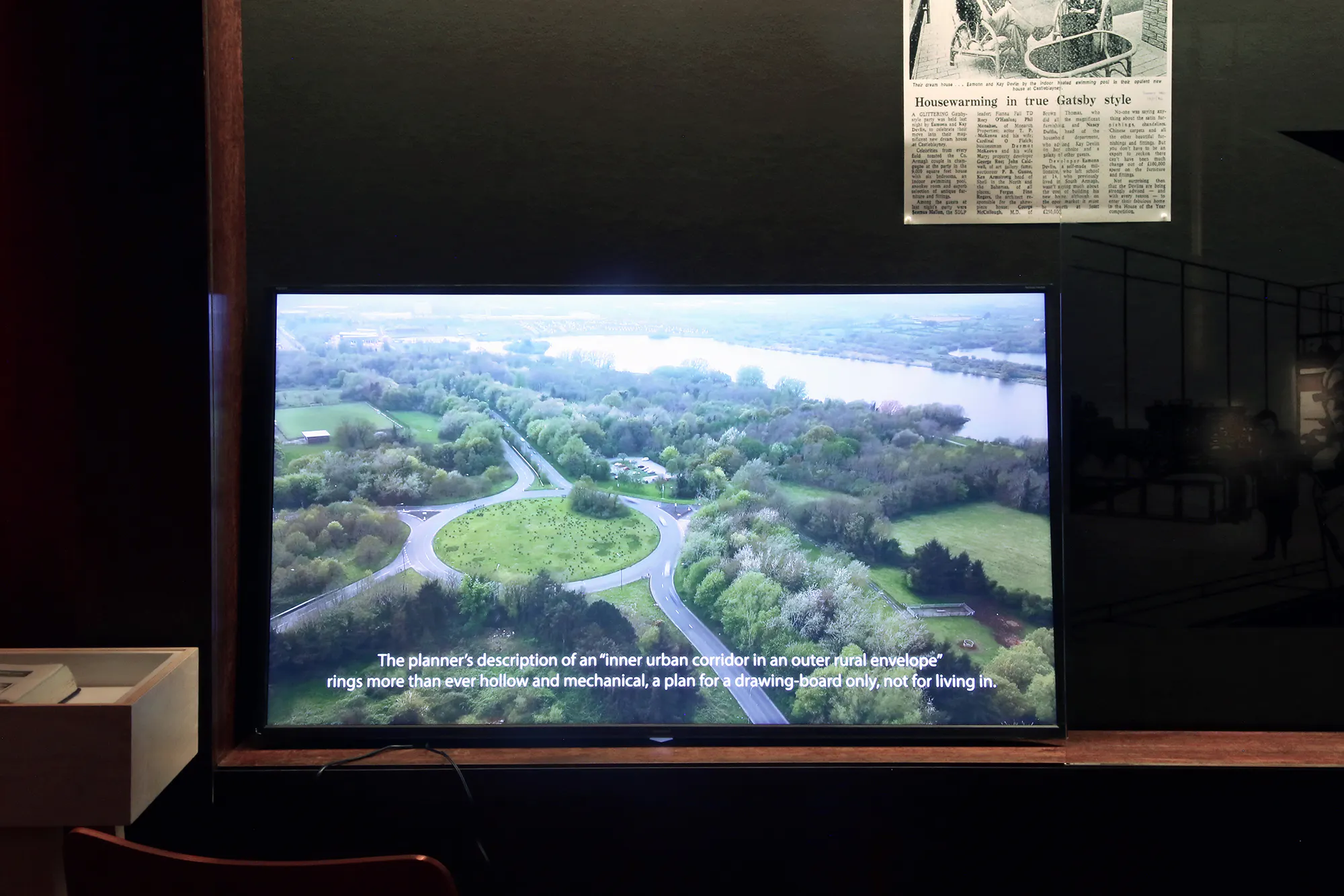 Fiona Marron’s Island beyond an Island is a mediation on human yearning to build, both as acts of confinement and liberation. Marron seems to preserve such desires in a surreal or dreamlike state, as if their potential far outweighs their actual realisation. Alongside newspaper clippings and imagery culled from the archive, her video work investigates the idiom of new town building, with a special emphasis on Craigavon, a planned town in Armagh built since 1965.