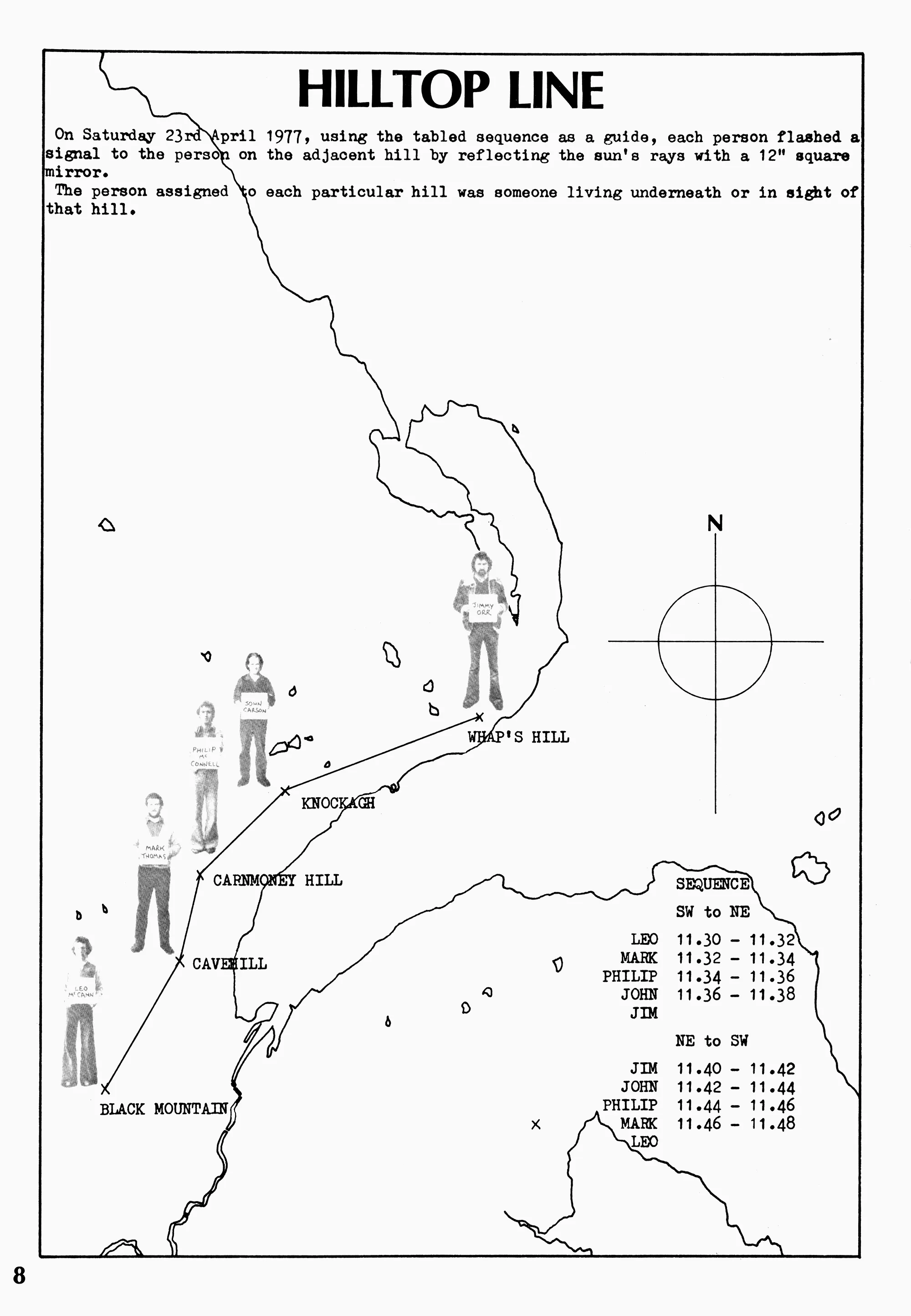 A selection of conceptually-led projects from 1977 by John Carson were also exhibited, each accentuating new experimental geographies around Belfast and its hinterland, involving the moving of stones, a bespoke signalling system and the subtle evocation of a telepathic relationship between three friends facilitated by DJ Handi of local station Radio Downtown.