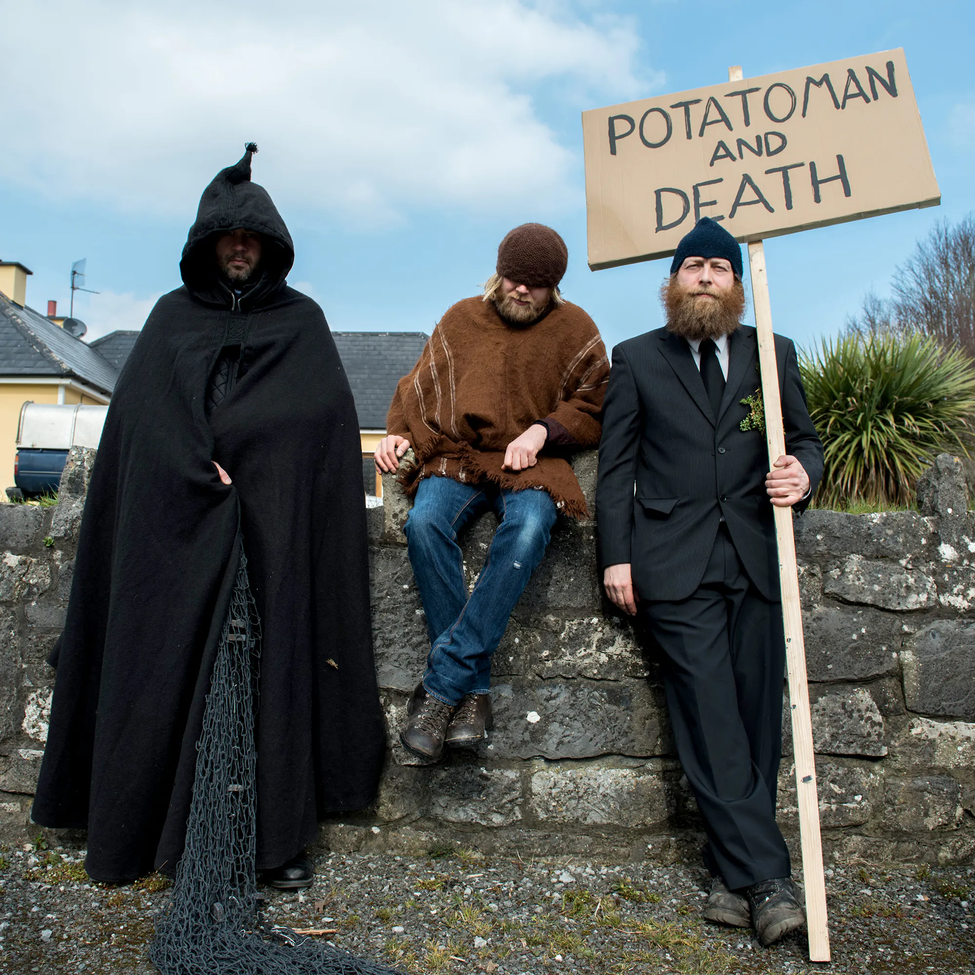 In 2016 Askeaton welcomed aiPotu (that’s utopia backwards with a capital P), the collaborative work of Norwegian artists Anders Kjellesvik and Andreas Siqueland. Their sculptures and performances often involve absurd and surreal interventions and so their project, Potatoman and Death, featured invented characters that played out a drama weaving in and out of the parade, and ending with a ceremonial burial ritual involving the planting of potatoes in a field at the back of the local supermarket. A small brass plaque installed at the recycling centre nearby now alludes to these actions, placed there in the spirit of their wanderings.