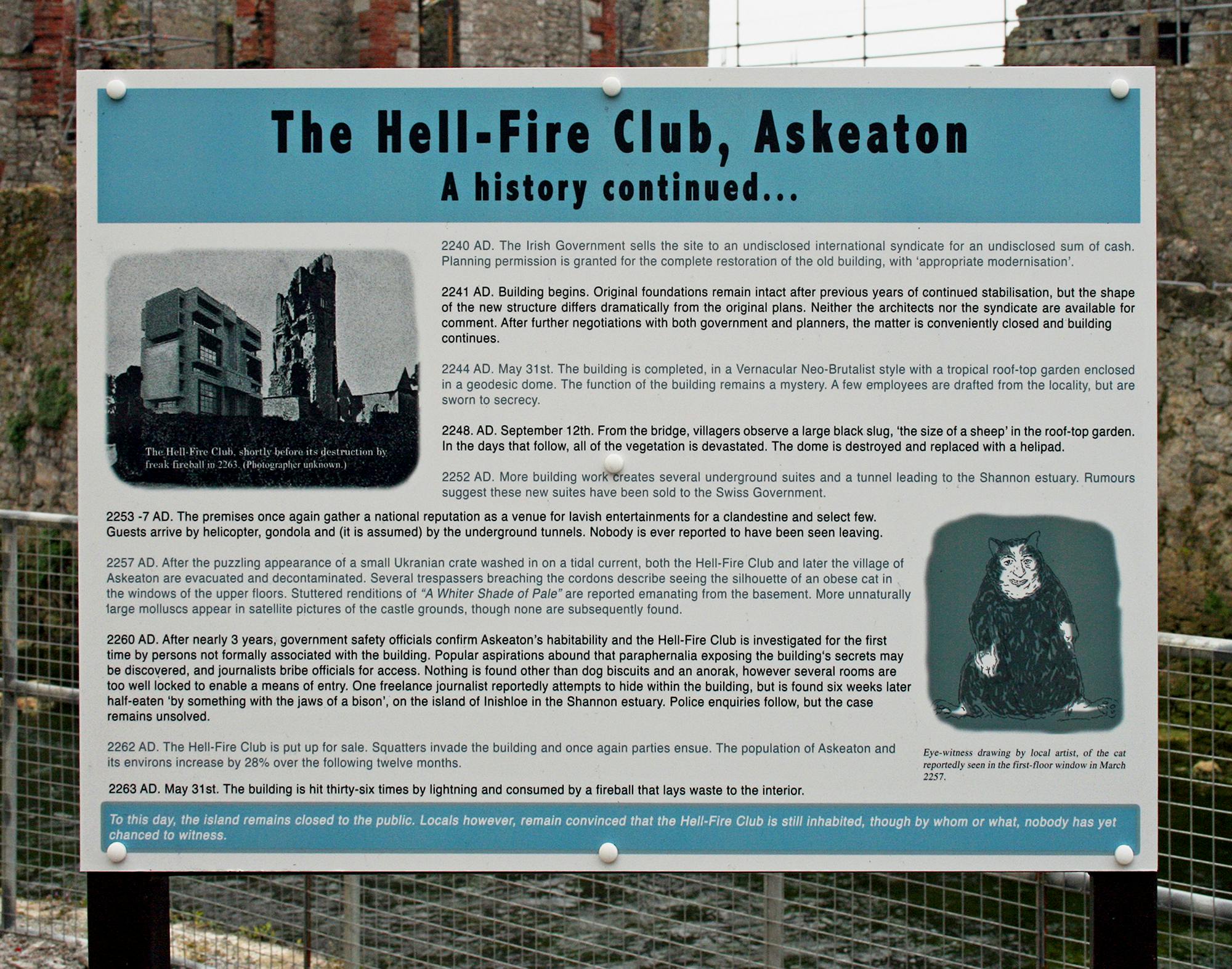 ‘Askeaton was a strategic river crossing where the bodies of inhabitants were defended by a notable castle and their souls by Franciscan brethren whose friary stands close by. The village has been reduced in strategic importance by the building of a bypass and a new bridge but follow the signpost on the main road, charming houses, a riverside walk and the towering ruins of fortress and friary. There is an information centre in the square and, by the riverside below in the castle, a signboard of the rarest kind. It says nothing of the past or present but predicts happenings in Askeaton in the distant future. Between 2240 and 2263AD, a succession of horrible happenings are to occur, terminating in the destruction of the castle by thirty six lighting strikes and a fireball…’