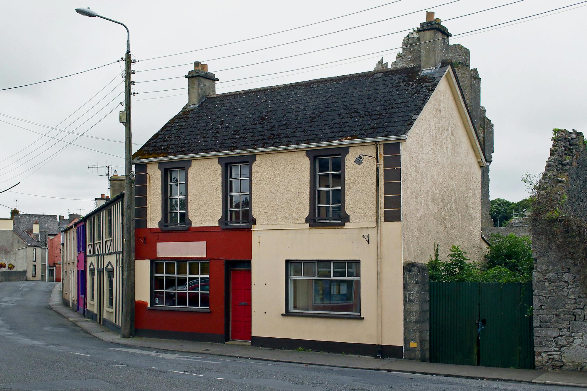 In 2016, Ramon Kassam placed a strip of white paint and thumbtacks along the edge of a building in Askeaton’s West Square, subtly turning its facade, by Kassam’s admission, into an enormous two-storey high painting!