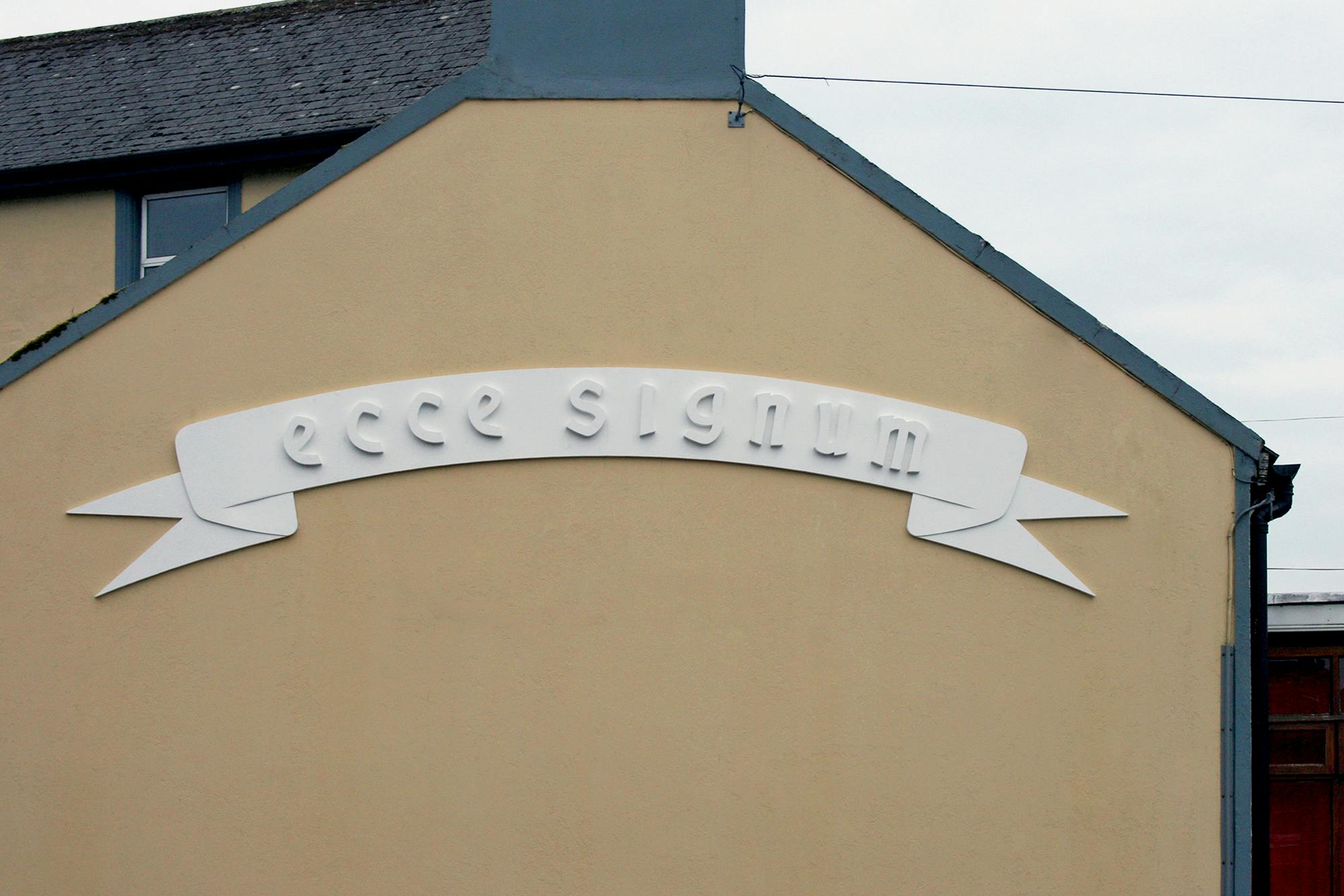 Sean Lynch's A Glossolalia appears upon a gable end in Askeaton’s main square. Referencing the traditions of artisan stuccowork seen throughout Limerck and southwest ireland, a humourous inscription in Latin can be seen. For a detailed decoding of what's been said, see Patrick Comerford's writing on A Glossolalia here.