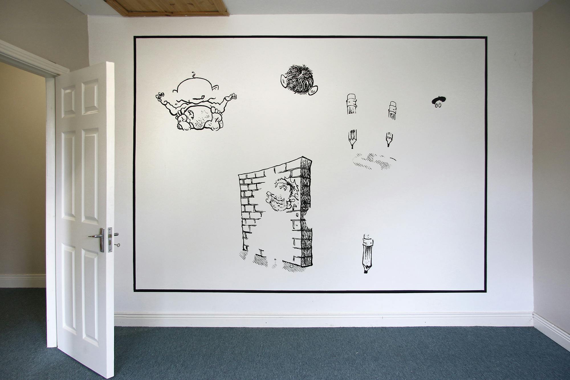 Jorge Satorre fragments a drawing made especially for him by cartoonist Martyn Turner throughout four rooms in an empty building on Church Street. Satorre asked Turner, a well-known satirist whose work appears in the Irish Times almost every day, to make a cartoon not about current affairs or today’s news but rather about himself. Satorre describes the building as a metaphor for Martyn Turner’s head, and walking through its rooms act as a poetic journey through Turner’s thoughts and life.