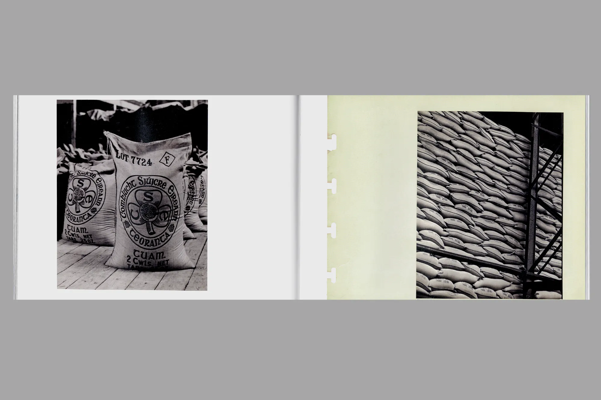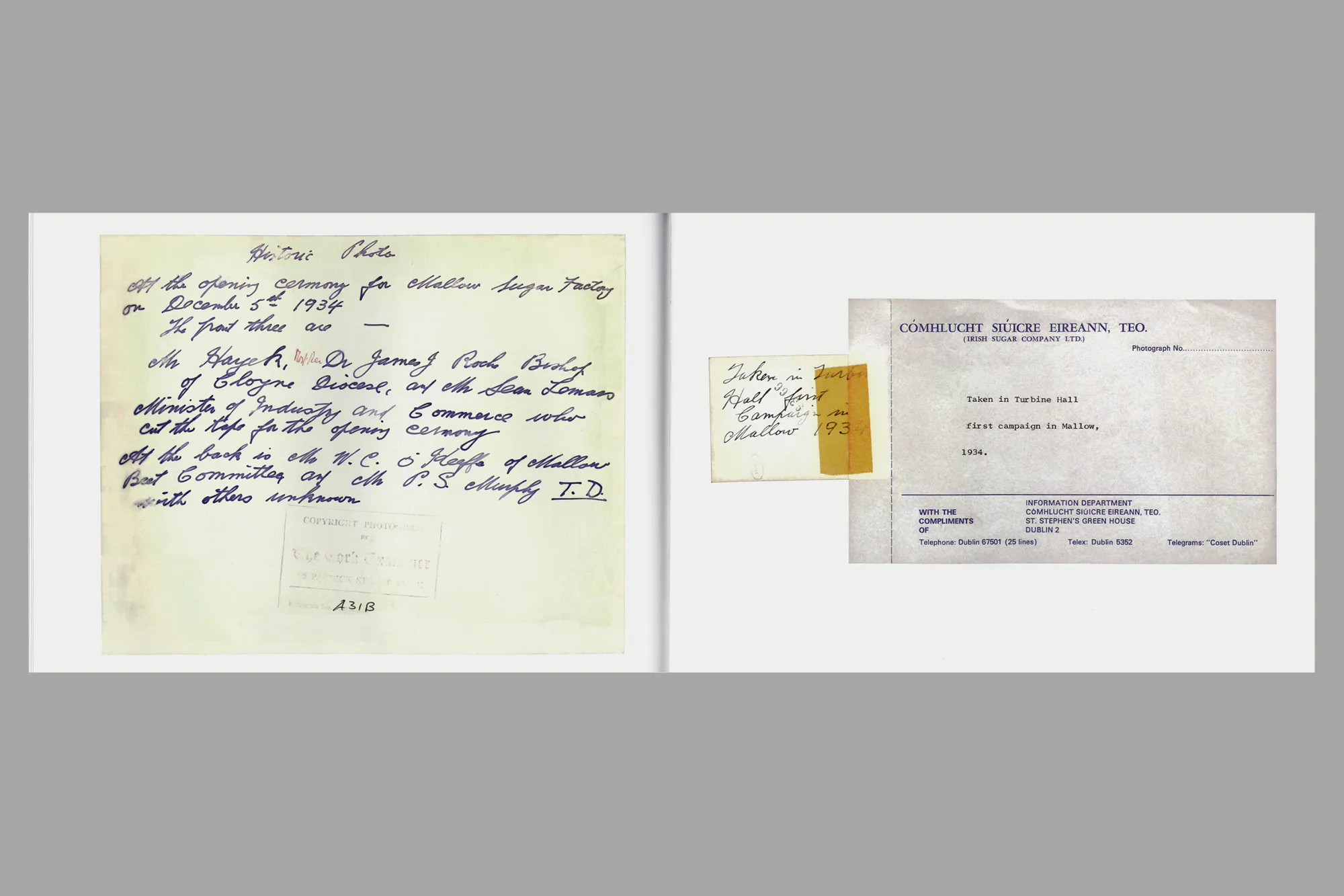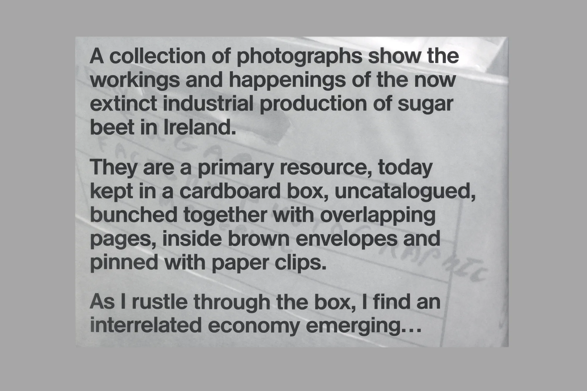Nollaig Molloy’s A Confection of Photographs investigates the assembly of archives and Ireland’s working class histories. Almost one hundred images, each scanned and reproduced from a single storage box found in Carlow County Library, depict the now defunct production of sugar beet. This resource, found by Molloy bunched together inside brown envelopes and pinned with paper clips, encompass moments from the 1920s to early 2000s. Images range from the harvesting of crops, infrastructure development and lives of workers. With an essay by the artist and the incorporation of handwritten notes found alongside these unearthed photographs, a beguiling number of haunting relationships emerge beyond the cogs of industry.