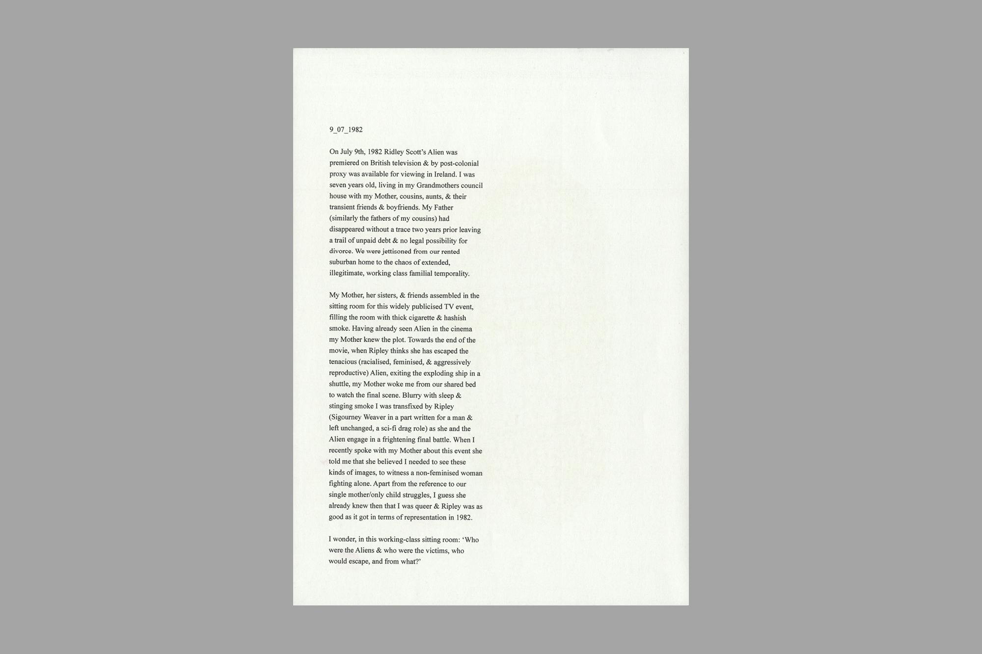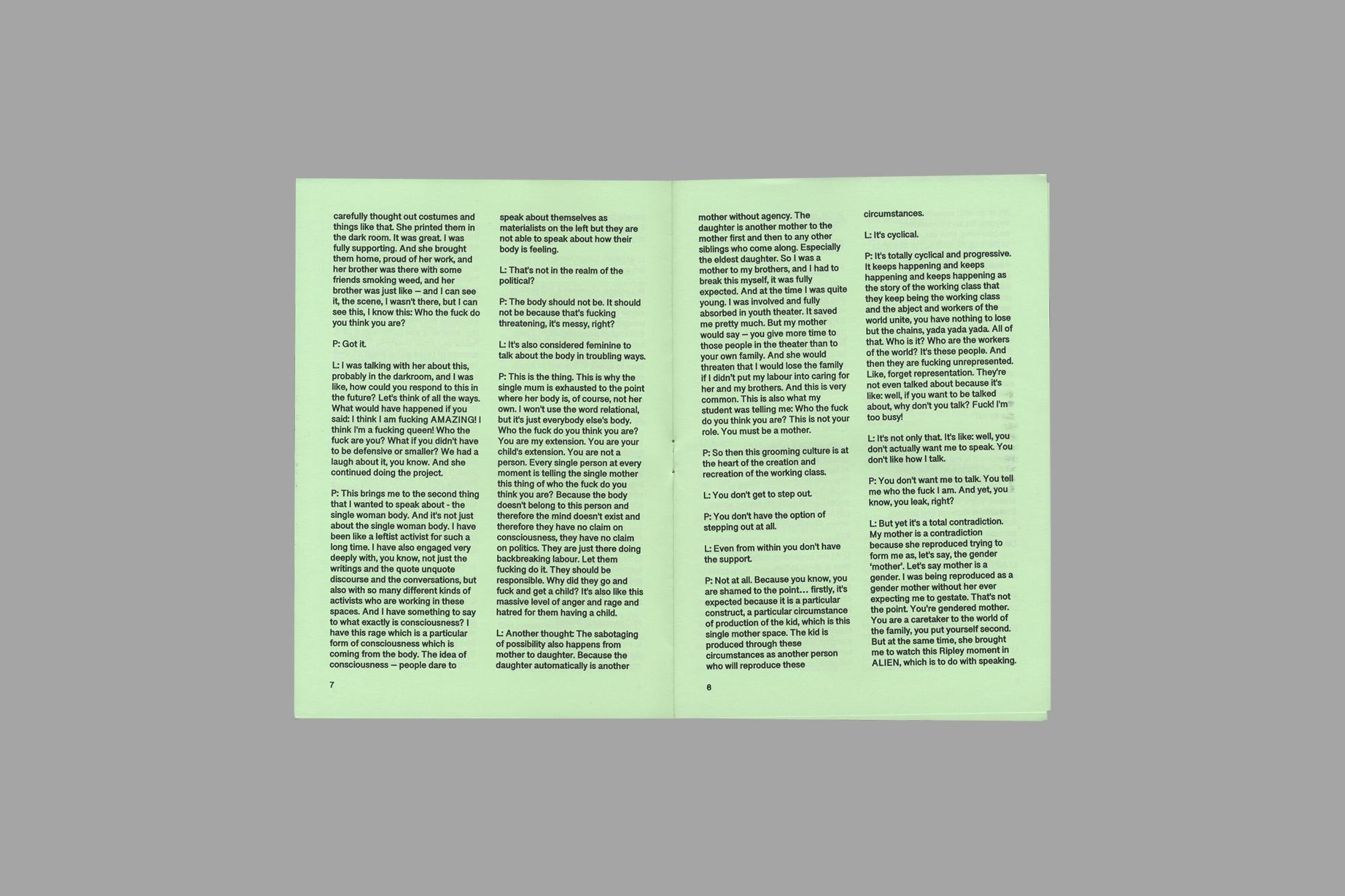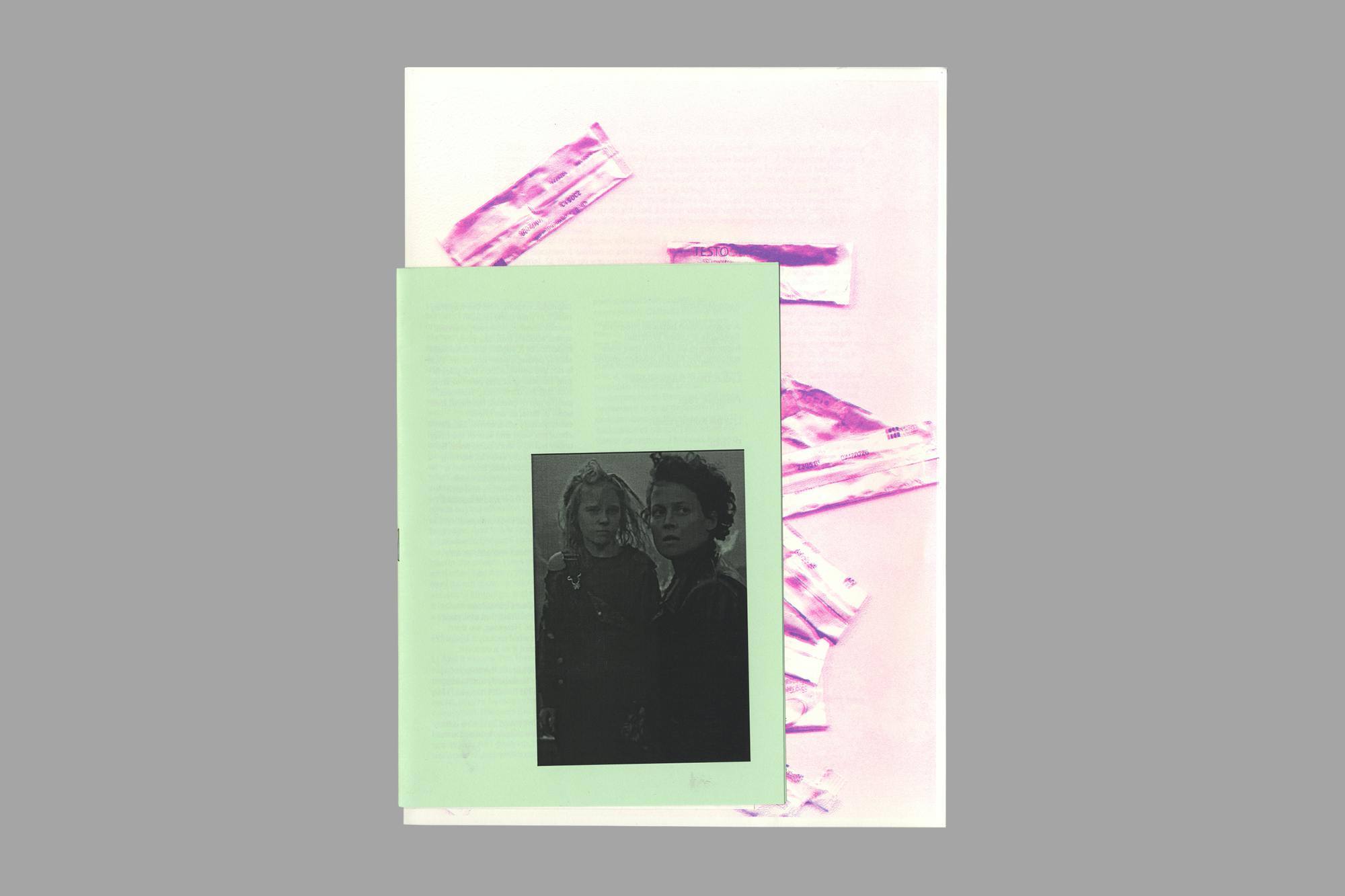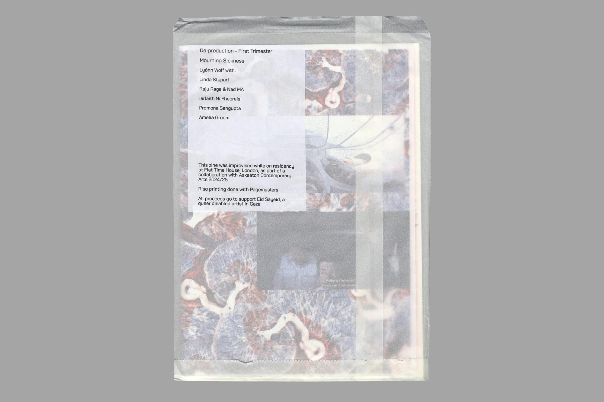 De-production – First Trimester Mourning Sickness is a limited edition zine crafted as part of Wolf’s 2024 residency at Flat Time House, London. As a way of sharing work in progress, Wolf invited collaborators Iarlaith Ní Fheorais, Linda Stupart and Raju Rage to respond to bring states of transformation, popular science fiction and family abolition into what the artist describes as a ‘weird communion’. The zine also includes a contribution from artist, academic, activist, and curator Promona Sengupta.